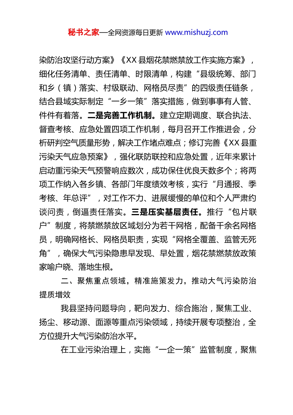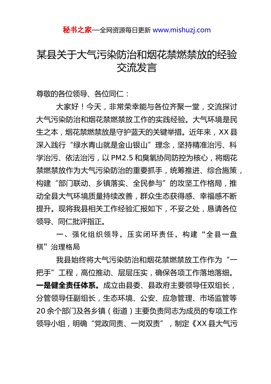 秘书之家—全网资源每日更新 www.mishuzj.com某县关于大气污染防治和烟花禁燃禁放的经验交流发言尊敬的各位领导、各位同仁:大家好!今天,非常荣幸能与各位齐聚一堂,交流探讨大气污染防治和烟花禁燃禁放工作的实践经验。大气环境是民生之本,烟花禁燃禁放是守护蓝天的关键举措。近年来,XX 县深入践行“绿水青山就是金山银山”理念,坚持精准治污、科学治污、依法治污,以 PM2.5 和臭氧协同防控为核心,将烟花禁燃禁放作为大气污染防治的重要抓手,统筹推进、综合施策,构建“部门联动、乡镇落实、全民参与”的攻坚工作格局,推动全县大气环境质量持续改善,群众生态获得感、幸福感不断提升。现将我县相关工作经验汇报如下,不妥之处,恳请各位领导、同仁批评指正。一、强化组织领导,压实闭环责任,构建“全县一盘棋”治理格局我县始终将大气污染防治和烟花禁燃禁放工作作为“一把手”工程,高位推动、层层压实,确保各项工作落地落细。一是健全责任体系。成立由县委、县政府主要领导任双组长,分管领导任副组长,生态环境、公安、应急管理、市场监管等20 余个部门及各乡镇(街道)主要负责同志为成员的专项工作领导小组,明确“党政同责、一岗双责”,制定《XX 县大气污秘书之家—全网资源每日更新 www.mishuzj.com染防治攻坚行动方案》《XX 县烟花禁燃禁放工作实施方案》,细化任务清单、责任清单、时限清单,构建“县级统筹、部门和乡(镇)落实、村级联动、网格员尽责”的四级责任链条,结合县域实际制定“一乡一策”落实措施,做到事事有人管、件件有着落。二是完善工作机制。建立定期调度、联合执法、督查考核、应急处置四项工作机制,每月召开工作推进会,分析研判空气质量形势,解决工作堵点难点;修订完善《XX 县重污染天气应急预案》,强化联防联控和应急处置,近年来累计启动重污染天气预警响应数次,成功保住优良天数多个;将两项工作纳入各乡镇、各部门年度绩效考核,实行“月通报、季考核、年总评”,对工作不力、进展缓慢的单位和个人严肃约谈问责,倒逼责任落实。三是压实基层责任。推行“包片联户”制度,将禁燃禁放区域划分为若干网格,配备千余名网格员,明确网格长、网格员职责,实现“网格全覆盖、监管无死角”,确保大气污染隐患早发现、早处置,烟花禁燃禁放政策家喻户晓、落地生根。二、聚焦重点领域,精准施策发力,推动大气污染防治提质增效我县坚持问题导向,靶向发力、综合施治,聚焦工业、扬尘、移动源、面源等重点污染领域,持续开展专项整治,全方位提升大气污染防治水平。在工业污染治理上,实施“一企一策”监管制度,聚焦秘书之家—全网资源每日更新 www.mishuzj.com林木加工、新型建材等重点行业,推进企业超低排放改造,督促 30 余家重点涉气企业建成废气收集处理系统,8 家高污染企业实现脱硫脱硝全覆盖,多家规上涉气企业安装污染源自动监控设备并与生态环境部门联网,实现实时监控、精准管控。严厉打击企业偷排偷放、超标排放等违法行为,开展工业污染专项检查百余次,查处违法案件数十起,形成有力震慑,推动工业企业绿色转型发展。在扬尘污染管控上,严格落实建筑工地“六个 100%”防控要求,督促所有在建工地安装扬尘在线监测系统和喷淋设施,实行湿法作业、密闭运输;引入第三方保洁队伍,在县城建成区主干道实行“保湿”作业,增加洒水、清扫频次,减少道路扬尘污染;加强矿山、砂石场、渣土车管控,严厉查处渣土车未密闭运输、沿途抛洒等行为,规范矿山开采和砂石加工企业生产经营,从源头遏制扬尘污染。在移动源污染治理上,持续加大高排放车辆淘汰力度,积极推广新能源车辆,实现公交车及出租车全部油改电,全县新能源汽车保有量超过 4000 辆;强化油品全链条监管,深入加油站、农资门市部等开展专项检查,严厉打击非标油品销售行为;加强柴油货车路检路查,累计检测柴油货车百余辆次,对尾气超标车辆依法处罚,持续改善移动源污染状况。在面源污染治理上,构建秸秆禁烧“县—乡—村”三级网格化监管体系,借助无人机等设备,实行“白+黑”“晴+秘书之家—全网资源每日更新 www.mishuzj.com雨”不间断巡查,...