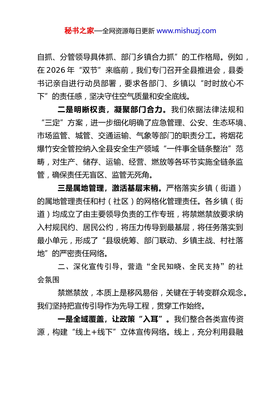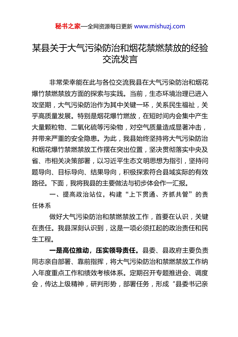 秘书之家—全网资源每日更新 www.mishuzj.com某县关于大气污染防治和烟花禁燃禁放的经验交流发言非常荣幸能在此与各位交流我县在大气污染防治和烟花爆竹禁燃禁放方面的探索与实践。当前,生态环境治理已进入攻坚期,大气污染防治作为其中关键一环,关系民生福祉,关乎高质量发展。特别是烟花爆竹燃放,在短时间内会集中产生大量颗粒物、二氧化硫等污染物,对空气质量造成显著冲击,并带来严重的安全隐患。为此,我县始终坚持将大气污染防治和烟花爆竹禁燃禁放工作摆在突出位置,坚决贯彻落实中央及省、市相关决策部署,以习近平生态文明思想为指引,坚持问题导向、目标导向、结果导向,积极探索符合县域实际的有效路径。下面,我将我县的主要做法与初步体会作一汇报。一、提高政治站位,构建“上下贯通、齐抓共管”的责任体系做好大气污染防治和禁燃禁放工作,首要在认识,关键在责任。我县深刻认识到,这是一项必须扛起的政治责任和民生工程。一是高位推动,压实领导责任。县委、县政府主要负责同志亲自部署、靠前指挥,将大气污染防治和禁燃禁放工作纳入年度重点工作和绩效考核体系。定期召开专题推进会、调度会,传达上级精神,研判形势,部署任务,形成“县委书记亲秘书之家—全网资源每日更新 www.mishuzj.com自抓、分管领导具体抓、部门乡镇合力抓”的工作格局。例如,在 2026 年“双节”来临前,我们专门召开全县推进会,县委书记亲自进行动员部署,要求各部门、乡镇以“时时放心不下”的责任感,坚决守住空气质量和安全底线。二是明晰权责,凝聚部门合力。我们依据法律法规和“三定”方案,进一步细化明确了应急管理、公安、生态环境、市场监管、城管、交通运输、气象等部门的职责分工。将烟花爆竹安全管控纳入全县安全生产领域“一件事全链条整治”范畴,对生产、储存、运输、经营、燃放等各环节实施全链条监管,确保责任无盲区、监管无死角。三是属地管理,激活基层末梢。严格落实乡镇(街道)的属地管理责任和村(社区)的网格化管理责任。各乡镇(街道)均成立了由主要领导负责的工作专班,将禁燃禁放要求纳入村规民约、居民公约,将压力传导到最基层,将任务落实到最小单元,形成了“县级统筹、部门联动、乡镇主战、村社落地”的严密责任网络。二、深化宣传引导,营造“全民知晓、全民支持”的社会氛围禁燃禁放,本质上是移风易俗,关键在于转变群众观念。我们坚持把宣传引导作为先导工程,贯穿工作始终。一是全域覆盖,让政策“入耳”。我们整合各类宣传资源,构建“线上+线下”立体宣传网络。线上,充分利用县融秘书之家—全网资源每日更新 www.mishuzj.com媒体中心、政府门户网站、微信公众号等平台,发布权威公告,解读政策规定,科普燃放危害。线下,组织流动宣传车、村级“大喇叭”、城管巡逻车进行巡回广播;在主要路口、社区公告栏、商场超市等人流密集场所悬挂横幅、张贴通告,确保宣传无死角、全覆盖。二是精准滴灌,让理念“入心”。针对不同群体开展差异化、精准化宣传。面向学生群体,教育部门组织开展“小手拉大手”主题活动,引导学生成为家庭禁放的小小监督员和宣传员。面向餐饮经营者、红白理事会成员、乡贤代表等重点人群,我们召开座谈会、恳谈会,邀请派出所民警以案说法,用“身边事”教育“身边人”。引导餐饮经营者做好“行业示范者”,红白理事会成员当好“文明引导员”,乡贤代表发挥“威望带动者”作用,用鲜花、电子鞭炮等绿色方式替代传统烟花爆竹。三是疏堵结合,让新风“入行”。在严格禁放的同时,我们注重满足群众在节庆、婚丧嫁娶时的情感表达需求。积极倡导文明、绿色、安全的庆祝方式,推广电子鞭炮、喜庆音乐、悬挂灯笼等替代品。鼓励村(社区)在传统节日组织集体庆祝活动,逐步引导群众转变观念,让文明新风深入人心。三、强化执法监管,保持“零容忍、强震慑”的高压态势宣传引导是基础,严格执法是保障。我们坚持依法治理,秘书之家—全网资源每日更新 www.mishuzj.com以最严格的监管、最严厉的处罚,坚决打击各类违法违规行为。一是聚焦源头,严控流通环节。应急管理、市场监管等部门加强对烟花爆竹批发企业和零售网...