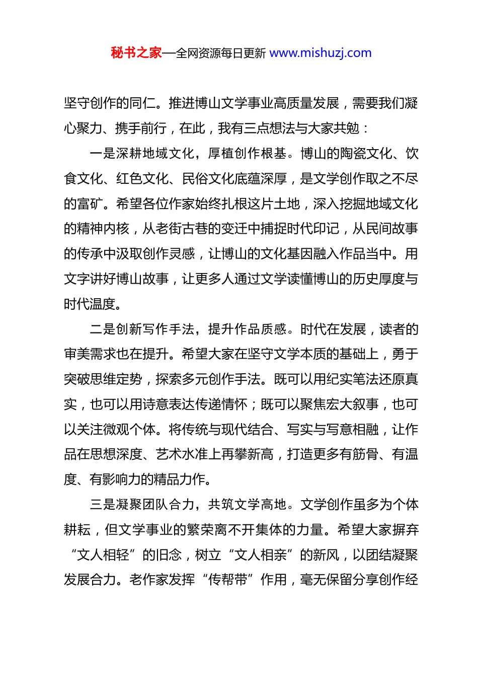 秘书之家—全网资源每日更新 www.mishuzj.com淄博市文学创作研究中心主任田裕娇在王秀东新书《博山记忆·岁月沉香》新书发布会上的讲话尊敬的各位领导,博山的作家朋友们:大家上午好!很荣幸在冬至阳生的时节,以文学的名义回到家乡博山,与大家共同见证王秀东老师大作《博山记忆岁月沉香》的新书发布会。首先,我谨代表淄博市作家协会,向王老师致以热烈的祝贺!也向参加发布会的各位文学同仁,以及长期关心支持淄博文学事业发展的朋友们,表示最诚挚的感谢!王秀东老师深耕博山这片沃土多年,以细腻笔触打捞岁月碎片,用真挚情感串联故土记忆,将博山的陶瓷风华、饮食韵味、街巷烟火、人文底蕴凝于笔端,汇成《博山记忆岁月沉香》这部佳作。书中的每一篇文字,都是对地域文化的深情守望;每一个故事,都是对家乡的赤子告白。它不仅为读者打开了一扇读懂博山的窗口,更以文学之名留存了珍贵的地方记忆,展现了基层作家扎根故土、书写家园的责任与担当。这份对文学的执着、对家乡的热爱,值得每一位创作者学习。博山自古文脉昌盛,文学土壤肥沃,从来不缺乏热爱文学秘书之家—全网资源每日更新 www.mishuzj.com坚守创作的同仁。推进博山文学事业高质量发展,需要我们凝心聚力、携手前行,在此,我有三点想法与大家共勉:一是深耕地域文化,厚植创作根基。博山的陶瓷文化、饮食文化、红色文化、民俗文化底蕴深厚,是文学创作取之不尽的富矿。希望各位作家始终扎根这片土地,深入挖掘地域文化的精神内核,从老街古巷的变迁中捕捉时代印记,从民间故事的传承中汲取创作灵感,让博山的文化基因融入作品当中。用文字讲好博山故事,让更多人通过文学读懂博山的历史厚度与时代温度。二是创新写作手法,提升作品质感。时代在发展,读者的审美需求也在提升。希望大家在坚守文学本质的基础上,勇于突破思维定势,探索多元创作手法。既可以用纪实笔法还原真实,也可以用诗意表达传递情怀;既可以聚焦宏大叙事,也可以关注微观个体。将传统与现代结合、写实与写意相融,让作品在思想深度、艺术水准上再攀新高,打造更多有筋骨、有温度、有影响力的精品力作。三是凝聚团队合力,共筑文学高地。文学创作虽多为个体耕耘,但文学事业的繁荣离不开集体的力量。希望大家摒弃“文人相轻”的旧念,树立“文人相亲”的新风,以团结凝聚发展合力。老作家发挥“传帮带”作用,毫无保留分享创作经秘书之家—全网资源每日更新 www.mishuzj.com验;青年作家虚心求教、积极进取,在交流中成长。各个文学社团资源共享、团结协作,多开展创作研讨、作品互评、采风联谊等活动,让大家在互帮互助中共同进步,让博山作家队伍成为一支有凝聚力、有战斗力的集体,形成“一人出彩、众人添彩”的良好氛围。10 月,市委主要领导点题召开了全市作协工作座谈会,为我们文学事业的发展提出了新的要求,鼓励全市写作者创作出更多彰显城市品质的精品力作,并要求加强全市作协系统自身建设。作为市级文学组织,市作协始终是基层作家的坚强后盾,我们也一直致力于打造有温度、有归属感的“作家之家”。接下来我们将重点做好这方面工作:一是搭建展示平台,积极推荐优秀作家作品参加各类文学赛事、发表于各级刊物,组织专题采风、作品研讨等活动,让淄博作家的声音被更多人听见;二是强化创作扶持,针对基层作家创作困惑,邀请知名作家、编辑开展讲座辅导,提供创作信息、资源对接等服务,助力大家提升创作水平;三是优化服务,积极反映作家诉求,维护作家合法权益,让每一位坚守创作的作家都能感受到组织的温暖,安心创作、潜心耕耘。冬至过后,春归有期;文学之路,众行致远。希望我们以这次共同举办新书发布会为契机,以地域文化为根,以团结协秘书之家—全网资源每日更新 www.mishuzj.com作为桥,让更多优秀文学作品从博山这片沃土破土而出,为淄博经济社会发展贡献一份蓬勃的文学力量!最后,再次祝贺王秀东老师!也祝愿博山文学事业蒸蒸日上、硕果累累!祝愿各位领导、各位朋友冬至安康、万事顺意!