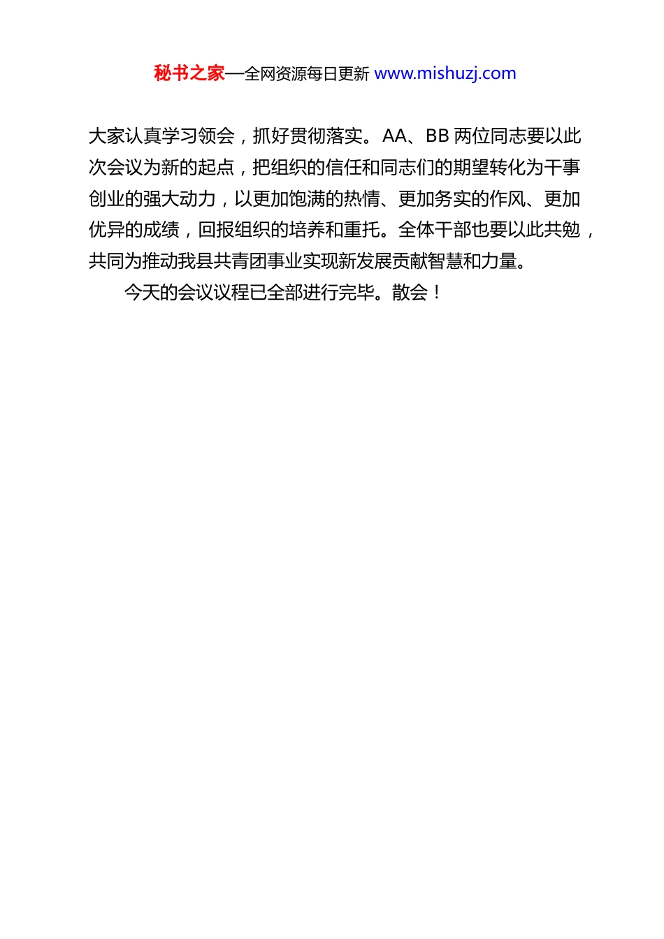秘书之家—全网资源每日更新 www.mishuzj.com团县委副书记在新提任干部表态会上的主持词同志们:现在开会。根据安排,今天我们在这里召开团县委新提任干部表态会议。本次会议的主要议程有两项:一是请新提拔的 AA、BB 同志依次作表态发言;二是请团县委书记 XX 同志讲话。首先,进行会议第一项议程,请新提拔的 AA 同志作表态发言。大家欢迎。(AA 同志发言毕)下面,请新提拔的 BB 同志作表态发言。大家欢迎。(BB 同志发言毕)刚才,AA、BB 两位同志分别作了表态发言。发言态度端正、认识到位,展现了新岗位上的新思考和新决心。希望两位同志牢记今天的承诺,尽快转换角色,履职尽责,在新起点上展现新作为。下面,进行会议第二项议程,请团县委书记 XX 同志讲话。大家欢迎。(书记讲话毕)同志们,刚才 XX 书记的讲话,既对两位新提任同志表示了祝贺、提出了殷切希望和明确要求,也对我们全体干部进一步做好共青团工作、加强自身建设具有重要的指导意义。希望秘书之家—全网资源每日更新 www.mishuzj.com大家认真学习领会,抓好贯彻落实。AA、BB 两位同志要以此次会议为新的起点,把组织的信任和同志们的期望转化为干事创业的强大动力,以更加饱满的热情、更加务实的作风、更加优异的成绩,回报组织的培养和重托。全体干部也要以此共勉,共同为推动我县共青团事业实现新发展贡献智慧和力量。今天的会议议程已全部进行完毕。散会!