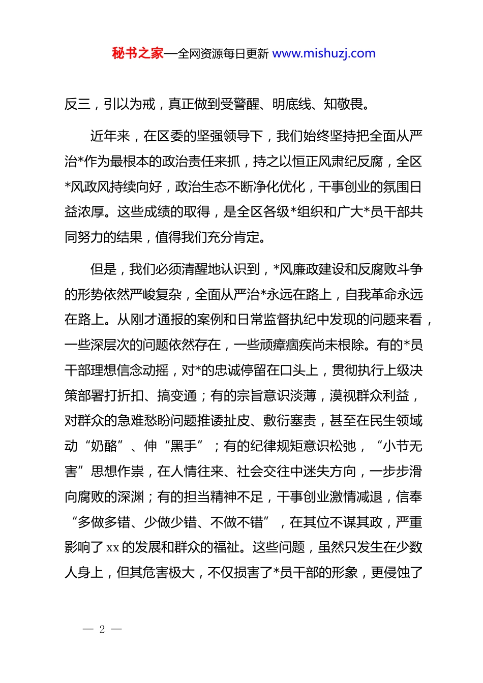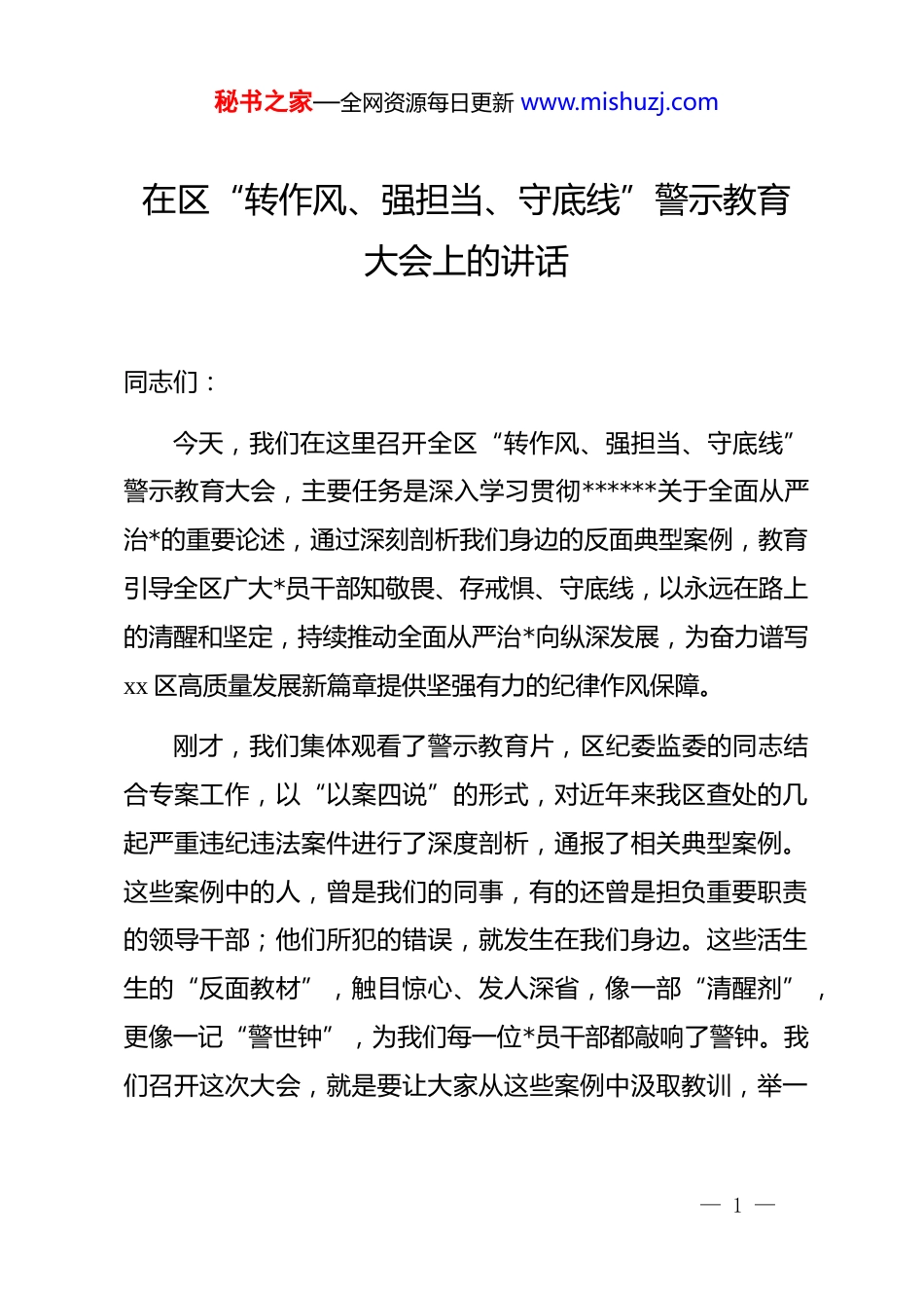 秘书之家—全网资源每日更新 www.mishuzj.com在区“转作风、强担当、守底线”警示教育大会上的讲话同志们:今天,我们在这里召开全区“转作风、强担当、守底线”警示教育大会,主要任务是深入学习贯彻******关于全面从严治*的重要论述,通过深刻剖析我们身边的反面典型案例,教育引导全区广大*员干部知敬畏、存戒惧、守底线,以永远在路上的清醒和坚定,持续推动全面从严治*向纵深发展,为奋力谱写xx 区高质量发展新篇章提供坚强有力的纪律作风保障。刚才,我们集体观看了警示教育片,区纪委监委的同志结合专案工作,以“以案四说”的形式,对近年来我区查处的几起严重违纪违法案件进行了深度剖析,通报了相关典型案例。这些案例中的人,曾是我们的同事,有的还曾是担负重要职责的领导干部;他们所犯的错误,就发生在我们身边。这些活生生的“反面教材”,触目惊心、发人深省,像一部“清醒剂”,更像一记“警世钟”,为我们每一位*员干部都敲响了警钟。我们召开这次大会,就是要让大家从这些案例中汲取教训,举一— 1 —秘书之家—全网资源每日更新 www.mishuzj.com反三,引以为戒,真正做到受警醒、明底线、知敬畏。近年来,在区委的坚强领导下,我们始终坚持把全面从严治*作为最根本的政治责任来抓,持之以恒正风肃纪反腐,全区*风政风持续向好,政治生态不断净化优化,干事创业的氛围日益浓厚。这些成绩的取得,是全区各级*组织和广大*员干部共同努力的结果,值得我们充分肯定。但是,我们必须清醒地认识到,*风廉政建设和反腐败斗争的形势依然严峻复杂,全面从严治*永远在路上,自我革命永远在路上。从刚才通报的案例和日常监督执纪中发现的问题来看,一些深层次的问题依然存在,一些顽瘴痼疾尚未根除。有的*员干部理想信念动摇,对*的忠诚停留在口头上,贯彻执行上级决策部署打折扣、搞变通;有的宗旨意识淡薄,漠视群众利益,对群众的急难愁盼问题推诿扯皮、敷衍塞责,甚至在民生领域动“奶酪”、伸“黑手”;有的纪律规矩意识松弛,“小节无害”思想作祟,在人情往来、社会交往中迷失方向,一步步滑向腐败的深渊;有的担当精神不足,干事创业激情减退,信奉“多做多错、少做少错、不做不错”,在其位不谋其政,严重影响了 xx 的发展和群众的福祉。这些问题,虽然只发生在少数人身上,但其危害极大,不仅损害了*员干部的形象,更侵蚀了— 2 —秘书之家—全网资源每日更新 www.mishuzj.com*的执政根基,败坏了 xx 的政治生态。我们必须始终保持“赶考”的清醒,保持对“腐蚀”、“围猎”的警觉,深刻认识到,全面从常治*绝不是一句空话,反腐败斗争也绝不会有任何“喘口气、歇歇脚”的念头。全区各级*组织和每一位*员干部,都必须把思想和行动统一到中央、市委和区委的决策部署上来,以案为鉴,警钟长鸣,以刀刃向内的勇气和刮骨疗毒的决心,坚决打赢这场输不起也决不能输的斗争。下面,我结合今天的会议主题和当前工作实际,讲四点意见。一、坚守赤诚之心,在对*忠诚上作表率,堂堂正正为官对*忠诚,是共产*人首要的政治品质。无数案例表明,*员干部出问题,根子都在于理想信念这个“总开关”出了问题,导致政治上迷航、思想上蜕变。作为*的干部,我们必须把对*绝对忠诚作为立身之本、为官之要,始终做到心中有*、心中有民、心中有责、心中有戒。一要筑牢思想根基,补足精神之“钙”。思想上的滑坡是最危险的滑坡。一旦理想信念动摇,精神堤坝就会崩溃。全区广大*员干部要自觉把学习贯彻**************思想作为首要政— 3 —秘书之家—全网资源每日更新 www.mishuzj.com治任务,坚持读原著、学原文、悟原理,深刻领会其核心要义、精神实质、丰富内涵和实践要求,真正做到学思用贯通、知信行统一。要通过学习,深刻感悟马克思主义的真理力量和实践力量,坚定对共产主义的信仰、对中国特色社会主义的信念,不断提高政治判断力、政治领悟力、政治执行力,从思想深处解决好“我是谁、为了谁、依靠谁”的根本问题,筑牢拒腐防变的思想道德防线。二要践行“两个维护”,确保政令畅通。对*忠诚不是抽象的,而是具体的。衡量一名*员干部是否忠诚,最直接、最现实的检...