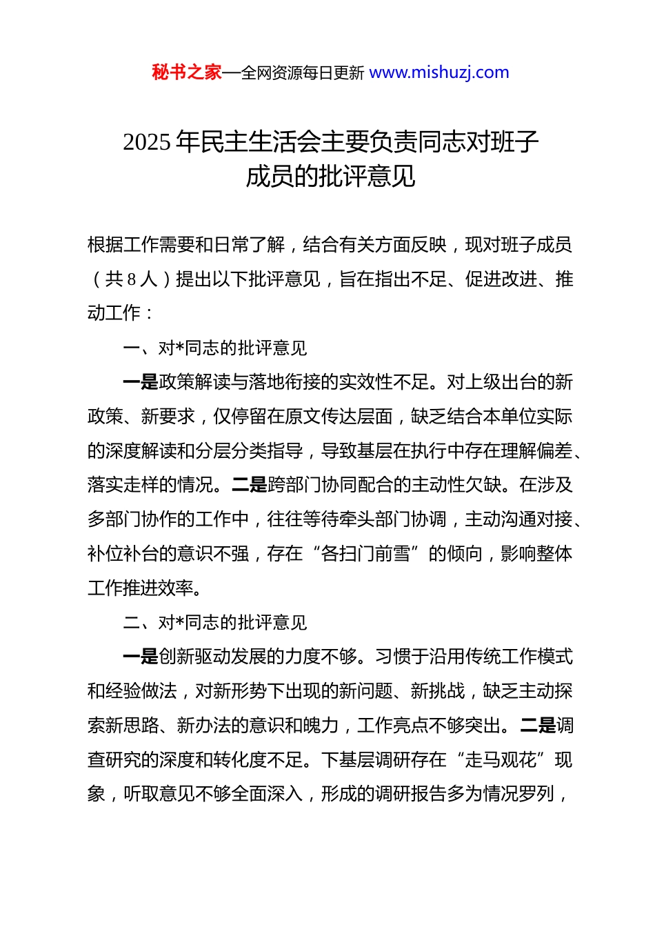 秘书之家—全网资源每日更新 www.mishuzj.com2025 年民主生活会主要负责同志对班子成员的批评意见 根据工作需要和日常了解,结合有关方面反映,现对班子成员(共 8 人)提出以下批评意见,旨在指出不足、促进改进、推动工作:一、对*同志的批评意见一是政策解读与落地衔接的实效性不足。对上级出台的新政策、新要求,仅停留在原文传达层面,缺乏结合本单位实际的深度解读和分层分类指导,导致基层在执行中存在理解偏差、落实走样的情况。二是跨部门协同配合的主动性欠缺。在涉及多部门协作的工作中,往往等待牵头部门协调,主动沟通对接、补位补台的意识不强,存在“各扫门前雪”的倾向,影响整体工作推进效率。二、对*同志的批评意见一是创新驱动发展的力度不够。习惯于沿用传统工作模式和经验做法,对新形势下出现的新问题、新挑战,缺乏主动探索新思路、新办法的意识和魄力,工作亮点不够突出。二是调查研究的深度和转化度不足。下基层调研存在“走马观花”现象,听取意见不够全面深入,形成的调研报告多为情况罗列,秘书之家—全网资源每日更新 www.mishuzj.com提出的对策建议针对性、可操作性不强,未能有效转化为解决问题的具体举措。三、对*同志的批评意见一是风险预判和防范能力有待提升。对分管领域可能存在的潜在风险缺乏前瞻性思考和系统性排查,往往是问题出现后才被动应对,事前预警、事中管控的机制不够健全。二是工作标准不够严格。在审核把关工作中,有时存在“差不多”“过得去”的思想,对细节问题关注不够,导致部分工作成果质量不高,出现小疏漏、小差错。四、对*同志的批评意见一是干部教育培训的针对性不强。制定培训计划时,未能充分结合干部岗位需求和能力短板,培训内容与实际工作结合不够紧密,存在“大水漫灌”现象,培训效果不佳。二是对外沟通协调的技巧和力度不足。在与上级单位、兄弟地市对接工作时,有时未能准确把握沟通重点,争取支持的主动性和有效性不够,未能为单位工作开展营造良好外部环境。五、对*同志的批评意见一是工作统筹谋划的科学性不足。面对多项并发工作任务时,缺乏合理的优先级排序和时间分配,有时出现“眉毛胡子一把抓”的情况,导致重点工作推进缓慢,整体工作节奏把控秘书之家—全网资源每日更新 www.mishuzj.com不当。二是勤俭节约意识有待强化。在办公用品采购、会议活动组织等工作中,对成本控制不够严格,存在资源浪费现象,未能做到精打细算、厉行节约。六、对*同志的批评意见一是推动工作落实的韧劲不足。对部署的工作任务,跟踪问效不够持续有力,遇到阻力或困难时容易产生畏难情绪,缺乏一抓到底的决心和毅力,部分工作存在“虎头蛇尾”的情况。二是业务知识更新不及时。对分管领域的新理论、新技术、新规范学习不够主动,知识储备未能跟上行业发展步伐,影响了决策的科学性和工作指导的专业性。七、对*同志的批评意见一是服务基层的意识和效能有待提升。在接待基层咨询、办理基层事务时,有时态度不够热情耐心,流程告知不够清晰,未能真正做到急基层之所急、解基层之所难。二是团队协作的凝聚力不强。在团队工作中,缺乏主动分享经验、帮助同事的意识,与其他成员沟通交流不够充分,未能形成工作合力,影响了团队整体战斗力。八、对*同志的批评意见一是破解历史遗留问题的担当不够。面对分管领域长期积累的棘手问题,存在求稳怕乱思想,缺乏主动攻坚的勇气和魄秘书之家—全网资源每日更新 www.mishuzj.com力,习惯于维持现状,未能采取有效措施推动问题实质性解决。二是工作宣传和成果展示的力度不足。对本部门取得的工作成效、典型案例挖掘和宣传不够,未能充分展现工作价值和部门形象,在争取各方理解和支持方面存在短板。