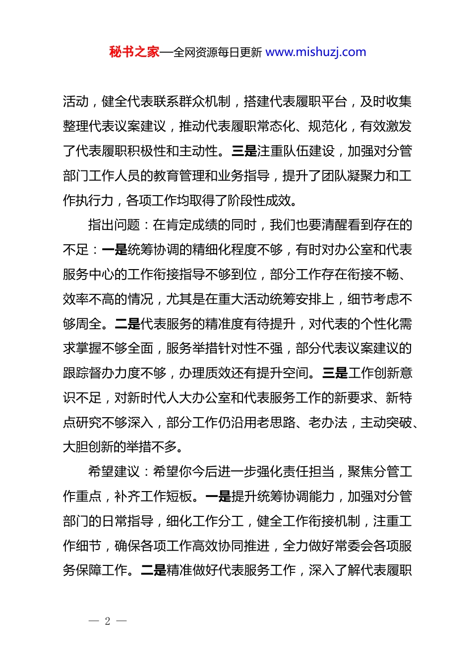 秘书之家—全网资源每日更新 www.mishuzj.comxx 县人大常委会主任在 2025 年民主生活会前与各位副主任的谈心谈话提纲各位副主任:按照县委关于召开 2025 年度民主生活会的统一部署和要求,今天我们开展会前谈心谈话,主要目的是深入学习贯彻**************思想和*的二十大及二十届历次全会精神,紧扣民主生活会主题,坦诚交流思想、沟通工作生活情况,既肯定成绩、总结经验,也指出不足、明确方向,帮助大家进一步统一思想、凝聚共识、改进工作,为开好高质量的民主生活会打牢思想基础。下面,我结合各位分管工作,逐一和大家谈心谈话。一、与人大副主任 a(分管办公室和代表服务中心)谈心谈话肯定成绩:2025 年,你始终坚守岗位、履职尽责,分管的办公室和代表服务中心工作成效显著。一是办公室统筹协调有力,牵头完善机关各项规章制度,规范公文处理、会议组织、后勤保障等工作流程,精准对接县委、人大、政府及各部门,有效保障了县人大常委会各项会议、调研、监督等活动高效有序开展,为常委会依法履职筑牢了服务根基。二是代表服务中心工作扎实,牵头组织代表培训、专题调研、集中视察等履职— 1 —秘书之家—全网资源每日更新 www.mishuzj.com活动,健全代表联系群众机制,搭建代表履职平台,及时收集整理代表议案建议,推动代表履职常态化、规范化,有效激发了代表履职积极性和主动性。三是注重队伍建设,加强对分管部门工作人员的教育管理和业务指导,提升了团队凝聚力和工作执行力,各项工作均取得了阶段性成效。指出问题:在肯定成绩的同时,我们也要清醒看到存在的不足:一是统筹协调的精细化程度不够,有时对办公室和代表服务中心的工作衔接指导不够到位,部分工作存在衔接不畅、效率不高的情况,尤其是在重大活动统筹安排上,细节考虑不够周全。二是代表服务的精准度有待提升,对代表的个性化需求掌握不够全面,服务举措针对性不强,部分代表议案建议的跟踪督办力度不够,办理质效还有提升空间。三是工作创新意识不足,对新时代人大办公室和代表服务工作的新要求、新特点研究不够深入,部分工作仍沿用老思路、老办法,主动突破、大胆创新的举措不多。希望建议:希望你今后进一步强化责任担当,聚焦分管工作重点,补齐工作短板。一是提升统筹协调能力,加强对分管部门的日常指导,细化工作分工,健全工作衔接机制,注重工作细节,确保各项工作高效协同推进,全力做好常委会各项服务保障工作。二是精准做好代表服务工作,深入了解代表履职— 2 —秘书之家—全网资源每日更新 www.mishuzj.com需求,创新服务方式、丰富服务内容,加大代表议案建议跟踪督办力度,健全督办机制,推动建议办理落地见效,切实提升代表履职获得感。三是增强创新意识,主动学习借鉴先进地区经验,结合我县人大工作实际,探索办公室管理和代表服务工作的新思路、新举措,不断提升工作质效,为常委会依法履职提供更有力的支撑。二、与人大副主任 b(分管法制工委)谈心谈话肯定成绩:2025 年,你立足法制工委分管职责,坚守法治底线,主动担当作为,各项工作成效突出。一是法治监督工作扎实有效,牵头开展法治政府建设监督、执法检查、规范性文件备案审查等工作,重点围绕群众关心的热点难点问题,加大对行政执法部门的监督力度,推动依法行政、公正司法,切实维护了宪法法律权威。二是法治宣传教育深入推进,牵头组织开展宪法宣传周、法治讲座等活动,创新宣传方式,拓宽宣传渠道,提升了干部群众的法治意识和法治素养,营造了良好的法治氛围。三是工委自身建设不断加强,注重加强法制工委工作人员的业务培训,提升专业能力,规范工作流程,确保各项工作有序开展、落到实处。指出问题:对照新时代人大法治工作要求,仍存在一些不足:一是执法检查的深度和力度不够,有时存在“重检查、轻— 3 —秘书之家—全网资源每日更新 www.mishuzj.com整改”的情况,对检查中发现的问题,跟踪督办不够到位,部分问题整改不彻底、不长效。二是规范性文件备案审查工作精准度有待提升,对备案文件的合法性、合理性审查不够细致,审查方式较为单一,对一些隐性问题发现不够及时,审查质效还...