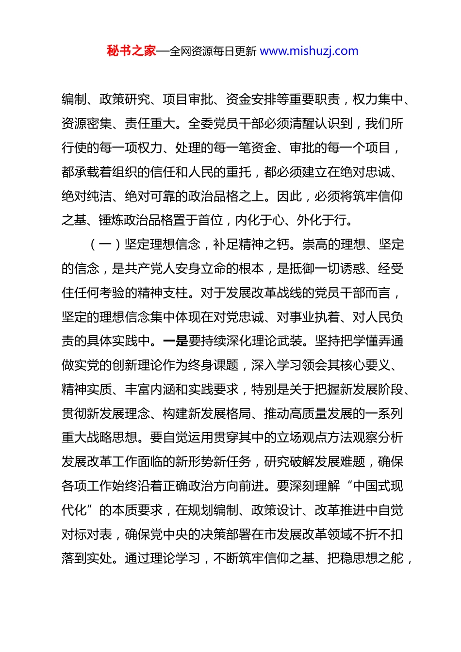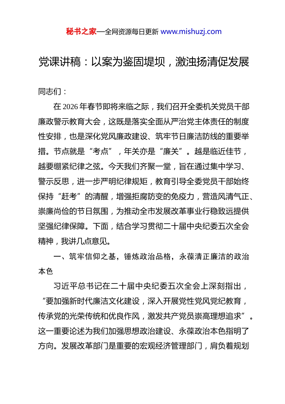 秘书之家—全网资源每日更新 www.mishuzj.com党课讲稿:以案为鉴固堤坝,激浊扬清促发展 同志们:在 2026 年春节即将来临之际,我们召开全委机关党员干部廉政警示教育大会,这既是落实全面从严治党主体责任的制度性安排,也是深化党风廉政建设、筑牢节日廉洁防线的重要举措。节点就是“考点”,年关亦是“廉关”。越是临近佳节,越要绷紧纪律之弦。今天我们齐聚一堂,旨在通过集中学习、警示反思,进一步严明纪律规矩,教育引导全委党员干部始终保持“赶考”的清醒,增强拒腐防变的免疫力,营造风清气正、崇廉尚俭的节日氛围,为推动全市发展改革事业行稳致远提供坚强纪律保障。下面,结合学习贯彻二十届中央纪委五次全会精神,我讲几点意见。一、筑牢信仰之基,锤炼政治品格,永葆清正廉洁的政治本色习近平总书记在二十届中央纪委五次全会上深刻指出,“要加强新时代廉洁文化建设,深入开展党性党风党纪教育,传承党的光荣传统和优良作风,激发共产党员崇高理想追求”。这一重要论述为我们加强思想政治建设、永葆政治本色指明了方向。发展改革部门是重要的宏观经济管理部门,肩负着规划秘书之家—全网资源每日更新 www.mishuzj.com编制、政策研究、项目审批、资金安排等重要职责,权力集中、资源密集、责任重大。全委党员干部必须清醒认识到,我们所行使的每一项权力、处理的每一笔资金、审批的每一个项目,都承载着组织的信任和人民的重托,都必须建立在绝对忠诚、绝对纯洁、绝对可靠的政治品格之上。因此,必须将筑牢信仰之基、锤炼政治品格置于首位,内化于心、外化于行。(一)坚定理想信念,补足精神之钙。崇高的理想、坚定的信念,是共产党人安身立命的根本,是抵御一切诱惑、经受住任何考验的精神支柱。对于发展改革战线的党员干部而言,坚定的理想信念集中体现在对党忠诚、对事业执着、对人民负责的具体实践中。一是要持续深化理论武装。坚持把学懂弄通做实党的创新理论作为终身课题,深入学习领会其核心要义、精神实质、丰富内涵和实践要求,特别是关于把握新发展阶段、贯彻新发展理念、构建新发展格局、推动高质量发展的一系列重大战略思想。要自觉运用贯穿其中的立场观点方法观察分析发展改革工作面临的新形势新任务,研究破解发展难题,确保各项工作始终沿着正确政治方向前进。要深刻理解“中国式现代化”的本质要求,在规划编制、政策设计、改革推进中自觉对标对表,确保党中央的决策部署在市发展改革领域不折不扣落到实处。通过理论学习,不断筑牢信仰之基、把稳思想之舵,秘书之家—全网资源每日更新 www.mishuzj.com从思想深处解决好“总开关”问题。二是要坚守初心使命。党的初心和使命是激励我们不断前进的根本动力。发展改革工作一头连着国家大政方针,一头连着民生福祉冷暖。要始终牢记“我是谁、为了谁、依靠谁”,将满足人民日益增长的美好生活需要作为一切工作的出发点和落脚点。在谋划重大发展战略、制定重要产业政策、安排重大投资项目时,必须站稳人民立场,深入调查研究,倾听群众呼声,使各项决策更接地气、更富成效。要坚决克服形式主义、官僚主义,杜绝“形象工程”“政绩工程”,真正把好事办好、实事办实,用推动高质量发展的实际成效诠释初心使命。三是要砥砺政治忠诚。对党忠诚是共产党人首要的政治品质。要深刻认识“两个确立”的决定性意义,增强“四个意识”、坚定“四个自信”、做到“两个维护”的政治自觉、思想自觉、行动自觉。在涉及重大原则问题上必须头脑清醒、立场坚定,自觉在思想上政治上行动上同以习近平同志为核心的党中央保持高度一致。要将政治忠诚融入血脉、铸入灵魂,体现在坚决贯彻党中央决策部署的行动上,体现在履职尽责、做好本职工作的实效上,体现在党员干部的日常言行上。在项目审批、资金安排等敏感环节,更要时刻绷紧政治纪律这根弦,确保执行政策不偏向、不变通、不走样。(二)站稳人民立场,践行根本宗旨。我们党的最大政治秘书之家—全网资源每日更新 www.mishuzj.com优势是密切联系群众,党执政后的最大危险是脱离群众。市发展改革委作为服务全市经济社会发展的重要枢纽,各项工作与人民群众切身利益息...