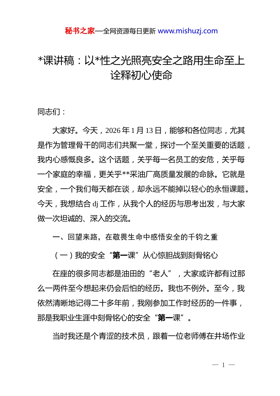 秘书之家—全网资源每日更新 www.mishuzj.com*课讲稿:以*性之光照亮安全之路用生命至上诠释初心使命同志们:大家好。今天,2026 年 1 月 13 日,能够和各位同志,尤其是作为管理骨干的同志们共聚一堂,探讨一个至关重要的话题,我内心感慨良多。这个话题,关乎每一名员工的安危,关乎每一个家庭的幸福,更关乎**采油厂高质量发展的命脉。它就是安全,一个我们每天都在谈,却永远不能掉以轻心的永恒课题。今天,我想结合 dj 工作,从我个人的经历与思考出发,与大家做一次坦诚的、深入的交流。一、回望来路,在敬畏生命中感悟安全的千钧之重(一)我的安全“第一课”从心惊胆战到刻骨铭心在座的很多同志都是油田的“老人”,大家或许都有过那么一两件至今想起来仍会后怕的经历。我也不例外。至今,我依然清晰地记得二十多年前,我刚参加工作时经历的一件事,那是我职业生涯中刻骨铭心的安全“第一课”。当时我还是个青涩的技术员,跟着一位老师傅在井场作业— 1 —秘书之家—全网资源每日更新 www.mishuzj.com那天天气闷热,老师傅看我满头大汗,就让我去休息一下,他独自去处理一个流程切换。我刚坐下没多久,就听到一声沉闷的异响,紧接着是老师傅的一声惊呼。我冲过去一看,魂都吓飞了:由于一个阀门未完全关闭到位,导致高压天然气瞬间发生泄漏,巨大的冲击力将一个工具箱推出了数米远,正好砸在老师傅刚才站立的位置。如果他反应再慢半秒,后果不堪设想。老师傅脸色煞白,靠在设备上,半天说不出一句话。那种死神擦肩而过的恐惧,那种因一次小小的疏忽险些酿成无法挽回悲剧的后怕,深深地烙印在了我的脑海里。从那天起,“安全”这两个字,对我来说不再是墙上的标语、文件里的条款,而是沉甸甸的生命之重。它让我深刻理解了,任何“我觉得可以”“大概没事”的侥幸心理,都是对生命的漠视;任何看似微不足道的违章操作,都可能是一把指向自己或同事的利刃。这份敬畏,伴随了我整个职业生涯,也成为我后来无论是在技术岗位还是管理岗位上,始终紧绷在心中的一根弦。(二)新时代的“必答题”dj 与安全为何必须深度融合随着岗位的变化,特别是走上*委书记这个岗位后,我开始从一个更宏观、更根本的层面思考安全问题。我时常反思,规— 2 —秘书之家—全网资源每日更新 www.mishuzj.com章制度不可谓不完善,技术手段不可谓不先进,为何安全事故的阴霾仍时而飘散?问题的根源究竟在哪里?答案,最终指向了“人”,指向了人的思想,指向了驱动人行为的根本力量。这时,dj 工作的独特优势就凸显了出来。进入新时代,特别是到了 2026 年的今天,推动高质量发展是所有工作的总要求。而没有安全这个“1”,后面再多的“0”都失去了意义。dj,作为国有企业的“根”与“魂”,如果不能为安全生产这个“1”保驾护航,那它就失去了最坚实的实践根基。当前,dj 工作与生产经营深度融合已成为广泛共识和普遍实践。许多兄弟单位和行业标杆都在探索如何以 dj 引领构筑发展优势,并将其作为 2026 年及未来的核心规划。那么,作为安全风险等级最高的行业之一,将 dj 工作与 hse 管理体系进行前所未有的深度融合,就不是一道“选择题”,而是一道关乎生存与发展的“必答题”。dj 抓的是思想、是灵魂、是人的精气神;hse 抓的是行为、是规范、是物的安全态。二者看似属于不同范畴,实则内在逻辑高度统一。*性要求无私奉献、对人民高度负责,这与安全工作中“生命至上、安全第一”的核心理念完全契合。一个*员的先进性,最直接、最朴素的体现,就是能否在自己的岗位上,— 3 —秘书之家—全网资源每日更新 www.mishuzj.com保护好自己和身边同志的生命安全。因此,将 dj 融入安全,绝不是简单地在安全会议上讲几句 dj 要求,也不是在*员活动中增加一些安全内容,而是要实现一种“你中有我、我中有你”的化学反应,让*组织的政治优势、组织优势和群众工作优势,转化为实实在在的安全生产力。二、挺立潮头,在知行合一中锻造安全的中坚力量想清楚了“为什么”,更关键的是解决“怎么做”的问题dj 融入 hse,不能停留在口号上,必须找到切实可行的路径,让融合真...