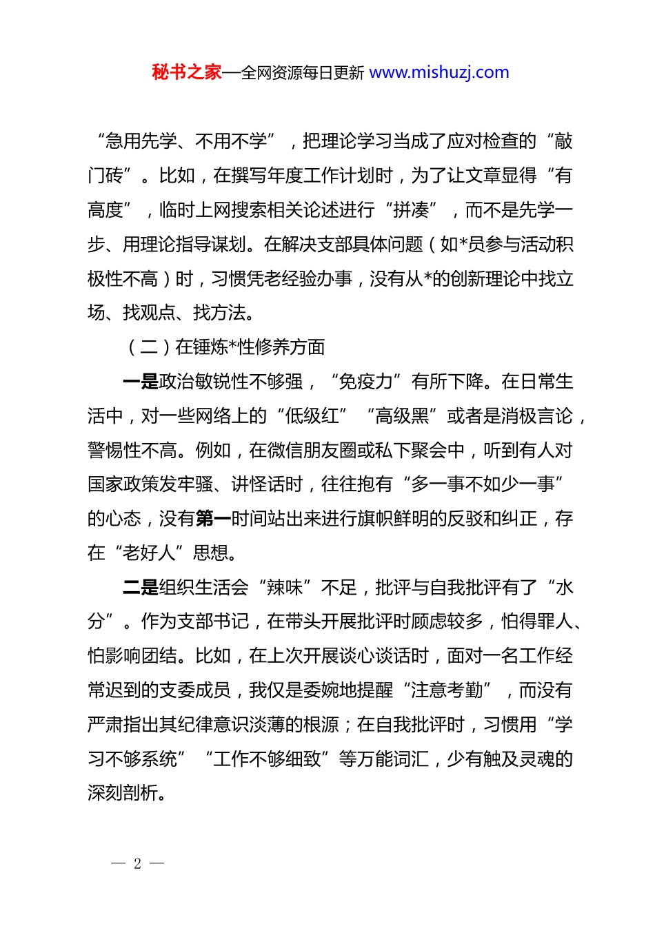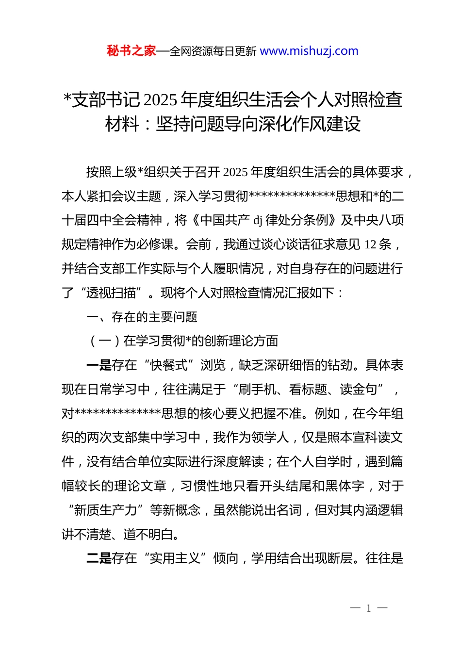 秘书之家—全网资源每日更新 www.mishuzj.com*支部书记 2025 年度组织生活会个人对照检查材料:坚持问题导向深化作风建设按照上级*组织关于召开 2025 年度组织生活会的具体要求,本人紧扣会议主题,深入学习贯彻**************思想和*的二十届四中全会精神,将《中国共产 dj 律处分条例》及中央八项规定精神作为必修课。会前,我通过谈心谈话征求意见 12 条,并结合支部工作实际与个人履职情况,对自身存在的问题进行了“透视扫描”。现将个人对照检查情况汇报如下:一、存在的主要问题(一)在学习贯彻*的创新理论方面一是存在“快餐式”浏览,缺乏深研细悟的钻劲。具体表现在日常学习中,往往满足于“刷手机、看标题、读金句”,对**************思想的核心要义把握不准。例如,在今年组织的两次支部集中学习中,我作为领学人,仅是照本宣科读文件,没有结合单位实际进行深度解读;在个人自学时,遇到篇幅较长的理论文章,习惯性地只看开头结尾和黑体字,对于“新质生产力”等新概念,虽然能说出名词,但对其内涵逻辑讲不清楚、道不明白。二是存在“实用主义”倾向,学用结合出现断层。往往是— 1 —秘书之家—全网资源每日更新 www.mishuzj.com“急用先学、不用不学”,把理论学习当成了应对检查的“敲门砖”。比如,在撰写年度工作计划时,为了让文章显得“有高度”,临时上网搜索相关论述进行“拼凑”,而不是先学一步、用理论指导谋划。在解决支部具体问题(如*员参与活动积极性不高)时,习惯凭老经验办事,没有从*的创新理论中找立场、找观点、找方法。(二)在锤炼*性修养方面一是政治敏锐性不够强,“免疫力”有所下降。在日常生活中,对一些网络上的“低级红”“高级黑”或者是消极言论,警惕性不高。例如,在微信朋友圈或私下聚会中,听到有人对国家政策发牢骚、讲怪话时,往往抱有“多一事不如少一事”的心态,没有第一时间站出来进行旗帜鲜明的反驳和纠正,存在“老好人”思想。二是组织生活会“辣味”不足,批评与自我批评有了“水分”。作为支部书记,在带头开展批评时顾虑较多,怕得罪人、怕影响团结。比如,在上次开展谈心谈话时,面对一名工作经常迟到的支委成员,我仅是委婉地提醒“注意考勤”,而没有严肃指出其纪律意识淡薄的根源;在自我批评时,习惯用“学习不够系统”“工作不够细致”等万能词汇,少有触及灵魂的深刻剖析。— 2 —秘书之家—全网资源每日更新 www.mishuzj.com(三)在联系服务群众方面一是深入基层“走马观花”,调研不够深入。虽然建立了联系群众制度,但往往是“坐着车子转、隔着玻璃看”。例如,今年虽然下基层调研了 4 次,但每次都是匆匆忙忙,只是在现场听听汇报、看看展板,没有真正走进职工宿舍、食堂去“揭锅盖、坐板凳”,对基层群众最真实的急难愁盼问题掌握不全,导致提出的解决方案有时不接地气。二是服务群众缺乏耐心,存在“门好进、脸好看、事难办”的隐形变异。在面对群众咨询或诉求时,有时表现出急躁情绪。比如,上个月有群众来咨询政策,因其对流程不熟悉反复询问,我不自觉地提高了嗓门,甚至让对方“自己看墙上的流程图”,没有做到耐心细致的解答。对于一些历史遗留的难点问题,存在畏难情绪,习惯向上级“打报告”推责,而不是想方设法在支部层面协调解决。(四)在发挥先锋模范作用方面一是攻坚克难的锐气减退,存在“守摊子”思想。随着任职时间的增长,产生了“求稳怕乱”的心理。例如,在今年推进支部标准化建设攻坚任务时,面对需要协调多部门的复杂情况,我第一时间想到的是“等一等、看一看”,没有主动出击去沟通协调,导致项目推进滞后。在日常工作中,满足于完成— 3 —秘书之家—全网资源每日更新 www.mishuzj.com上级交办的“规定动作”,缺乏结合实际创新的“自选动作”,支部工作亮点不多。二是履职尽责标准不高,“头雁效应”不明显。对自己的要求有时甚至低于普通*员。比如,要求*员同志按时提交思想汇报,自己却偶尔拖延;要求大家节假日值班严守纪律,自己值班时却偶尔脱岗处理私事。在遇到急难险重任务时,有时习惯于“动嘴指挥”,而不是“带头冲锋”,没有真正做到“...