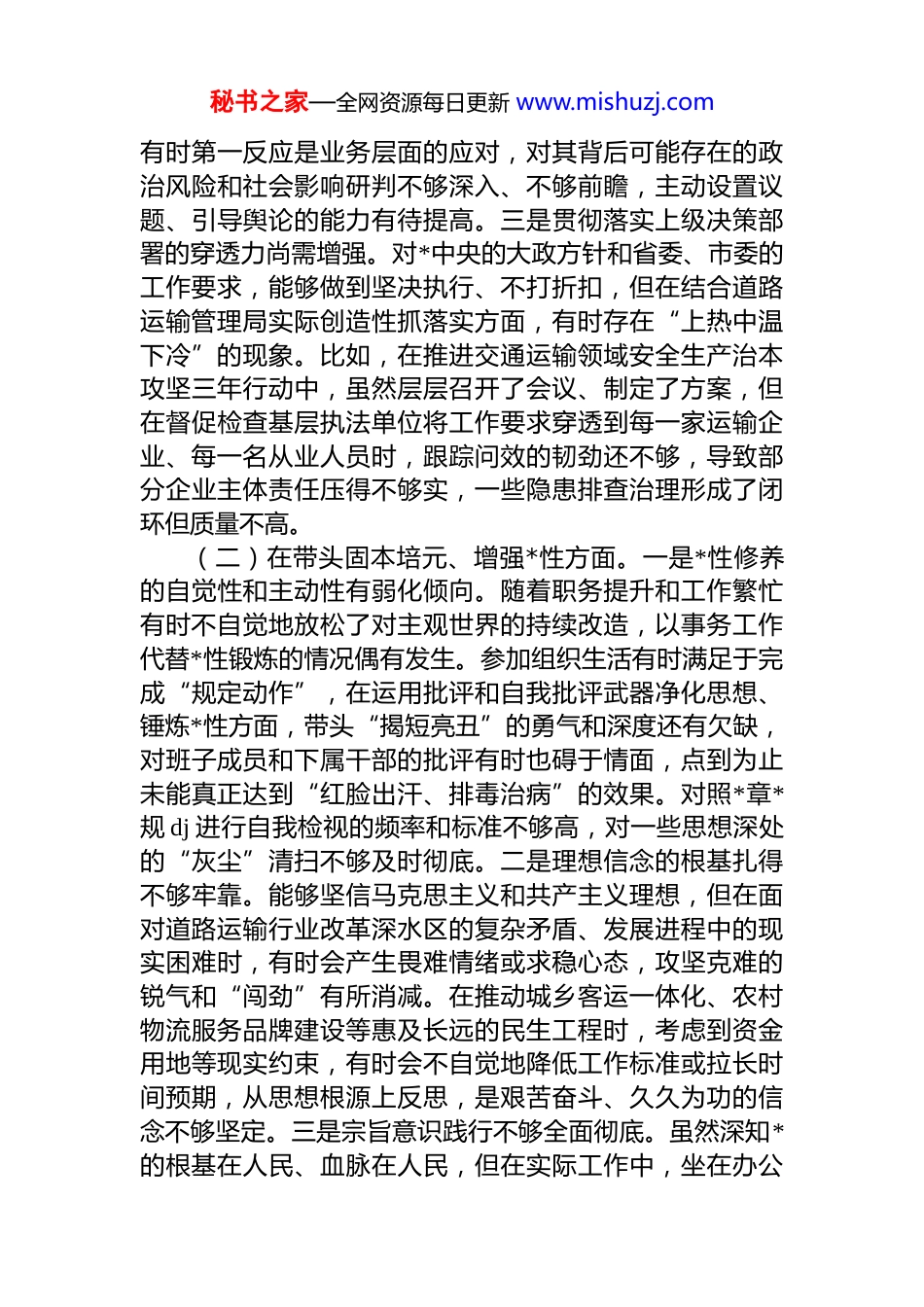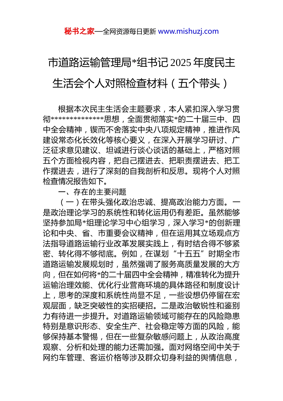 秘书之家—全网资源每日更新 www.mishuzj.com市道路运输管理局*组书记 2025 年度民主生活会个人对照检查材料(五个带头)根据本次民主生活会主题要求,本人紧扣深入学习贯彻**************思想,全面贯彻落实*的二十届三中、四中全会精神,锲而不舍落实中央八项规定精神,推进作风建设常态化长效化等核心要义,在深入开展学习研讨、广泛征求意见建议、坦诚进行谈心谈话的基础上,严格对照五个方面检视内容,把自己摆进去、把职责摆进去、把工作摆进去,进行了深刻的自我剖析和反思。现将个人对照检查情况报告如下。一、存在的主要问题(一)在带头强化政治忠诚、提高政治能力方面。一是政治理论学习的系统性和转化运用仍有差距。虽然能够坚持参加局*组理论学习中心组学习,深入学习*的创新理论和中央、省、市重要会议精神,但在运用其立场观点方法指导道路运输行业改革发展实践上,有时结合得不够紧密、转化得不够彻底。例如,在谋划“十五五”时期全市道路运输发展规划时,虽然强调了服务高质量发展的大方向,但在如何将*的二十届四中全会精神,精准转化为提升运输治理效能、优化行业营商环境的具体路径和制度设计上,思考的深度和系统性尚显不足,一些设想仍停留在宏观层面,缺乏突破性的实招硬招。二是政治敏锐性和鉴别力有待进一步提升。对道路运输领域可能存在的风险隐患特别是意识形态、安全生产、社会稳定等方面的风险,能够保持基本警惕,但在一些复杂敏感问题上,从政治高度观察、分析和处理的能力还需加强。面对网络空间中关于网约车管理、客运价格等涉及群众切身利益的舆情信息,秘书之家—全网资源每日更新 www.mishuzj.com有时第一反应是业务层面的应对,对其背后可能存在的政治风险和社会影响研判不够深入、不够前瞻,主动设置议题、引导舆论的能力有待提高。三是贯彻落实上级决策部署的穿透力尚需增强。对*中央的大政方针和省委、市委的工作要求,能够做到坚决执行、不打折扣,但在结合道路运输管理局实际创造性抓落实方面,有时存在“上热中温下冷”的现象。比如,在推进交通运输领域安全生产治本攻坚三年行动中,虽然层层召开了会议、制定了方案,但在督促检查基层执法单位将工作要求穿透到每一家运输企业、每一名从业人员时,跟踪问效的韧劲还不够,导致部分企业主体责任压得不够实,一些隐患排查治理形成了闭环但质量不高。(二)在带头固本培元、增强*性方面。一是*性修养的自觉性和主动性有弱化倾向。随着职务提升和工作繁忙有时不自觉地放松了对主观世界的持续改造,以事务工作代替*性锻炼的情况偶有发生。参加组织生活有时满足于完成“规定动作”,在运用批评和自我批评武器净化思想、锤炼*性方面,带头“揭短亮丑”的勇气和深度还有欠缺,对班子成员和下属干部的批评有时也碍于情面,点到为止未能真正达到“红脸出汗、排毒治病”的效果。对照*章*规 dj 进行自我检视的频率和标准不够高,对一些思想深处的“灰尘”清扫不够及时彻底。二是理想信念的根基扎得不够牢靠。能够坚信马克思主义和共产主义理想,但在面对道路运输行业改革深水区的复杂矛盾、发展进程中的现实困难时,有时会产生畏难情绪或求稳心态,攻坚克难的锐气和“闯劲”有所消减。在推动城乡客运一体化、农村物流服务品牌建设等惠及长远的民生工程时,考虑到资金用地等现实约束,有时会不自觉地降低工作标准或拉长时间预期,从思想根源上反思,是艰苦奋斗、久久为功的信念不够坚定。三是宗旨意识践行不够全面彻底。虽然深知*的根基在人民、血脉在人民,但在实际工作中,坐在办公秘书之家—全网资源每日更新 www.mishuzj.com室听汇报、看材料的时间仍然偏多,主动深入运输企业、客运站场、货运司机群体中间,与他们面对面交流、心贴心沟通做得还不够经常。在制定涉及行业管理、行政审批的政策文件时,虽然也进行了调研,但有时对基层实际情况和群众真实需求的把握不够精准、全面,导致部分政策措施的针对性和可操作性有待提高,与群众期盼存在一定差距。(三)在带头敬畏人民、敬畏组织、敬畏法纪方面。一是践行群众路线不够深入扎实。落实“四下基层”制度有时存在“走形”现象,下基层...