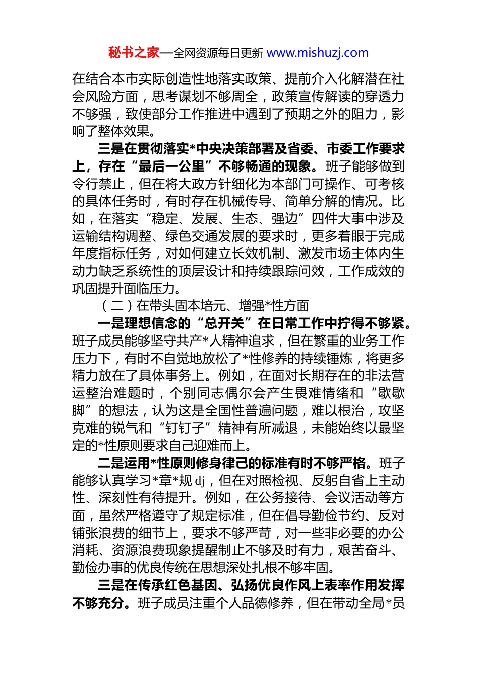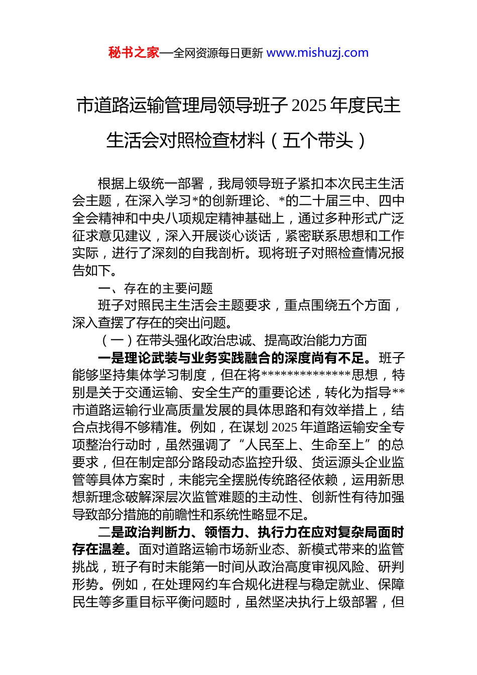 秘书之家—全网资源每日更新 www.mishuzj.com市道路运输管理局领导班子 2025 年度民主生活会对照检查材料(五个带头)根据上级统一部署,我局领导班子紧扣本次民主生活会主题,在深入学习*的创新理论、*的二十届三中、四中全会精神和中央八项规定精神基础上,通过多种形式广泛征求意见建议,深入开展谈心谈话,紧密联系思想和工作实际,进行了深刻的自我剖析。现将班子对照检查情况报告如下。一、存在的主要问题班子对照民主生活会主题要求,重点围绕五个方面,深入查摆了存在的突出问题。(一)在带头强化政治忠诚、提高政治能力方面一是理论武装与业务实践融合的深度尚有不足。班子能够坚持集体学习制度,但在将**************思想,特别是关于交通运输、安全生产的重要论述,转化为指导**市道路运输行业高质量发展的具体思路和有效举措上,结合点找得不够精准。例如,在谋划 2025 年道路运输安全专项整治行动时,虽然强调了“人民至上、生命至上”的总要求,但在制定部分路段动态监控升级、货运源头企业监管等具体方案时,未能完全摆脱传统路径依赖,运用新思想新理念破解深层次监管难题的主动性、创新性有待加强导致部分措施的前瞻性和系统性略显不足。二是政治判断力、领悟力、执行力在应对复杂局面时存在温差。面对道路运输市场新业态、新模式带来的监管挑战,班子有时未能第一时间从政治高度审视风险、研判形势。例如,在处理网约车合规化进程与稳定就业、保障民生等多重目标平衡问题时,虽然坚决执行上级部署,但秘书之家—全网资源每日更新 www.mishuzj.com在结合本市实际创造性地落实政策、提前介入化解潜在社会风险方面,思考谋划不够周全,政策宣传解读的穿透力不够强,致使部分工作推进中遇到了预期之外的阻力,影响了整体效果。三是在贯彻落实*中央决策部署及省委、市委工作要求上,存在“最后一公里”不够畅通的现象。班子能够做到令行禁止,但在将大政方针细化为本部门可操作、可考核的具体任务时,有时存在机械传导、简单分解的情况。比如,在落实“稳定、发展、生态、强边”四件大事中涉及运输结构调整、绿色交通发展的要求时,更多着眼于完成年度指标任务,对如何建立长效机制、激发市场主体内生动力缺乏系统性的顶层设计和持续跟踪问效,工作成效的巩固提升面临压力。(二)在带头固本培元、增强*性方面一是理想信念的“总开关”在日常工作中拧得不够紧。班子成员能够坚守共产*人精神追求,但在繁重的业务工作压力下,有时不自觉地放松了*性修养的持续锤炼,将更多精力放在了具体事务上。例如,在面对长期存在的非法营运整治难题时,个别同志偶尔会产生畏难情绪和“歇歇脚”的想法,认为这是全国性普遍问题,难以根治,攻坚克难的锐气和“钉钉子”精神有所减退,未能始终以最坚定的*性原则要求自己迎难而上。二是运用*性原则修身律己的标准有时不够严格。班子能够认真学习*章*规 dj,但在对照检视、反躬自省上主动性、深刻性有待提升。例如,在公务接待、会议活动等方面,虽然严格遵守了规定标准,但在倡导勤俭节约、反对铺张浪费的细节上,要求不够严苛,对一些非必要的办公消耗、资源浪费现象提醒制止不够及时有力,艰苦奋斗、勤俭办事的优良传统在思想深处扎根不够牢固。三是在传承红色基因、弘扬优良作风上表率作用发挥不够充分。班子成员注重个人品德修养,但在带动全局*员秘书之家—全网资源每日更新 www.mishuzj.com干部加强*性锻炼、提升精神境界方面,形式不够丰富,载体不够新颖。例如,在组织开展主题*日活动时,有时局限于参观学习、理论宣讲,未能深入挖掘本地红色交通史、先进模范事迹等资源,将其有效融入干部职工的日常教育管理,*性教育的感染力、实效性有待进一步增强。(三)在带头敬畏人民、敬畏组织、敬畏法纪方面一是走好新时代群众路线的具体实践不够深入扎实。虽然落实了“四下基层”制度,但有时调研走访存在“走马观花”现象,真正沉到运输企业、客运站场、驾驶员群体中倾听原汁原味呼声、了解急难愁盼问题的时间和深度不够。例如,在优化调整主城区公交线路时,前期主要通过数据分析和社会公开征求意见,虽然召开了听证会...