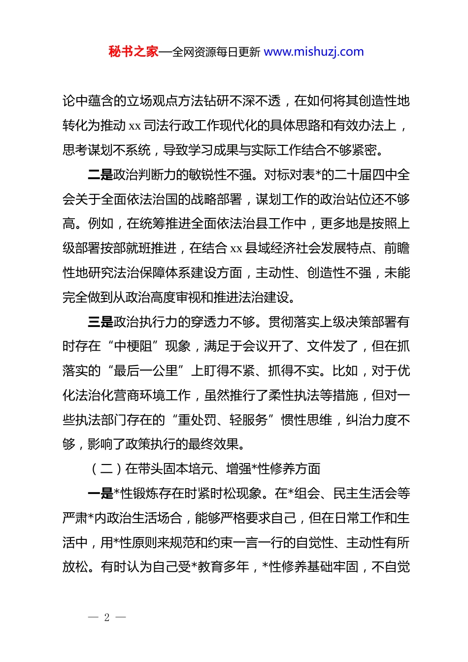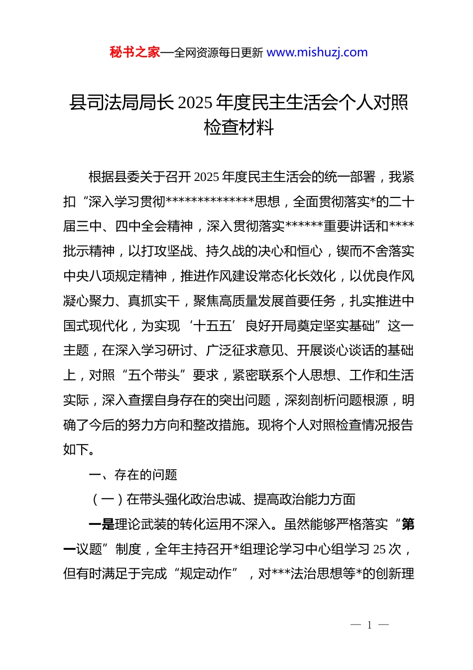 秘书之家—全网资源每日更新 www.mishuzj.com县司法局局长 2025 年度民主生活会个人对照检查材料根据县委关于召开 2025 年度民主生活会的统一部署,我紧扣“深入学习贯彻**************思想,全面贯彻落实*的二十届三中、四中全会精神,深入贯彻落实******重要讲话和****批示精神,以打攻坚战、持久战的决心和恒心,锲而不舍落实中央八项规定精神,推进作风建设常态化长效化,以优良作风凝心聚力、真抓实干,聚焦高质量发展首要任务,扎实推进中国式现代化,为实现‘十五五’良好开局奠定坚实基础”这一主题,在深入学习研讨、广泛征求意见、开展谈心谈话的基础上,对照“五个带头”要求,紧密联系个人思想、工作和生活实际,深入查摆自身存在的突出问题,深刻剖析问题根源,明确了今后的努力方向和整改措施。现将个人对照检查情况报告如下。一、存在的问题(一)在带头强化政治忠诚、提高政治能力方面一是理论武装的转化运用不深入。虽然能够严格落实“第一议题”制度,全年主持召开*组理论学习中心组学习 25 次,但有时满足于完成“规定动作”,对***法治思想等*的创新理— 1 —秘书之家—全网资源每日更新 www.mishuzj.com论中蕴含的立场观点方法钻研不深不透,在如何将其创造性地转化为推动 xx 司法行政工作现代化的具体思路和有效办法上,思考谋划不系统,导致学习成果与实际工作结合不够紧密。二是政治判断力的敏锐性不强。对标对表*的二十届四中全会关于全面依法治国的战略部署,谋划工作的政治站位还不够高。例如,在统筹推进全面依法治县工作中,更多地是按照上级部署按部就班推进,在结合 xx 县域经济社会发展特点、前瞻性地研究法治保障体系建设方面,主动性、创造性不强,未能完全做到从政治高度审视和推进法治建设。三是政治执行力的穿透力不够。贯彻落实上级决策部署有时存在“中梗阻”现象,满足于会议开了、文件发了,但在抓落实的“最后一公里”上盯得不紧、抓得不实。比如,对于优化法治化营商环境工作,虽然推行了柔性执法等措施,但对一些执法部门存在的“重处罚、轻服务”惯性思维,纠治力度不够,影响了政策执行的最终效果。(二)在带头固本培元、增强*性修养方面一是*性锻炼存在时紧时松现象。在*组会、民主生活会等严肃*内政治生活场合,能够严格要求自己,但在日常工作和生活中,用*性原则来规范和约束一言一行的自觉性、主动性有所放松。有时认为自己受*教育多年,*性修养基础牢固,不自觉— 2 —秘书之家—全网资源每日更新 www.mishuzj.com地降低了“吾日三省吾身”的标准,艰苦奋斗的政治本色有所淡化。二是理想信念的根基扎得不牢。在面对司法行政工作改革发展中的深层次矛盾和复杂问题时,偶尔会产生畏难情绪和路径依赖。比如,在推进公证体制改革时,面对历史遗留问题和人员思想波动,一度信心不足,攻坚克难的锐气有所消减,反映出自身在复杂局面下坚守共产*人精神追求、锤炼坚毅品格的韧劲不够。三是为民情怀的践行不彻底。虽然始终把人民群众放在心中最高位置,但践行新时代*的群众路线不够深入。例如,全年办理法律援助案件 1653 件,为 420 名农民工追讨薪资 412 万元,但自己主动下沉到田间地头、工厂车间,与群众面对面交流、心贴心沟通,倾听他们最真实法律需求的次数不多,更多是通过下属汇报和数据报表了解情况。(三)在带头敬畏人民、敬畏组织、敬畏法纪方面一是执行民主集中制不够充分。作为“班长”,有时在*组会研究“三重一大”事项时,为了追求议事效率,会前虽然进行了沟通酝酿,但在会上引导班子成员充分发表不同意见、展开深入讨论做得不够,有时自己的意见发表后,其他同志附和的多,提出不同见解的少,决策的科学性民主性有时会受到影— 3 —秘书之家—全网资源每日更新 www.mishuzj.com响。二是权力运行的监督制约意识不强。习惯于用行政命令推动工作,对权力运行的制约和监督抓得不够紧。对公证办理、社区矫正、法律援助等与群众利益密切相关的重点领域,更多是听取分管领导汇报、查看制度文件,主动采取“四不两直”方式进行“嵌入式”监督检查不多,对一些潜在的廉政风险点,预警和防范不够...