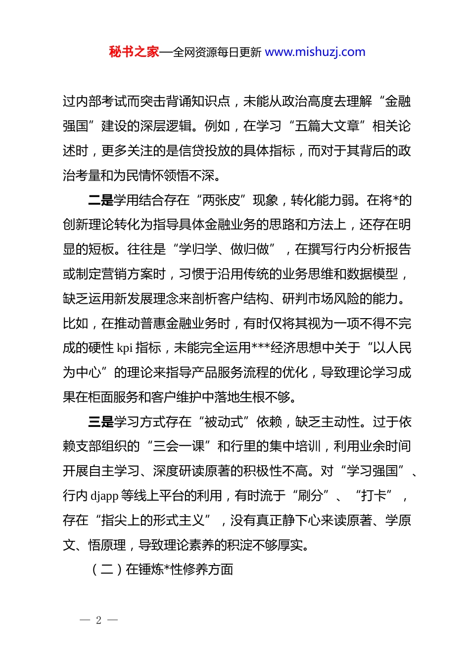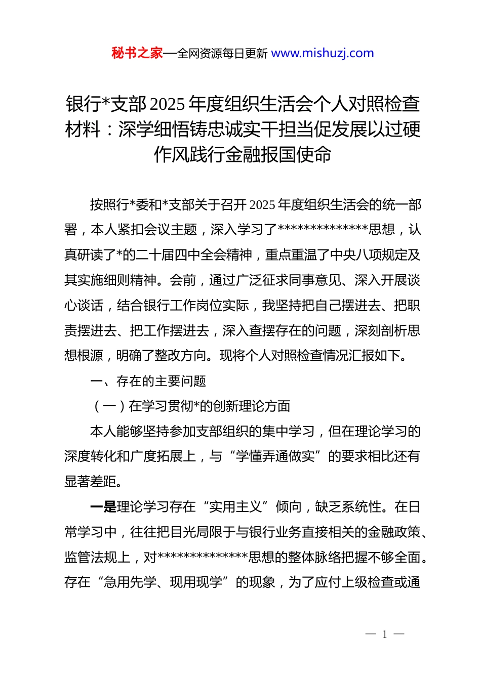 秘书之家—全网资源每日更新 www.mishuzj.com银行*支部 2025 年度组织生活会个人对照检查材料:深学细悟铸忠诚实干担当促发展以过硬作风践行金融报国使命按照行*委和*支部关于召开 2025 年度组织生活会的统一部署,本人紧扣会议主题,深入学习了**************思想,认真研读了*的二十届四中全会精神,重点重温了中央八项规定及其实施细则精神。会前,通过广泛征求同事意见、深入开展谈心谈话,结合银行工作岗位实际,我坚持把自己摆进去、把职责摆进去、把工作摆进去,深入查摆存在的问题,深刻剖析思想根源,明确了整改方向。现将个人对照检查情况汇报如下。一、存在的主要问题(一)在学习贯彻*的创新理论方面本人能够坚持参加支部组织的集中学习,但在理论学习的深度转化和广度拓展上,与“学懂弄通做实”的要求相比还有显著差距。一是理论学习存在“实用主义”倾向,缺乏系统性。在日常学习中,往往把目光局限于与银行业务直接相关的金融政策、监管法规上,对**************思想的整体脉络把握不够全面。存在“急用先学、现用现学”的现象,为了应付上级检查或通— 1 —秘书之家—全网资源每日更新 www.mishuzj.com过内部考试而突击背诵知识点,未能从政治高度去理解“金融强国”建设的深层逻辑。例如,在学习“五篇大文章”相关论述时,更多关注的是信贷投放的具体指标,而对于其背后的政治考量和为民情怀领悟不深。二是学用结合存在“两张皮”现象,转化能力弱。在将*的创新理论转化为指导具体金融业务的思路和方法上,还存在明显的短板。往往是“学归学、做归做”,在撰写行内分析报告或制定营销方案时,习惯于沿用传统的业务思维和数据模型,缺乏运用新发展理念来剖析客户结构、研判市场风险的能力。比如,在推动普惠金融业务时,有时仅将其视为一项不得不完成的硬性 kpi 指标,未能完全运用***经济思想中关于“以人民为中心”的理论来指导产品服务流程的优化,导致理论学习成果在柜面服务和客户维护中落地生根不够。三是学习方式存在“被动式”依赖,缺乏主动性。过于依赖支部组织的“三会一课”和行里的集中培训,利用业余时间开展自主学习、深度研读原著的积极性不高。对“学习强国”、行内 djapp 等线上平台的利用,有时流于“刷分”、“打卡”,存在“指尖上的形式主义”,没有真正静下心来读原著、学原文、悟原理,导致理论素养的积淀不够厚实。(二)在锤炼*性修养方面— 2 —秘书之家—全网资源每日更新 www.mishuzj.com对照*章*规 dj,自己在时刻保持共产*人政治本色方面,还存在自我要求放松、*性锻炼不够经常的问题。一是政治敏锐性不够强,存在“单纯业务观点”。作为一名银行从业人员,有时错误地认为只要把存款拉来、把贷款放对、把坏账控住就是最大的政治,忽视了金融工作的政治性和人民性。在日常工作中,对一些客户闲谈中涉及的负面言论或网络上的错误思潮,往往抱有“多一事不如少一事”的心态,缺乏旗帜鲜明予以抵制和反驳的勇气,没有时刻站在维护金融安全和意识形态安全的高度去审视自己的言行。二是自我革新的勇气不足,存在“老好人”思想。在*内组织生活中,开展批评与自我批评时顾虑较多。担心批评重了会影响同事关系,担心指出的问题太尖锐会影响部门团结。特别是在涉及信贷审批、风险合规等业务交叉环节的讨论中,对于同事存在的一些操作不规范、流程打擦边球的小问题,有时睁一只眼闭一只眼,不愿意动真碰硬去指出,缺乏共产*人应有的原则性和战斗性,导致一些苗头性问题未能及时得到纠正。三是价值观改造不够彻底,存在“因循守旧”心态。随着工作年限的增长,初入行时的那股拼劲和闯劲有所消退,在面对复杂的金融市场环境和繁重的考核压力时,偶尔会产生“比上不足比下有余”的懈怠心理。在对照先进典型和优秀*员标准— 3 —秘书之家—全网资源每日更新 www.mishuzj.com时,有时会下意识地寻找客观理由为自己开脱,认为自己作为基层员工,只要不违规违纪、按时完成任务就行,在思想深处放松了对世界观、人生观、价值观的高标准改造。(三)在联系服务群众方面对照全心全意为人民服务的宗旨,自己在日常金融服务工作中,...