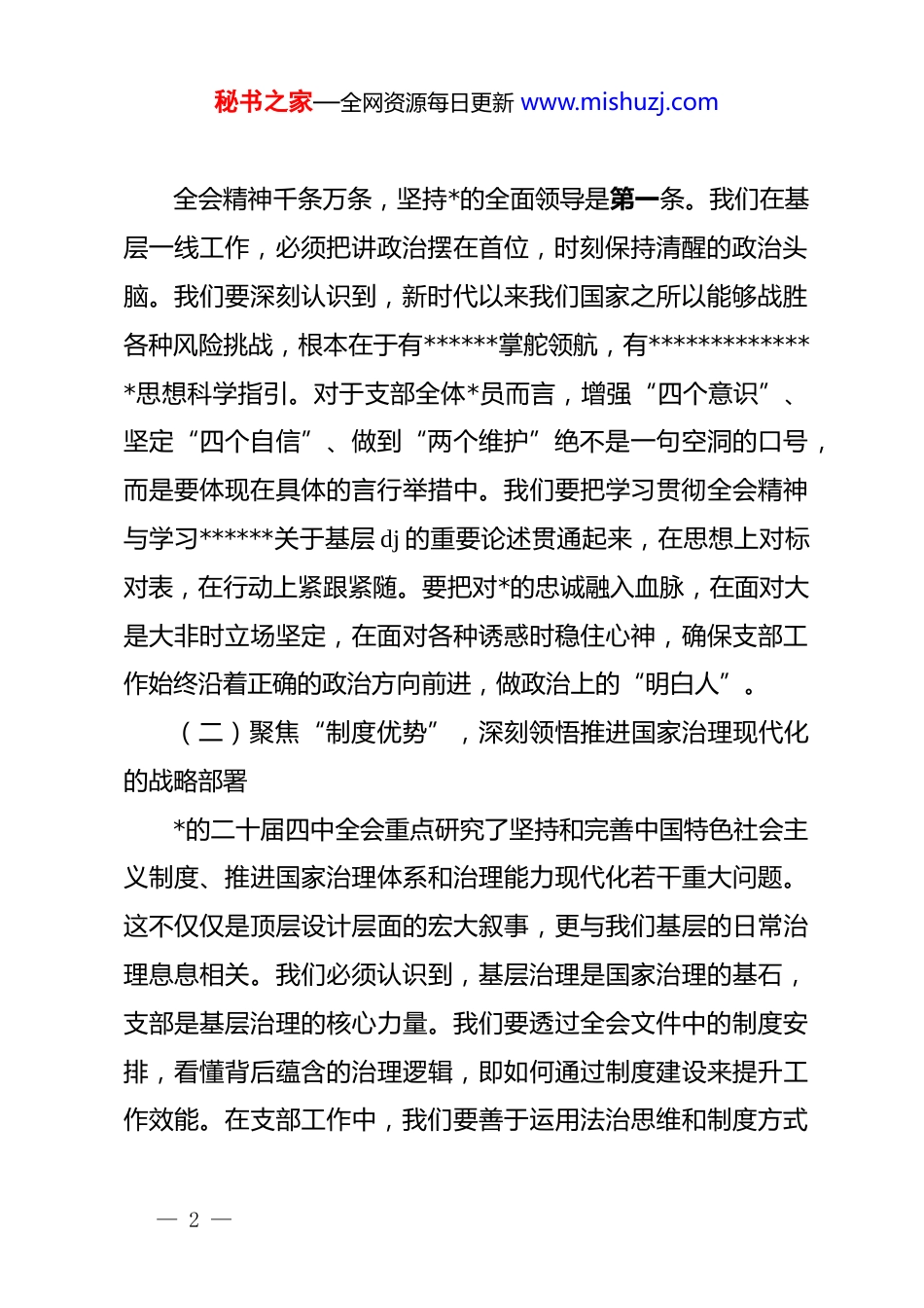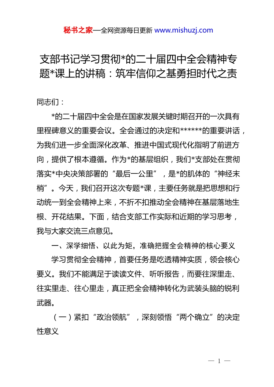 秘书之家—全网资源每日更新 www.mishuzj.com支部书记学习贯彻*的二十届四中全会精神专题*课上的讲稿:筑牢信仰之基勇担时代之责同志们:*的二十届四中全会是在国家发展关键时期召开的一次具有里程碑意义的重要会议。全会通过的决定和******的重要讲话,为我们进一步全面深化改革、推进中国式现代化指明了前进方向,提供了根本遵循。作为*的基层组织,我们*支部处在贯彻落实*中央决策部署的“最后一公里”,是*的肌体的“神经末梢”。今天,我们召开这次专题*课,主要任务就是把思想和行动统一到全会精神上来,不折不扣推动全会精神在基层落地生根、开花结果。下面,结合支部工作实际和近期的学习思考,我与大家交流三点意见。一、深学细悟、以此为矩,准确把握全会精神的核心要义学习贯彻全会精神,首要任务是吃透精神实质,领会核心要义。我们不能满足于读读文件、听听报告,而要往深里走、往实里走、往心里走,真正把全会精神转化为武装头脑的锐利武器。(一)紧扣“政治领航”,深刻领悟“两个确立”的决定性意义— 1 —秘书之家—全网资源每日更新 www.mishuzj.com全会精神千条万条,坚持*的全面领导是第一条。我们在基层一线工作,必须把讲政治摆在首位,时刻保持清醒的政治头脑。我们要深刻认识到,新时代以来我们国家之所以能够战胜各种风险挑战,根本在于有******掌舵领航,有**************思想科学指引。对于支部全体*员而言,增强“四个意识”、坚定“四个自信”、做到“两个维护”绝不是一句空洞的口号,而是要体现在具体的言行举措中。我们要把学习贯彻全会精神与学习******关于基层 dj 的重要论述贯通起来,在思想上对标对表,在行动上紧跟紧随。要把对*的忠诚融入血脉,在面对大是大非时立场坚定,在面对各种诱惑时稳住心神,确保支部工作始终沿着正确的政治方向前进,做政治上的“明白人”。(二)聚焦“制度优势”,深刻领悟推进国家治理现代化的战略部署*的二十届四中全会重点研究了坚持和完善中国特色社会主义制度、推进国家治理体系和治理能力现代化若干重大问题。这不仅仅是顶层设计层面的宏大叙事,更与我们基层的日常治理息息相关。我们必须认识到,基层治理是国家治理的基石,支部是基层治理的核心力量。我们要透过全会文件中的制度安排,看懂背后蕴含的治理逻辑,即如何通过制度建设来提升工作效能。在支部工作中,我们要善于运用法治思维和制度方式— 2 —秘书之家—全网资源每日更新 www.mishuzj.com来解决矛盾、推动发展,坚决摒弃“拍脑袋决策、拍胸脯保证、拍屁股走人”的陈旧作风。要通过学习,进一步坚定制度自信,把制度优势转化为治理效能,让每一位*员都成为维护制度权威、执行制度规定的表率,做制度执行的“排头兵”。(三)立足“人民至上”,深刻领悟以人民为中心的发展思想全会公报字里行间充满了浓浓的民生情怀,“人民”二字重千钧。无论是改革举措的落地,还是发展成果的共享,最终落脚点都是为了满足人民群众对美好生活的向往。对于我们支部而言,这就是我们的工作指南。我们要反躬自省,我们的工作是否真正解决了群众的急难愁盼?我们的服务是否真正暖到了群众的心坎上?学习贯彻全会精神,就是要强化宗旨意识,把群众的“表情包”作为检验工作的“风向标”。我们要坚持问需于民、问计于民,把群众满意不满意、答应不答应作为衡量支部工作成效的根本标准。要通过具体的服务项目和志愿活动,拉近与群众的距离,打通服务群众的最后一步,做服务群众的“贴心人”。二、笃行实干、以此为令,奋力开创支部工作的崭新局面一语不能践,万卷徒空虚。学习全会精神的最终目的是指导实践、推动工作。我们要把全会精神转化为干事创业的强大— 3 —秘书之家—全网资源每日更新 www.mishuzj.com动力,紧密结合本单位本部门的中心任务,找准切入点和结合点,推动支部工作提质增效。(一)强化“融合赋能”,打破 dj 与业务的“隐形墙”长期以来,基层 dj 工作中存在“两张皮”的现象,dj 是dj,业务是业务,各吹各的号,各唱各的调。贯彻落实全会精神,必须坚决破除这种思维定势,推动 dj 工作与业务工作深度融合。我们要树立“...