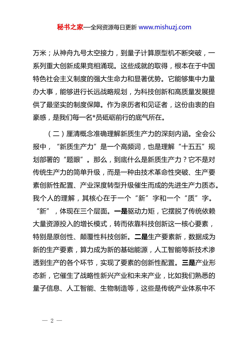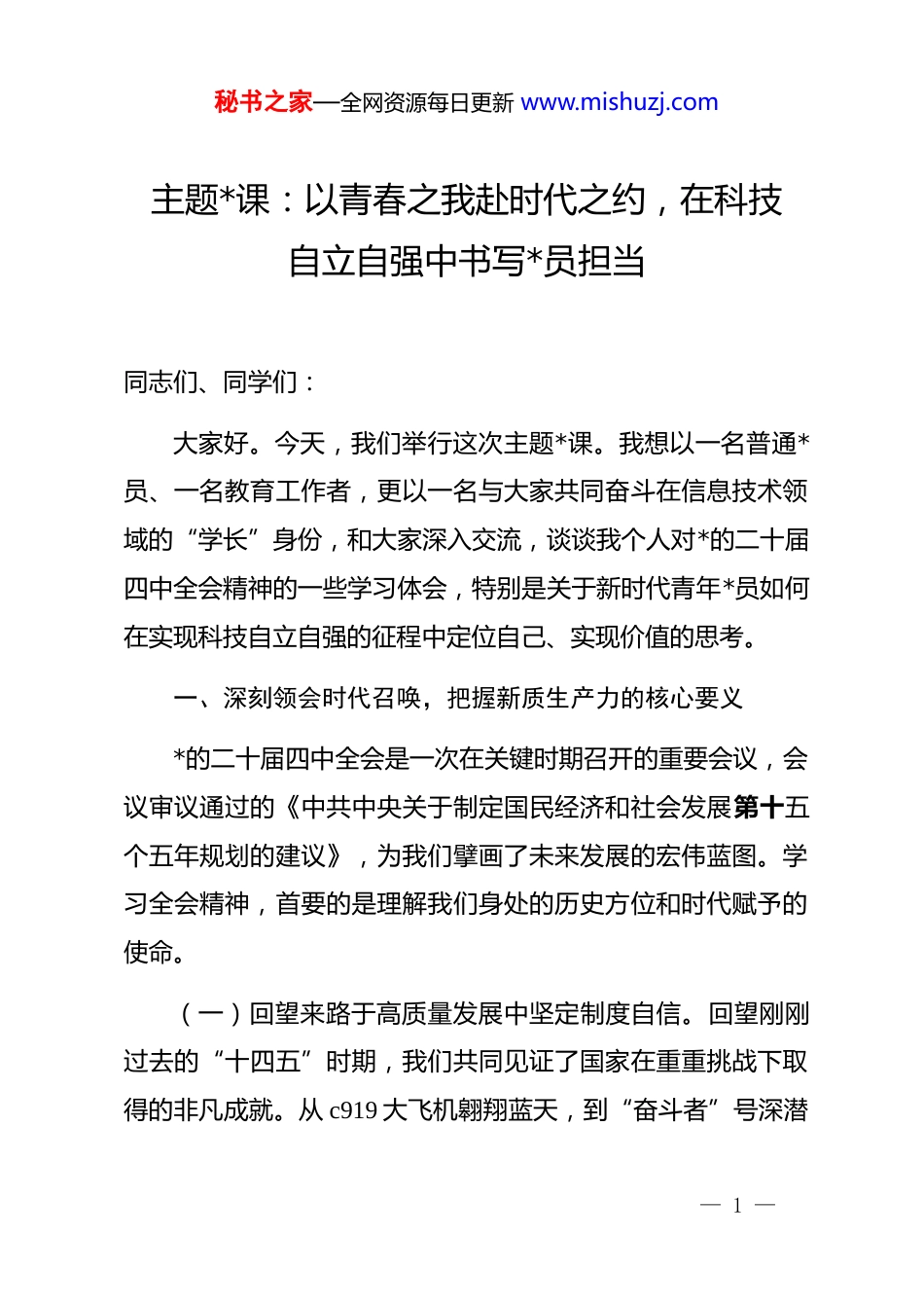 秘书之家—全网资源每日更新 www.mishuzj.com主题*课:以青春之我赴时代之约,在科技自立自强中书写*员担当同志们、同学们:大家好。今天,我们举行这次主题*课。我想以一名普通*员、一名教育工作者,更以一名与大家共同奋斗在信息技术领域的“学长”身份,和大家深入交流,谈谈我个人对*的二十届四中全会精神的一些学习体会,特别是关于新时代青年*员如何在实现科技自立自强的征程中定位自己、实现价值的思考。一、深刻领会时代召唤,把握新质生产力的核心要义*的二十届四中全会是一次在关键时期召开的重要会议,会议审议通过的《中共中央关于制定国民经济和社会发展第十五个五年规划的建议》,为我们擘画了未来发展的宏伟蓝图。学习全会精神,首要的是理解我们身处的历史方位和时代赋予的使命。(一)回望来路于高质量发展中坚定制度自信。回望刚刚过去的“十四五”时期,我们共同见证了国家在重重挑战下取得的非凡成就。从 c919 大飞机翱翔蓝天,到“奋斗者”号深潜— 1 —秘书之家—全网资源每日更新 www.mishuzj.com万米;从神舟九号太空接力,到量子计算原型机不断突破,一系列重大创新成果竞相涌现。这些成就的取得,根本在于中国特色社会主义制度的强大生命力和显著优势。它能够集中力量办大事,能够进行长远战略规划,为科技创新和高质量发展提供了最坚实的制度保障。作为亲历者和见证者,这份由衷的自豪感,是我们每一名*员砥砺前行的底气所在。(二)厘清概念准确理解新质生产力的深刻内涵。全会公报中,“新质生产力”是一个高频词,也是理解“十五五”规划部署的“题眼”。那么,到底什么是新质生产力?它不是对传统生产力的简单升级,而是一种由技术革命性突破、生产要素创新性配置、产业深度转型升级催生而成的先进生产力质态。我个人的理解,其核心在于一个“新”字和一个“质”字。“新”,体现在三个层面。一是驱动力矩,它摆脱了传统依赖大量资源投入的增长模式,转而依靠科技创新这一核心要素,特别是原创性、颠覆性科技创新。二是生产要素新,数据成为新的生产要素,算力成为新的基础能源,人工智能等新技术渗透到生产的各个环节,实现了要素的创新性配置。三是产业形态新,它催生了战略性新兴产业和未来产业,比如我们熟悉的量子信息、人工智能、生物制造等,这些是传统产业体系中不— 2 —秘书之家—全网资源每日更新 www.mishuzj.com曾有过的全新领域。“质”,则彰显了发展的目标导向。新质生产力具有高科技、高效能、高质量的鲜明特点。它追求的不是量的粗放增长,而是质的有效提升,是推动经济实现更高质量、更有效率、更加公平、更可持续、更为安全的发展。因此,发展新质生产力,正是推动高质量发展的内在要求和重要着力点。(三)锚定未来洞察国家战略布局的深远考量。为什么中央在当前这个时间节点,如此突出地强调新质生产力?这背后有着深刻的战略考量。当今世界,新一轮科技革命和产业变革加速演进,大国竞争的核心就是科技竞争。谁能抢占科技发展的制高点,谁就能在未来的国际竞争中掌握主动权,塑造发展新优势。*的二十届四中全会明确将“加快高水平科技自立自强,引领发展新质生产力”作为战略任务进行专章部署这本身就释放了一个极其强烈的信号:科技自立自强不再是一道选择题,而是关乎国家发展和民族复兴的必答题。它不仅是发展问题,更是生存问题。我们正处在一个不进则退、慢进亦退的关键当口。理解了这一点,就能明白发展新质生产力对于我们国家有多么重要和紧迫。二、精准定位青年坐标,明确学生*员的使命担当— 3 —秘书之家—全网资源每日更新 www.mishuzj.com宏大的时代叙事,最终要落到每一个具体的个人身上。作为**学院的学生*员,我们该如何在这场关乎国运的伟大变革中找准自己的位置,担起应有的责任?(一)认识“我是谁”在身份认同中强化政治自觉。在座的每一位,首先是一名共产*员,然后才是一名学生。*员身份是我们的第一身份。这意味着什么?这意味着我们看待问题、思考未来的出发点,必须与*和国家的需求同频共振。这是一种政治自觉,更是一种融入血脉的身份认同。在校园里,这种身份认同或许不那么具象。...
