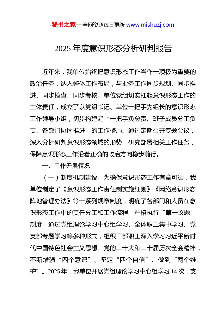 秘书之家—全网资源每日更新 www.mishuzj.com2025 年度意识形态分析研判报告 近年来,我单位始终把意识形态工作当作一项极为重要的政治任务,纳入整体工作布局,与业务工作同步规划、同步推进、同步检查、同步考核。单位党组切实扛起意识形态工作的主体责任,成立了以党组书记、单位一把手为组长的意识形态工作领导小组,初步构建起“一把手负总责、班子成员分工负责、各部门协同推进”的工作格局。通过定期召开专题会议,深入分析研判意识形态领域的形势,研究部署相关工作任务,保障意识形态工作沿着正确的政治方向稳步前行。一、工作开展情况(一)制度机制建设。为确保意识形态工作有章可循,我单位制定了《意识形态工作责任制实施细则》《网络意识形态阵地管理办法》等一系列规章制度,明确了各部门和人员在意识形态工作中的责任分工和工作流程。严格执行“第一议题”制度,通过党组理论学习中心组学习、全体职工集中学习、党支部专题学习等多种形式,组织干部职工深入学习习近平新时代中国特色社会主义思想、党的二十大和二十届历次全会精神,不断增强“四个意识”、坚定“四个自信”、做到“两个维护”。2025 年,我单位开展党组理论学习中心组学习 14 次,支秘书之家—全网资源每日更新 www.mishuzj.com部学习 22 次,政治轮训 5 次,组织各类政治理论学习 50 次,有效筑牢了干部职工的思想根基。(二)阵地建设。在阵地建设方面,我单位不断加强官方网站、微信公众号、微博等新媒体平台的管理,积极宣传单位工作成果和典型案例。2025 年通过微信平台推送原创文章 900余篇、短视频 100 余个,在国家级媒体发稿 50 篇,省级媒体发稿 160 篇。同时,积极开展各类宣传活动,如“政策进社区、知识进企业、服务进乡村”等,发放宣传资料 350 余册,覆盖群众 700 余人次,有效扩大了宣传覆盖面和影响力。二、存在问题与不足(一)思想认识层面存在偏差。一是重视程度不够。部分干部职工对意识形态工作的极端重要性认识不足,存在“重业务轻意识形态”的现象。一些人认为意识形态工作是“务虚”的,看不见摸不着,不如业务工作实在,存在“不用管、管不好,甚至不用心管”的错误观念。这种认识偏差导致在实际工作中,将意识形态工作当作“软指标”,认为只要业务工作做好了,意识形态工作自然不会出问题,没有从党和国家事业发展的全局高度来认识和把握意识形态工作。二是政治鉴别力有待提高。少数干部职工党性观念淡薄,政治鉴别能力较弱,容易受到各种错误思潮的影响和侵蚀。在面对社会上的错误言论秘书之家—全网资源每日更新 www.mishuzj.com和不良信息时,不能旗帜鲜明地予以抵制和反驳,甚至个别职工存在“事不关己、高高挂起”的消极态度。三是理想信念不够坚定。尽管单位持续开展学习教育,但仍有少数干部职工理想信念不够牢固,存在形式主义学习的问题。部分职工参加政治理论学习时心不在焉,讨论交流不深入,学用脱节,没有真正将党的创新理论转化为实际行动。在某次内部检查中发现,个别职工对党的基本理论和方针政策理解不深,运用不灵活。(二)责任落实不到位。一是主体责任虚化。单位党组对意识形态工作的领导责任落实不够到位,全年专题研究意识形态工作的次数有限,未能将意识形态工作充分纳入党建工作责任制和领导干部目标管理体系。部分部门存在“党组会研究意识形态工作不深入、不细致,未将责任明确分解到具体岗位和人员,未列入年度工作重点”的问题。责任划分不清晰,导致压力传导层层递减,意识形态工作在一定程度上被边缘化,缺乏系统性和计划性。二是“一岗双责”履行不力。班子成员“一岗双责”意识淡薄,对分管领域的意识形态工作重视不够、指导不足。一些领导干部认为意识形态工作是党组书记和宣传部门的事情,与自己分管的业务工作关系不大,没有将意识形态工作与业务工作有机结合起来。在某次工作检查中发现,个别部门在推进业务工作时,忽视了意识形态工作的要求,导致秘书之家—全网资源每日更新 www.mishuzj.com工作出现偏差。三是考核机制不健全。意识形态工作考核评价机制不完善,缺乏科学合理的评价指标和有效的...