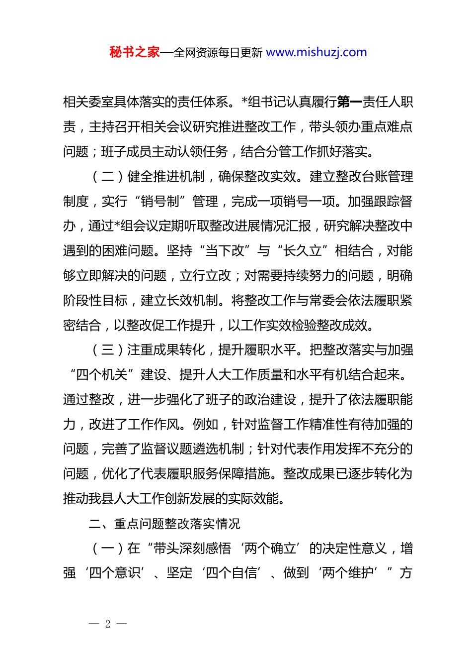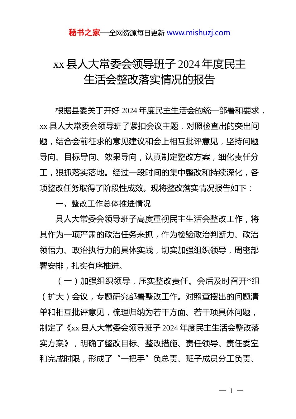 秘书之家—全网资源每日更新 www.mishuzj.comxx 县人大常委会领导班子 2024 年度民主生活会整改落实情况的报告根据县委关于开好 2024 年度民主生活会的统一部署和要求,xx 县人大常委会领导班子紧扣会议主题,对照检查出的突出问题,结合会前征求的意见建议和会上相互批评意见,坚持问题导向、目标导向、效果导向,认真制定整改方案,细化责任分工,狠抓落实落地。经过一段时间的集中整改和持续深化,各项整改任务取得了阶段性成效。现将整改落实情况报告如下:一、整改工作总体推进情况县人大常委会领导班子高度重视民主生活会整改工作,将其作为一项严肃的政治任务来抓,作为检验政治判断力、政治领悟力、政治执行力的具体实践,切实加强组织领导,周密部署安排,扎实有序推进。(一)加强组织领导,压实整改责任。会后及时召开*组(扩大)会议,专题研究部署整改工作。对照查摆出的问题清单和相互批评意见,梳理归纳为若干方面、若干项具体问题,制定了《xx 县人大常委会领导班子 2024 年度民主生活会整改落实方案》,明确了整改目标、整改措施、责任领导、责任委室和完成时限,形成了“一把手”负总责、班子成员分工负责、— 1 —秘书之家—全网资源每日更新 www.mishuzj.com相关委室具体落实的责任体系。*组书记认真履行第一责任人职责,主持召开相关会议研究推进整改工作,带头领办重点难点问题;班子成员主动认领任务,结合分管工作抓好落实。(二)健全推进机制,确保整改实效。建立整改台账管理制度,实行“销号制”管理,完成一项销号一项。加强跟踪督办,通过*组会议定期听取整改进展情况汇报,研究解决整改中遇到的困难问题。坚持“当下改”与“长久立”相结合,对能够立即解决的问题,立行立改;对需要持续努力的问题,明确阶段性目标,建立长效机制。将整改工作与常委会依法履职紧密结合,以整改促工作提升,以工作实效检验整改成效。(三)注重成果转化,提升履职水平。把整改落实与加强“四个机关”建设、提升人大工作质量和水平有机结合起来。通过整改,进一步强化了班子的政治建设,提升了依法履职能力,改进了工作作风。例如,针对监督工作精准性有待加强的问题,完善了监督议题遴选机制;针对代表作用发挥不充分的问题,优化了代表履职服务保障措施。整改成果已逐步转化为推动我县人大工作创新发展的实际效能。二、重点问题整改落实情况(一)在“带头深刻感悟‘两个确立’的决定性意义,增强‘四个意识’、坚定‘四个自信’、做到‘两个维护’”方— 2 —秘书之家—全网资源每日更新 www.mishuzj.com面。针对“理论武装与人大工作实践结合不够紧密”、“贯彻落实中央决策部署和省委、市委、县委要求的创造性、实效性有待提升”等问题,重点开展了以下工作:强化理论武装深度。严格执行“第一议题”制度,及时跟进学习******最新重要讲话和指示批示精神,特别是关于坚持和完善人民代表大会制度的重要思想。结合人大立法、监督、代表等工作实际,开展专题研讨、深入调研,努力将学习成果转化为谋划工作的思路、推动工作的举措。全年组织*组理论学习中心组学习 xx 次,开展专题研讨 xx 次。提升政治执行力。紧紧围绕县委中心工作和发展大局谋划和推进人大工作,确保人大工作与县委决策部署同频共振。加强对“一府一委两院”工作的监督,确保法律法规和县委决策部署有效执行。例如,在听取审议专项工作报告、开展执法检查时,更加注重围绕中心、服务大局,推动解决实际问题。严守政治纪律规矩。修订完善*组议事规则等制度,严格落实重大事项请示报告制度。加强对机关意识形态阵地的管理,确保人大工作正确的政治方向。(二)在“带头学纪、知纪、明纪、守纪,严肃*内政治生活”方面。— 3 —秘书之家—全网资源每日更新 www.mishuzj.com针对“纪律教育形式有待创新”、“密切联系群众、服务代表机制需进一步健全”等问题,重点开展了以下工作:深化纪律作风建设。组织开展形式多样的纪律教育活动,如观看警示教育片、参观廉政教育基地、通报典型案例等,增强*员干部的纪律意识和规矩意识。严格落实中央八项规定及其实施细则精神,力戒形式...