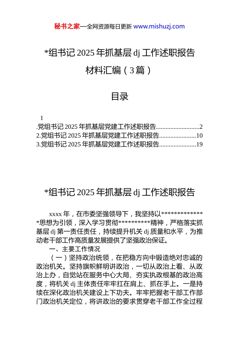 秘书之家—全网资源每日更新 www.mishuzj.com*组书记 2025 年抓基层 dj 工作述职报告材料汇编(3 篇)目录1.党组书记 2025 年抓基层党建工作述职报告...........................22.党组书记 2025 年抓基层党建工作述职报告.......................103.党组书记 2025 年抓基层党建工作述职报告.......................19*组书记 2025 年抓基层 dj 工作述职报告xxxx 年,在市委坚强领导下,我坚持以**************思想为引领,深入学习贯彻**********精神,严格落实抓基层 dj 第一责任责任,持续提升机关 dj 质量和水平,为推动老干部工作高质量发展提供了坚强政治保证。一、主要工作情况(一)坚持政治统领,在把稳方向中锻造绝对忠诚的政治机关。坚持旗帜鲜明讲政治,一切从政治上看、从政治上办,自觉站在服务中心大局、夯实执政根基的政治高度,将机关 dj 主体责任牢牢扛在肩上、抓在手上。一是持续在深化政治机关建设上下功夫。牢牢把握老干部工作部门政治机关定位,将讲政治的要求贯穿老干部工作全过程秘书之家—全网资源每日更新 www.mishuzj.com各方面。深入学习******关于*的建设、老干部工作重要讲话****批示和考察重要讲话精神,主动对标看齐,从中找方向、找思路、找办法;扎实开展深入贯彻中央八项规定精神学习教育,筑牢坚定拥护“两个维护”、坚决做到“两个确立”的思想根基。健全完善“第一议题”、理论学习中心组等制度,把传达学习中央、中组部有关政策文件列为固定议题,时刻关注上级在关心什么、强调什么。严格落实民主集中制,严格执行重大事项请示报告制度,扎实开展巡视巡察问题整改,确保中央及省委、市委各项决策部署在老干部工作领域不折不扣落实落地。二是持续在深化*的理论武装上下功夫。坚持把学习贯彻**************思想作为主题主线,采取理论中心组集中学习、支部研学、个人自学相结合的方式,及时跟进学习******最新重要讲话精神。坚持示范引领、以学促干,我带头履行领学促学职责、带头讲*课、带头调查研究、带头参加支部学习,带动班子成员等“关键少数”先学一步、学深一层;xxxx 年开展理论学习中心组学习研讨 xx 次,“第一议题”学习 xx 次,班子成员参加所在支部学习、指导基层支部 xx次。创新学习方式,组织开展“今天我来讲、机关大讲堂”“书润‘枫’浓——周五‘悦’读日”活动,集中收看“问学前沿”“组工讲坛”“先锋讲坛”等课程,不断提升学习活动的吸引力和感染力;深入实施青年干部理论学习提升计划,开办“枫青学堂”x 期,构建起“班子领学、支部深学、青年研学、实践促学”的全链条学习机制,确保理论学习入脑入心。三是持续在强化责任体系落实上下功夫。以贯彻落实《市市直单位*组(*委)落实机关 dj 主体责任实施办法》为契机,推动局务会、第一责任人、班子成员、机关*委、机关纪委、基层*组织等主体知责明责、守责担责;严格督促指导,每半年听取班子成员、机关*委抓 dj 工作汇报,及时分析研判机关 dj 工作情况;坚持 dj 工作、意识形态工作与业务工作同谋划、同部署、同推进、秘书之家—全网资源每日更新 www.mishuzj.com同考核,每季度主持召开专题会议研判意识形态风险隐患形成上下联动共推动、齐心协力抓落实的生动局面。四是持续在完善全面从严治*体系上下功夫。坚持把严的要求贯穿始终,以开展清廉机关建设行动为牵引,深入贯彻中央八项规定精神,持续完善廉政风险防控机制;聚焦元旦春节、五一端午、中秋国庆等节假日时间节点开展节日廉政提醒与检查,确保廉洁过节、安全过节;经常性开展警示教育,以身边事警醒身边人,引导*员干部知敬畏、存戒惧、守底线;常态化开展以案促改,一体推进不敢腐不能腐不想腐,持续营造风清气正的政治环境和干事创业的浓厚氛围。(二)强化统筹谋划,在健全制度机制中系统推进机关 dj。坚持系统抓、抓系统,不断细化组织管理制度、完善组织运行机制,构建上下贯通、执行有力的组织体系,推动机关 dj 提质增效、整体提升。一是健全纵横联动的工作体系。坚持“大 dj”工作格局,将机关 dj 与老干部工作通盘谋划,主持制定《市委老...