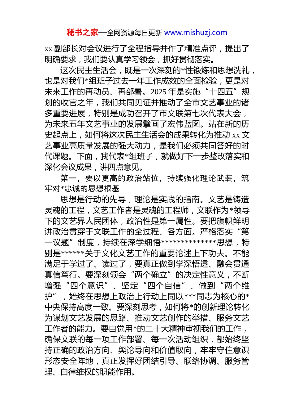 秘书之家—全网资源每日更新 www.mishuzj.com*组书记在 2025 年民主生活会上的总结讲话(3 篇)目录1.党组书记在 2025 年民主生活会上的总结讲话.......................22.在领导班子 2025 年民主生活会会前征求意见座谈会上的讲话.............................................................................................83.党委书记在 2025 年民主生活会前集体学习会上的讲话...18*组书记在 2025 年民主生活会上的总结讲话同志们:刚才,*组班子成员紧扣会议主题,本着对*、对事业、对同志、对自己高度负责的态度,深入学习领会**************思想和*的二十大精神,紧密联系思想和工作实际,把自己摆进去、把职责摆进去、把工作摆进去,认真开展了批评和自我批评。大家的发言准备充分、认识深刻,查摆问题不遮不掩,相互批评坦诚相见,整改方向明确具体达到了统一思想、增进团结、改进工作、担当使命的目的秘书之家—全网资源每日更新 www.mishuzj.comxx 副部长对会议进行了全程指导并作了精准点评,提出了明确要求,我们要认真学习领会,抓好贯彻落实。这次民主生活会,既是一次深刻的*性锻炼和思想洗礼,也是对我们*组班子过去一年工作成效的全面检验,更是对未来工作的再动员、再部署。2025 年是实施“十四五”规划的收官之年,我们共同见证并推动了全市文艺事业的诸多重要进展,特别是成功召开了市文联第七次代表大会,为未来五年文艺事业的发展擘画了宏伟蓝图。站在新的历史起点上,如何将这次民主生活会的成果转化为推动 xx 文艺事业高质量发展的强大动力,是我们必须共同答好的时代课题。下面,我代表*组班子,就做好下一步整改落实和深化会议成果,讲四点意见。第一,要以更高的政治站位,持续强化理论武装,筑牢对*忠诚的思想根基思想是行动的先导,理论是实践的指南。文艺是铸造灵魂的工程,文艺工作者是灵魂的工程师,文联作为*领导下的文艺界人民团体,政治性是第一属性。要把旗帜鲜明讲政治贯穿于文联工作的全过程、各方面。严格落实“第一议题”制度,持续在深学细悟**************思想,特别是******关于文化文艺工作的重要论述上下功夫。不能满足于学过了、读过了,要真正做到学深悟透、融会贯通真信笃行。要深刻领会“两个确立”的决定性意义,不断增强“四个意识”、坚定“四个自信”、做到“两个维护”,始终在思想上政治上行动上同以***同志为核心的*中央保持高度一致。要深刻思考,如何将*的创新理论转化为谋划文艺发展的思路、推动文艺创作的举措、服务文艺工作者的能力。要自觉用*的二十大精神审视我们的工作,确保文联的每一项工作部署、每一次活动组织,都始终坚持正确的政治方向、舆论导向和价值取向,牢牢守住意识形态安全阵地,真正发挥好团结引导、联络协调、服务管理、自律维权的职能作用。秘书之家—全网资源每日更新 www.mishuzj.com第二,要以最坚决的整改态度,从严从实抓好问题整改,做好民主生活会“后半篇文章”民主生活会的成效,最终要看整改落实的成效。会上查摆出的问题,无论是班子的,还是个人的,都不能停留在口头上、止步于会议中。会后,要对查摆出来的问题和相互批评的意见,进行系统梳理,建立问题清单、责任清单、整改清单,形成详尽的整改方案。要明确整改目标、整改时限和责任人,实行台账式管理、项目化推进,确保件件有着落、事事有回音。*组书记是第一责任人,班子成员要按照职责分工,主动认领问题,带头抓好分管领域的整改落实,形成一级抓一级、层层抓落实的整改格局。在对照检查中,我们触及了一些深层次矛盾和现实难题,比如,攻坚克难的锐气有所消减,面对文艺事业发展中的瓶颈问题,破解难题的韧劲不强;工作作风不够扎实深入基层、深入文艺家群体开展调研的深度和广度还有待加强;乡镇基层文联组织网络的作用未能充分“用起来”存在“上热下冷”的现象。对于这些问题,必须拿出“钉钉子”的精神,一锤一锤接着敲,直到问题彻底解决。整改过程要自觉接受*员干部和广大文艺工作者的监督,整改结果要适时在一定范围内公开,真正做到以整改的实际成效取信于民,推动文联作风建设持续向好...
