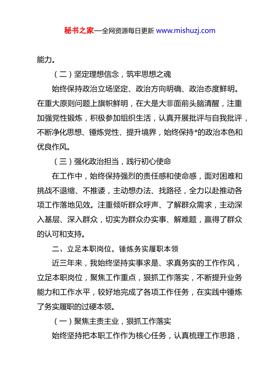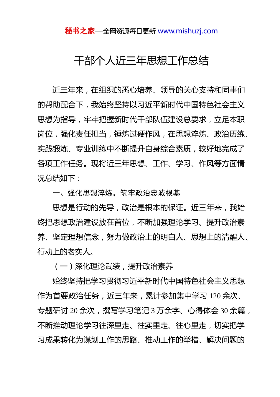 秘书之家—全网资源每日更新 www.mishuzj.com干部个人近三年思想工作总结 近三年来,在组织的悉心培养、领导的关心支持和同事们的帮助配合下,我始终坚持以习近平新时代中国特色社会主义思想为指导,牢牢把握新时代干部队伍建设总要求,立足本职岗位,强化责任担当,锤炼过硬作风,在思想淬炼、政治历练、实践锻炼、专业训练中不断提升自身综合素质,较好地完成了各项工作任务。现将近三年思想、工作、学习、作风等方面情况总结如下:一、强化思想淬炼,筑牢政治忠诚根基思想是行动的先导,政治是根本的保证。近三年来,我始终把思想政治建设放在首位,不断加强理论学习、提升政治素养、坚定理想信念,努力做政治上的明白人、思想上的清醒人、行动上的老实人。(一)深化理论武装,提升政治素养始终坚持把学习贯彻习近平新时代中国特色社会主义思想作为首要政治任务,近三年来,累计参加集中学习 120 余次、专题研讨 20 余次,撰写学习笔记 3 万余字、心得体会 30 余篇,不断推动理论学习往深里走、往实里走、往心里走,切实把学习成果转化为谋划工作的思路、推动工作的举措、解决问题的秘书之家—全网资源每日更新 www.mishuzj.com能力。(二)坚定理想信念,筑牢思想之魂始终保持政治立场坚定、政治方向明确、政治态度鲜明。在重大原则问题上旗帜鲜明,在大是大非面前头脑清醒,注重加强党性锻炼,积极参加组织生活,认真开展批评与自我批评,不断净化思想、锤炼党性、提升境界,始终保持*的政治本色和优良作风。(三)强化政治担当,践行初心使命在工作中,始终保持强烈的责任感和使命感,面对困难和挑战不退缩、不推诿,主动想办法、找路径,全力以赴推动各项工作落地见效。注重倾听群众呼声、了解群众需求,主动深入基层、深入群众,切实为群众办实事、解难题,赢得了群众的认可和支持。二、立足本职岗位,锤炼务实履职本领近三年来,我始终坚持实事求是、求真务实的工作作风,立足本职岗位,聚焦工作重点,狠抓工作落实,不断提升业务能力和工作水平,较好地完成了各项工作任务,在实践中锤炼了务实履职的过硬本领。(一)聚焦主责主业,狠抓工作落实始终坚持把本职工作作为核心任务,认真梳理工作思路,秘书之家—全网资源每日更新 www.mishuzj.com明确工作目标,细化工作举措,狠抓工作落实,确保各项工作有序推进、取得实效。在工作中,始终坚持问题导向,主动排查工作中存在的问题和不足,及时制定整改措施,限期整改到位,不断提升工作质量和效率。近三年来,牵头或参与完成重点工作任务 40 余项,各项工作指标均达到预期要求,先后获得上级组织和领导的肯定和表彰。(二)注重协同协作,凝聚工作合力始终坚持“分工不分家、协作促发展”的工作理念,注重加强与同事、与相关部门的沟通协作,主动配合同事开展工作,积极协调相关部门解决工作中遇到的困难和问题,凝聚起推动工作开展的强大合力。在团队工作中,始终坚持以身作则、率先垂范,主动承担繁重任务,主动帮助同事解决工作中的难题,营造了团结协作、干事创业的良好氛围。(三)强化创新突破,提升工作质效始终坚持创新思维,主动适应新时代工作的新形势、新任务、新要求,积极探索工作新思路、新方法、新举措,不断提升工作的针对性和实效性。在工作中,坚决打破传统思维定式和工作模式,结合实际情况,大胆探索创新,注重总结工作中的好经验、好做法,将其提炼升华为制度化、规范化的工作举措,推动工作常态化、长效化开展。秘书之家—全网资源每日更新 www.mishuzj.com三、坚持勤学善思,提升综合能力素质近三年来,我始终坚持把学习作为一种生活态度、一种工作责任、一种精神追求,牢固树立终身学习的理念,勤学善思、学以致用,不断提升自身的综合能力素质,适应新时代工作的需要。(一)强化政治理论学习,提升政治能力始终把政治理论学习放在学习的首位,坚持读原著、学原文、悟原理,认真学习党的路线方针政策、党章党规党纪和上级决策部署,注重结合工作实际开展学习,带着问题学、联系实际学,不断提高运用党的创新理论解决实际问题的能力,确保工作始终沿着正确的政治方向前进。(二...