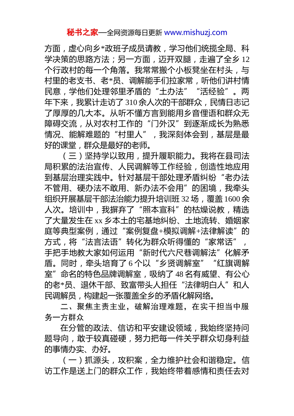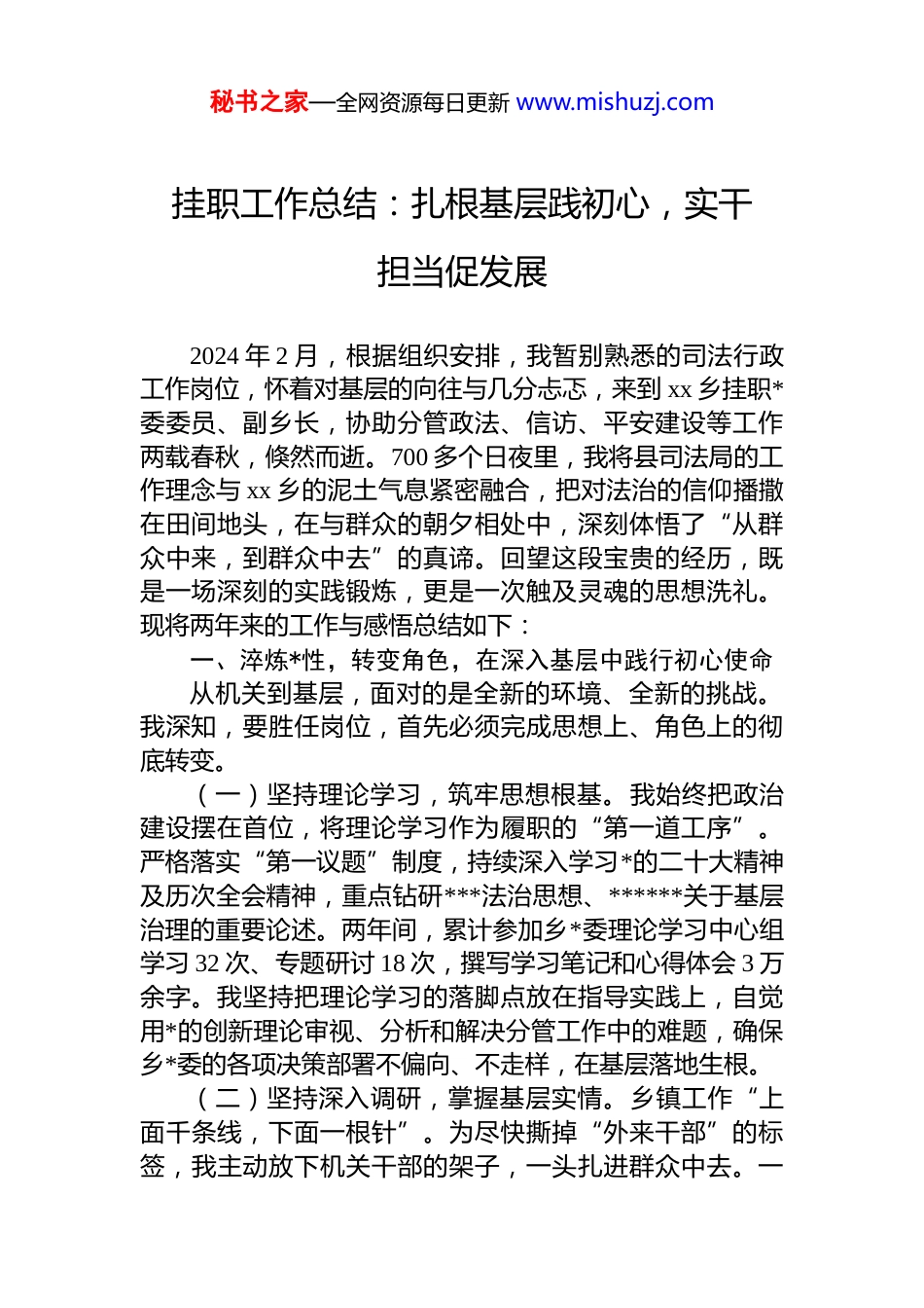 秘书之家—全网资源每日更新 www.mishuzj.com挂职工作总结:扎根基层践初心,实干担当促发展2024 年 2 月,根据组织安排,我暂别熟悉的司法行政工作岗位,怀着对基层的向往与几分忐忑,来到 xx 乡挂职*委委员、副乡长,协助分管政法、信访、平安建设等工作两载春秋,倏然而逝。700 多个日夜里,我将县司法局的工作理念与 xx 乡的泥土气息紧密融合,把对法治的信仰播撒在田间地头,在与群众的朝夕相处中,深刻体悟了“从群众中来,到群众中去”的真谛。回望这段宝贵的经历,既是一场深刻的实践锻炼,更是一次触及灵魂的思想洗礼。现将两年来的工作与感悟总结如下:一、淬炼*性,转变角色,在深入基层中践行初心使命从机关到基层,面对的是全新的环境、全新的挑战。我深知,要胜任岗位,首先必须完成思想上、角色上的彻底转变。(一)坚持理论学习,筑牢思想根基。我始终把政治建设摆在首位,将理论学习作为履职的“第一道工序”。严格落实“第一议题”制度,持续深入学习*的二十大精神及历次全会精神,重点钻研***法治思想、******关于基层治理的重要论述。两年间,累计参加乡*委理论学习中心组学习 32 次、专题研讨 18 次,撰写学习笔记和心得体会 3 万余字。我坚持把理论学习的落脚点放在指导实践上,自觉用*的创新理论审视、分析和解决分管工作中的难题,确保乡*委的各项决策部署不偏向、不走样,在基层落地生根。(二)坚持深入调研,掌握基层实情。乡镇工作“上面千条线,下面一根针”。为尽快撕掉“外来干部”的标签,我主动放下机关干部的架子,一头扎进群众中去。一秘书之家—全网资源每日更新 www.mishuzj.com方面,虚心向乡*政班子成员请教,学习他们统揽全局、科学决策的思路方法;另一方面,迈开双腿,走遍了全乡 12个行政村的每一个角落。我常常搬个小板凳坐在村头,与村里的老支书、老*员、调解能手们拉家常,听他们讲村情民意,学他们处理邻里矛盾的“土办法”“活经验”。两年下来,我累计走访了 310 余人次的干部群众,民情日志记了厚厚的几大本。从听不懂方言到能用乡音俚语和群众无障碍交流,从对农村工作的“门外汉”到逐渐成长为熟悉情况、能解难题的“村里人”,我深刻体会到,基层是最好的课堂,群众是最好的老师。(三)坚持学以致用,提升履职能力。我将在县司法局积累的法治宣传、人民调解等工作经验,创造性地应用到基层治理实践中。针对基层干部处理矛盾纠纷“老办法不管用、硬办法不敢用、新办法不会用”的困境,我牵头组织开展基层干部法治能力提升培训班 32 场,覆盖 1600 余人次。培训中,我摒弃了“照本宣科”的枯燥说教,精选了大量发生在 xx 乡本土的宅基地纠纷、土地流转、婚姻家庭等典型案例,通过“案例复盘+模拟调解+法律解读”的方式,将“法言法语”转化为群众听得懂的“家常话”,手把手地教大家如何运用“新时代六尺巷调解法”化解矛盾。同时,牵头培育了 6 个以“乡贤调解室”“红旗调解室”命名的特色品牌调解室,吸纳了 48 名有威望、有公心的老*员、退休干部、致富带头人担任“法律明白人”和人民调解员,构建起一张覆盖全乡的矛盾化解网络。二、聚焦主责主业,破解治理难题,在实干担当中服务一方群众在分管的政法、信访和平安建设领域,我始终坚持问题导向,敢于较真碰硬,努力把每一件关乎群众切身利益的事情办实、办好。(一)抓源头,攻积案,全力维护社会和谐稳定。信访工作是送上门的群众工作,我始终带着感情和责任去对秘书之家—全网资源每日更新 www.mishuzj.com待。一是创新机制,变被动为主动。针对 xx 乡土地流转、宅基地等信访高发领域,我牵头建立了“网格员日常排查村干部每周研判、包村领导重点约访、乡*委领导包案化解”的四级闭环工作机制,推动信访工作从“坐等上访”向“主动下访”、从“化解个案”向“治理类案”转变。两年间,累计受理各类信访事项 127 件,其中重点积案 19件。我坚持带案下访,先后 46 次深入田间地头、群众家中现场办公,推动 89 件信访事项得到实质性化解,化解率达到 69.9%,19 件重点积案全部清零。二是啃硬骨头,彰显法治权威。为攻克历史...