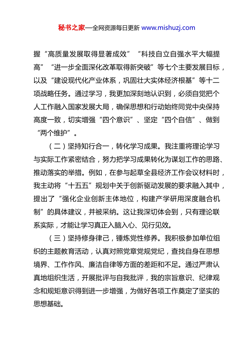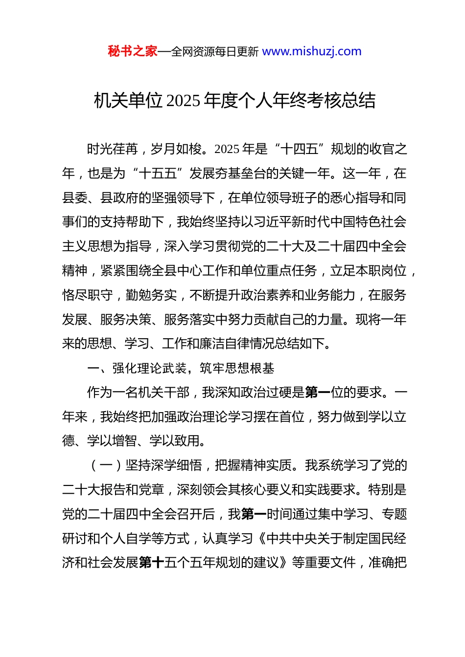 秘书之家—全网资源每日更新 www.mishuzj.com机关单位 2025 年度个人年终考核总结 时光荏苒,岁月如梭。2025 年是“十四五”规划的收官之年,也是为“十五五”发展夯基垒台的关键一年。这一年,在县委、县政府的坚强领导下,在单位领导班子的悉心指导和同事们的支持帮助下,我始终坚持以习近平新时代中国特色社会主义思想为指导,深入学习贯彻党的二十大及二十届四中全会精神,紧紧围绕全县中心工作和单位重点任务,立足本职岗位,恪尽职守,勤勉务实,不断提升政治素养和业务能力,在服务发展、服务决策、服务落实中努力贡献自己的力量。现将一年来的思想、学习、工作和廉洁自律情况总结如下。一、强化理论武装,筑牢思想根基作为一名机关干部,我深知政治过硬是第一位的要求。一年来,我始终把加强政治理论学习摆在首位,努力做到学以立德、学以增智、学以致用。(一)坚持深学细悟,把握精神实质。我系统学习了党的二十大报告和党章,深刻领会其核心要义和实践要求。特别是党的二十届四中全会召开后,我第一时间通过集中学习、专题研讨和个人自学等方式,认真学习《中共中央关于制定国民经济和社会发展第十五个五年规划的建议》等重要文件,准确把秘书之家—全网资源每日更新 www.mishuzj.com握“高质量发展取得显著成效”“科技自立自强水平大幅提高”“进一步全面深化改革取得新突破”等七个主要发展目标,以及“建设现代化产业体系,巩固壮大实体经济根基”等十二项战略任务。通过学习,我更加深刻地认识到,必须自觉把个人工作融入国家发展大局,确保思想和行动始终同党中央保持高度一致,切实增强“四个意识”、坚定“四个自信”、做到“两个维护”。(二)坚持知行合一,转化学习成果。我注重将理论学习与实际工作紧密结合,努力把学习成果转化为谋划工作的思路、推动落实的举措。例如,在参与起草全县经济工作会议材料时,我主动将“十五五”规划中关于创新驱动发展的要求融入其中,提出了“强化企业创新主体地位,构建产学研用深度融合机制”的具体建议,并被采纳。这让我深切体会到,只有理论联系实际,才能让学习真正入脑入心、见行见效。(三)坚持修身律己,锤炼党性修养。我积极参加单位组织的主题教育活动,认真对照党章党规党纪,查找自身在思想境界、工作作风、廉洁自律等方面的差距和不足。通过严肃认真地组织生活,开展批评与自我批评,我的宗旨意识、纪律观念和规矩意识得到进一步增强,为做好各项工作奠定了坚实的思想基础。秘书之家—全网资源每日更新 www.mishuzj.com二、聚焦主责主业,勇于担当作为岗位就是责任,履责必须担当。2025 年,我主要负责综合协调、文稿起草和部分专项工作推进,面对繁重的任务和更高的要求,我始终坚持高标准、严要求,力求把每一项工作都做实、做细、做好。(一)当好参谋助手,文稿服务力求精准高效。文字综合工作是办公室的“中枢神经”,容不得半点马虎。一年来,我牵头或参与起草了各类综合性文稿 120 余篇,累计字数超过 60万字。其中包括县政府工作报告、全县重点工作部署会议讲话、向上级汇报材料等重要文件。在文稿起草过程中,我始终坚持“身在兵位,胸为帅谋”,努力站在领导和全局的高度思考问题。一是注重调查研究。为确保文稿“接地气、有分量”,我多次跟随领导深入乡镇、企业、项目一线开展调研,掌握第一手资料,全年撰写调研报告 8 篇,为领导决策提供了有力参考。二是注重精益求精。每一篇文稿都反复推敲、数易其稿,力求观点鲜明、逻辑严谨、语言精练、数据准确。特别是在起草2026 年春节前全县重点工作部署会议讲话时,我系统梳理了“十四五”时期我县经济社会发展成就,对标党的二十届四中全会精神和“十五五”规划目标,提出了“聚焦高质量发展、坚持以人民为中心、强化党建引领”的工作思路,得到了领导秘书之家—全网资源每日更新 www.mishuzj.com的肯定。(二)抓好统筹协调,保障运转顺畅有序。综合协调是办公室工作的重要职能。我牢固树立“一盘棋”思想,积极发挥承上启下、沟通内外、协调左右的作用。一是高效办文办会。全年承办各类会议 30 余次,从方案拟定、通知发送到材...