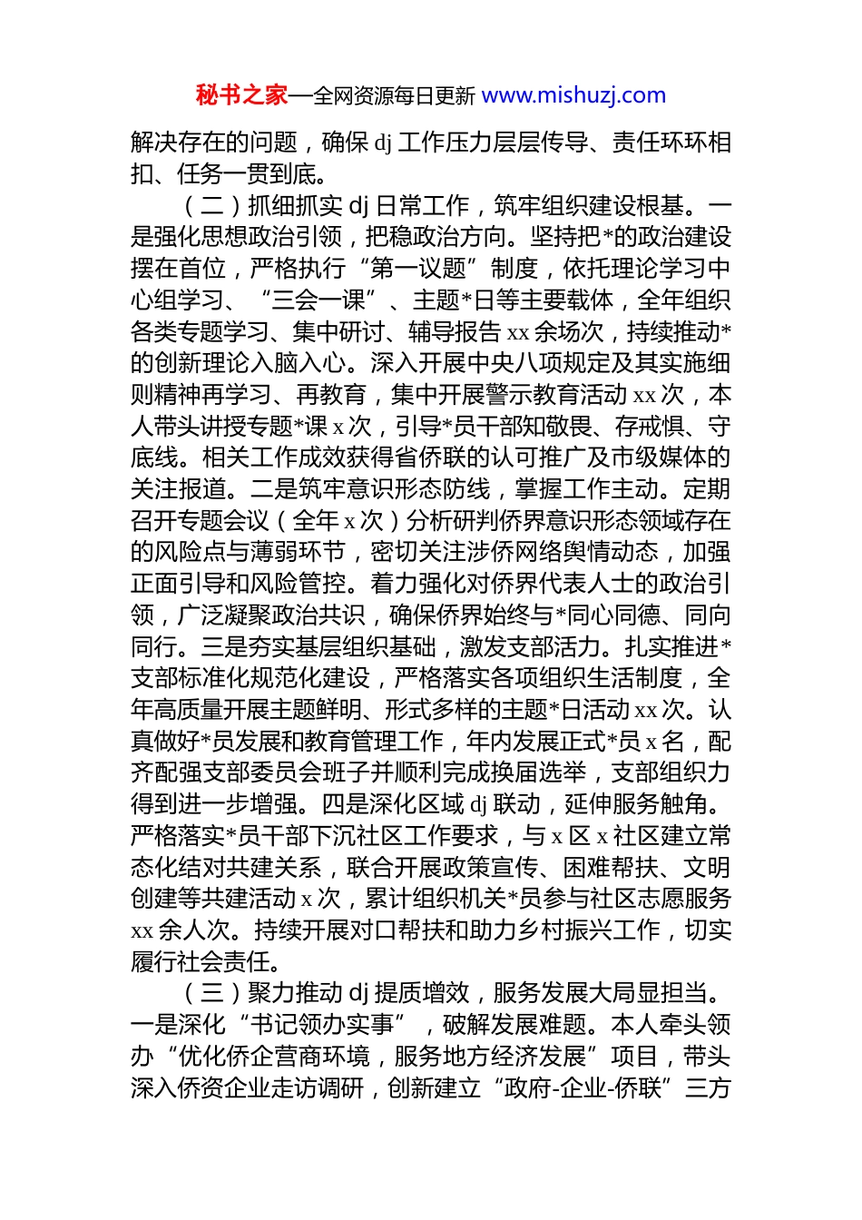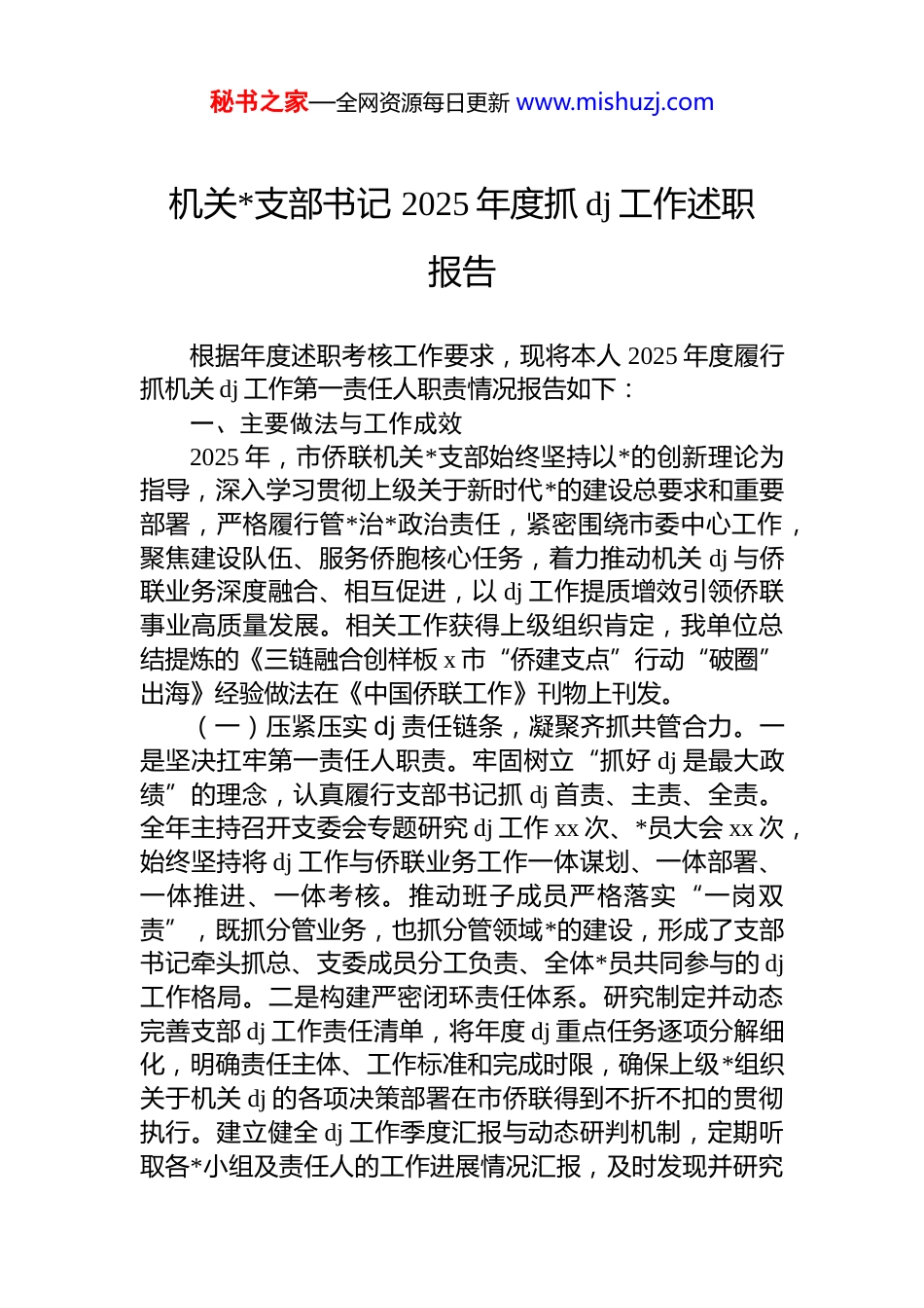 秘书之家—全网资源每日更新 www.mishuzj.com机关*支部书记 2025 年度抓 dj 工作述职报告根据年度述职考核工作要求,现将本人 2025 年度履行抓机关 dj 工作第一责任人职责情况报告如下:一、主要做法与工作成效2025 年,市侨联机关*支部始终坚持以*的创新理论为指导,深入学习贯彻上级关于新时代*的建设总要求和重要部署,严格履行管*治*政治责任,紧密围绕市委中心工作,聚焦建设队伍、服务侨胞核心任务,着力推动机关 dj 与侨联业务深度融合、相互促进,以 dj 工作提质增效引领侨联事业高质量发展。相关工作获得上级组织肯定,我单位总结提炼的《三链融合创样板 x 市“侨建支点”行动“破圈”出海》经验做法在《中国侨联工作》刊物上刊发。(一)压紧压实 dj 责任链条,凝聚齐抓共管合力。一是坚决扛牢第一责任人职责。牢固树立“抓好 dj 是最大政绩”的理念,认真履行支部书记抓 dj 首责、主责、全责。全年主持召开支委会专题研究 dj 工作 xx 次、*员大会 xx 次,始终坚持将 dj 工作与侨联业务工作一体谋划、一体部署、一体推进、一体考核。推动班子成员严格落实“一岗双责”,既抓分管业务,也抓分管领域*的建设,形成了支部书记牵头抓总、支委成员分工负责、全体*员共同参与的 dj工作格局。二是构建严密闭环责任体系。研究制定并动态完善支部 dj 工作责任清单,将年度 dj 重点任务逐项分解细化,明确责任主体、工作标准和完成时限,确保上级*组织关于机关 dj 的各项决策部署在市侨联得到不折不扣的贯彻执行。建立健全 dj 工作季度汇报与动态研判机制,定期听取各*小组及责任人的工作进展情况汇报,及时发现并研究秘书之家—全网资源每日更新 www.mishuzj.com解决存在的问题,确保 dj 工作压力层层传导、责任环环相扣、任务一贯到底。(二)抓细抓实 dj 日常工作,筑牢组织建设根基。一是强化思想政治引领,把稳政治方向。坚持把*的政治建设摆在首位,严格执行“第一议题”制度,依托理论学习中心组学习、“三会一课”、主题*日等主要载体,全年组织各类专题学习、集中研讨、辅导报告 xx 余场次,持续推动*的创新理论入脑入心。深入开展中央八项规定及其实施细则精神再学习、再教育,集中开展警示教育活动 xx 次,本人带头讲授专题*课 x 次,引导*员干部知敬畏、存戒惧、守底线。相关工作成效获得省侨联的认可推广及市级媒体的关注报道。二是筑牢意识形态防线,掌握工作主动。定期召开专题会议(全年 x 次)分析研判侨界意识形态领域存在的风险点与薄弱环节,密切关注涉侨网络舆情动态,加强正面引导和风险管控。着力强化对侨界代表人士的政治引领,广泛凝聚政治共识,确保侨界始终与*同心同德、同向同行。三是夯实基层组织基础,激发支部活力。扎实推进*支部标准化规范化建设,严格落实各项组织生活制度,全年高质量开展主题鲜明、形式多样的主题*日活动 xx 次。认真做好*员发展和教育管理工作,年内发展正式*员 x 名,配齐配强支部委员会班子并顺利完成换届选举,支部组织力得到进一步增强。四是深化区域 dj 联动,延伸服务触角。严格落实*员干部下沉社区工作要求,与 x 区 x 社区建立常态化结对共建关系,联合开展政策宣传、困难帮扶、文明创建等共建活动 x 次,累计组织机关*员参与社区志愿服务xx 余人次。持续开展对口帮扶和助力乡村振兴工作,切实履行社会责任。(三)聚力推动 dj 提质增效,服务发展大局显担当。一是深化“书记领办实事”,破解发展难题。本人牵头领办“优化侨企营商环境,服务地方经济发展”项目,带头深入侨资企业走访调研,创新建立“政府-企业-侨联”三方秘书之家—全网资源每日更新 www.mishuzj.com常态化联动协调机制。组织实施“侨助千企万品出海行动”,累计帮助 xx 家重点侨资企业协调解决在融资信贷、项目用地、人才引进等方面遇到的突出困难 x 个。特别是牵头协调处理一起重大侨企合同纠纷案,经过多方努力成功为企业追索权益损失 xxxx 万余元,该案例入选中国侨联“涉侨纠纷多元化解十大典型案例”,有力维护了侨企合法权益。二是创新“dj+侨建”模式,助推中...