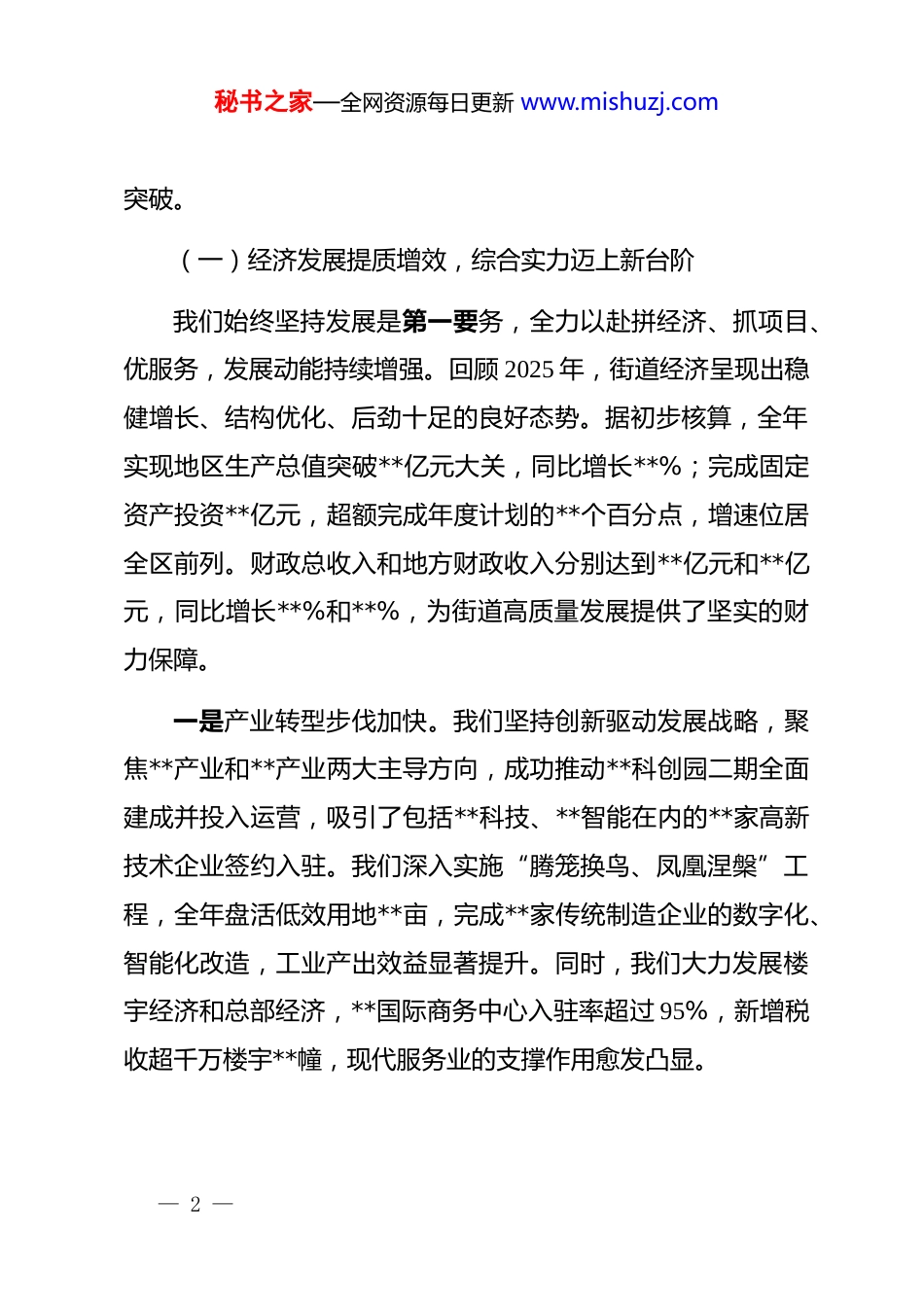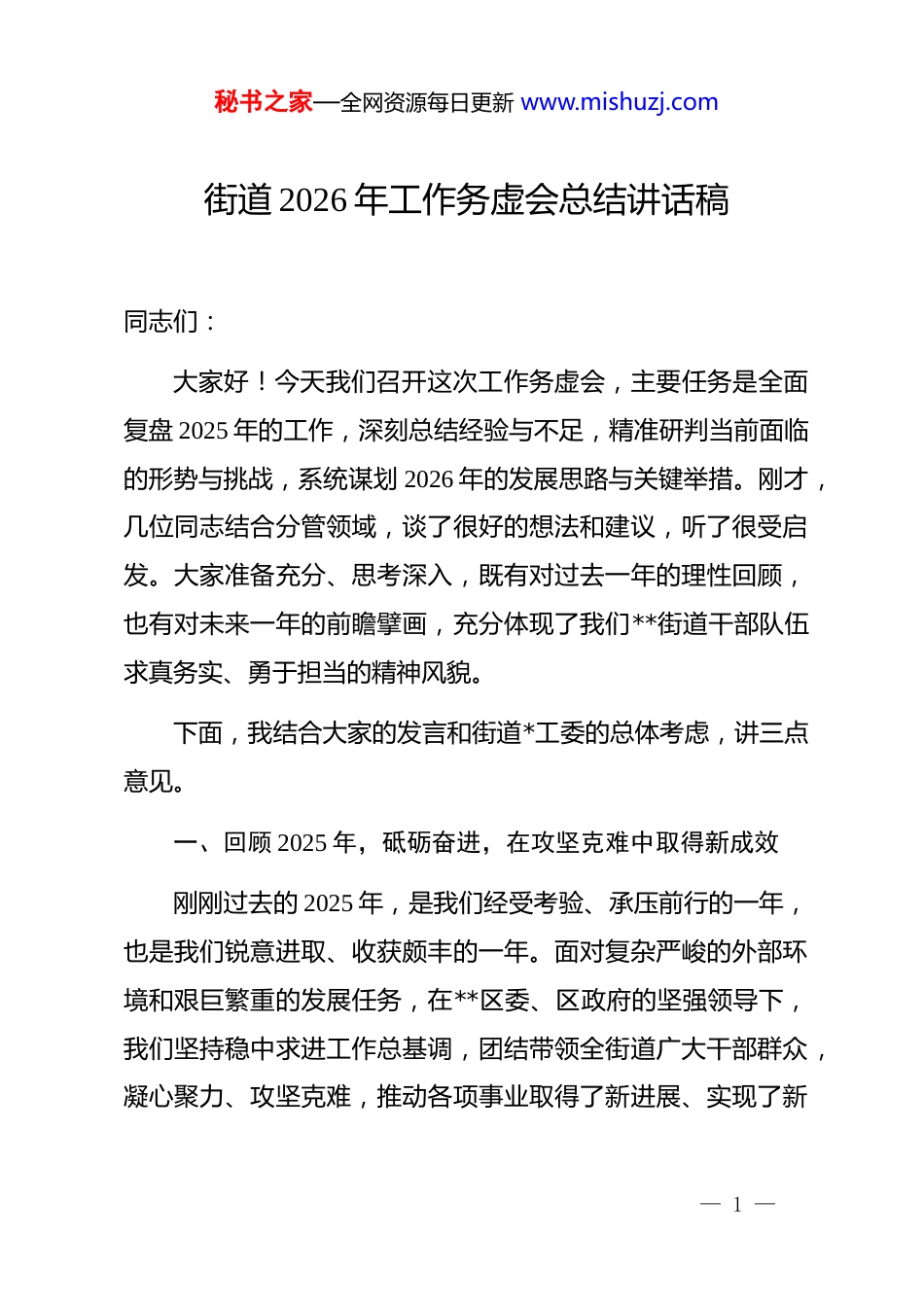 秘书之家—全网资源每日更新 www.mishuzj.com街道 2026 年工作务虚会总结讲话稿同志们:大家好!今天我们召开这次工作务虚会,主要任务是全面复盘 2025 年的工作,深刻总结经验与不足,精准研判当前面临的形势与挑战,系统谋划 2026 年的发展思路与关键举措。刚才,几位同志结合分管领域,谈了很好的想法和建议,听了很受启发。大家准备充分、思考深入,既有对过去一年的理性回顾,也有对未来一年的前瞻擘画,充分体现了我们**街道干部队伍求真务实、勇于担当的精神风貌。下面,我结合大家的发言和街道*工委的总体考虑,讲三点意见。一、回顾 2025 年,砥砺奋进,在攻坚克难中取得新成效刚刚过去的 2025 年,是我们经受考验、承压前行的一年,也是我们锐意进取、收获颇丰的一年。面对复杂严峻的外部环境和艰巨繁重的发展任务,在**区委、区政府的坚强领导下,我们坚持稳中求进工作总基调,团结带领全街道广大干部群众,凝心聚力、攻坚克难,推动各项事业取得了新进展、实现了新— 1 —秘书之家—全网资源每日更新 www.mishuzj.com突破。(一)经济发展提质增效,综合实力迈上新台阶我们始终坚持发展是第一要务,全力以赴拼经济、抓项目、优服务,发展动能持续增强。回顾 2025 年,街道经济呈现出稳健增长、结构优化、后劲十足的良好态势。据初步核算,全年实现地区生产总值突破**亿元大关,同比增长**%;完成固定资产投资**亿元,超额完成年度计划的**个百分点,增速位居全区前列。财政总收入和地方财政收入分别达到**亿元和**亿元,同比增长**%和**%,为街道高质量发展提供了坚实的财力保障。一是产业转型步伐加快。我们坚持创新驱动发展战略,聚焦**产业和**产业两大主导方向,成功推动**科创园二期全面建成并投入运营,吸引了包括**科技、**智能在内的**家高新技术企业签约入驻。我们深入实施“腾笼换鸟、凤凰涅槃”工程,全年盘活低效用地**亩,完成**家传统制造企业的数字化、智能化改造,工业产出效益显著提升。同时,我们大力发展楼宇经济和总部经济,**国际商务中心入驻率超过 95%,新增税收超千万楼宇**幢,现代服务业的支撑作用愈发凸显。— 2 —秘书之家—全网资源每日更新 www.mishuzj.com二是项目攻坚成果丰硕。我们牢固树立“项目为王”理念,建立重大项目“一名领导、一个专班、一抓到底”的工作机制。备受关注的**区重点民生工程一一**大型商业综合体项目,从年初的政策处理到年底的主体结构封顶,我们用“**速度”展现了卓越的执行力。贯穿我街道**区域的**快速路南延工程,涉及**个村社、**户居民的征迁工作,我们坚持以人民为中心的工作导向,实现了和谐征迁、阳光征迁,为项目顺利推进扫清了障碍。全年共计推动**个投资超亿元的重点项目开工建设,为长远发展积蓄了强大势能。三是营商环境持续优化。我们深化“放管服”改革,全面推行“一窗受理、集成服务”模式,企业和群众办事时限平均压缩**%。我们创新建立了“**亲清直通车”政企恳谈会制度,全年举办恳谈会**场,现场解决企业融资、用工、用地等各类难题**余个。我们还积极落实各项惠企政策,全年为各类市场主体减税降费、提供补贴共计**亿元,真正让企业在**安心投资、舒心创业、顺心发展。(二)城乡治理精细智能,人居环境展现新面貌我们坚持以“绣花”功夫推进城市管理,城乡面貌和治理水平得到系统性提升。— 3 —秘书之家—全网资源每日更新 www.mishuzj.com一是“智慧大脑”赋能治理现代化。我们投入**万元,对街道社会治理综合指挥中心进行了全面升级,成功上线“**智治”平台 2.0 版本。该平台整合了城管、综治、安监、环保等**个部门的数据端口,通过**个高清感知探头和无人机巡查系统,实现了对辖区内乱停车、垃圾暴露、占道经营等问题的秒级发现、分钟级处置。2025 年,平台累计自动派单处置各类城市管理事件**万余件,处置率达 99.8%,有效提升了城市管理的效率和精度。二是城乡环境品质全面提升。我们深入开展全国文明城市创建巩固提升行动,对**路、**路等**条主次干道进行“美颜”,完成**个老旧小区的综合改造整治工程,惠及居民**户。我们启动了“美丽河道...