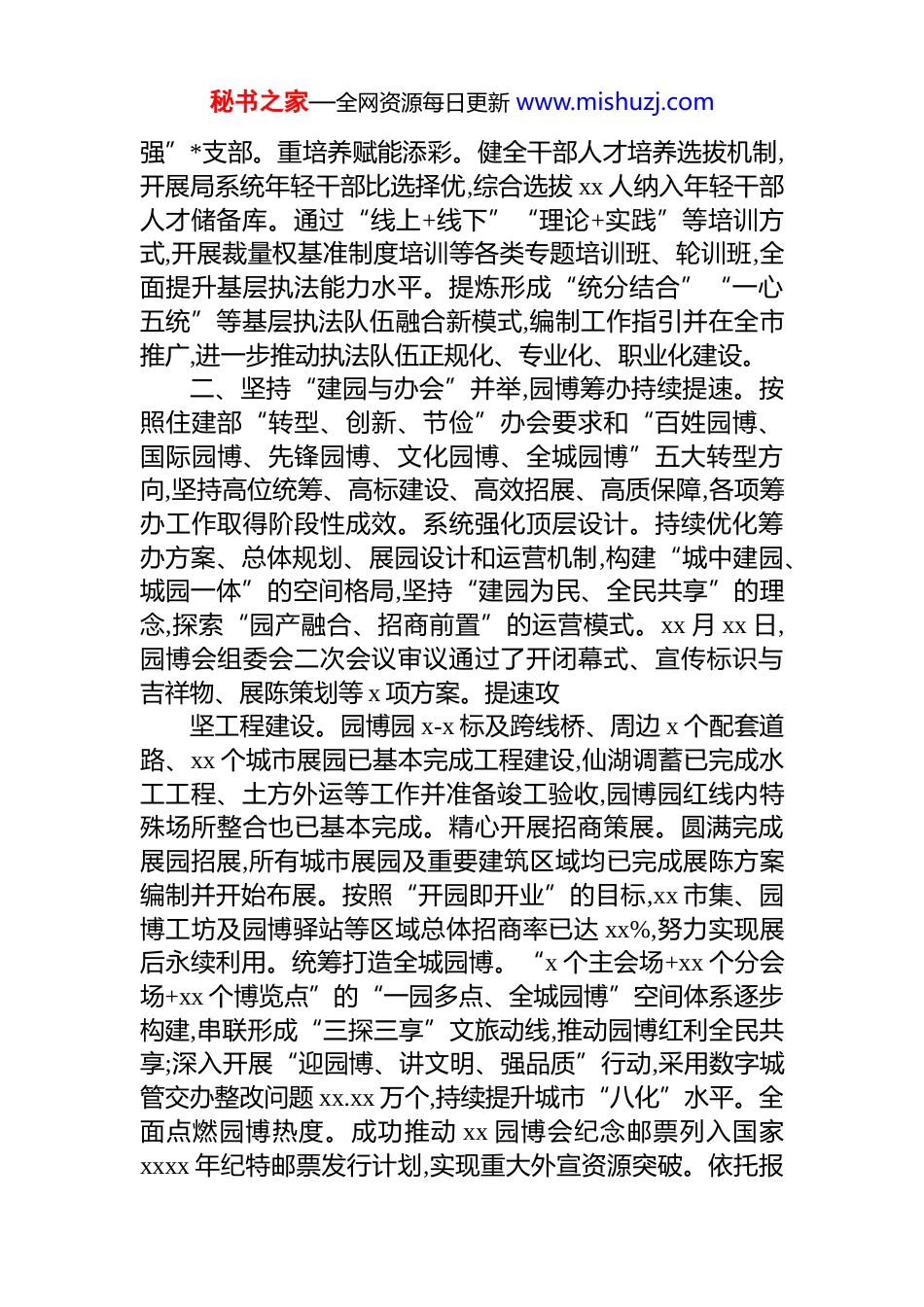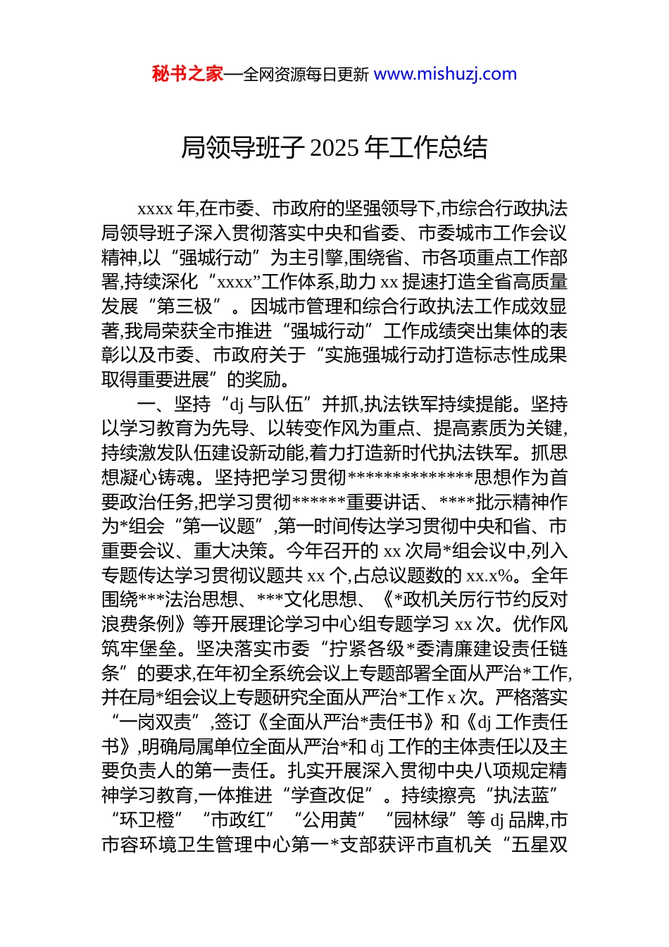 秘书之家—全网资源每日更新 www.mishuzj.com局领导班子 2025 年工作总结xxxx 年,在市委、市政府的坚强领导下,市综合行政执法局领导班子深入贯彻落实中央和省委、市委城市工作会议精神,以“强城行动”为主引擎,围绕省、市各项重点工作部署,持续深化“xxxx”工作体系,助力 xx 提速打造全省高质量发展“第三极”。因城市管理和综合行政执法工作成效显著,我局荣获全市推进“强城行动”工作成绩突出集体的表彰以及市委、市政府关于“实施强城行动打造标志性成果取得重要进展”的奖励。一、坚持“dj 与队伍”并抓,执法铁军持续提能。坚持以学习教育为先导、以转变作风为重点、提高素质为关键,持续激发队伍建设新动能,着力打造新时代执法铁军。抓思想凝心铸魂。坚持把学习贯彻**************思想作为首要政治任务,把学习贯彻******重要讲话、****批示精神作为*组会“第一议题”,第一时间传达学习贯彻中央和省、市重要会议、重大决策。今年召开的 xx 次局*组会议中,列入专题传达学习贯彻议题共 xx 个,占总议题数的 xx.x%。全年围绕***法治思想、***文化思想、《*政机关厉行节约反对浪费条例》等开展理论学习中心组专题学习 xx 次。优作风筑牢堡垒。坚决落实市委“拧紧各级*委清廉建设责任链条”的要求,在年初全系统会议上专题部署全面从严治*工作,并在局*组会议上专题研究全面从严治*工作 x 次。严格落实“一岗双责”,签订《全面从严治*责任书》和《dj 工作责任书》,明确局属单位全面从严治*和 dj 工作的主体责任以及主要负责人的第一责任。扎实开展深入贯彻中央八项规定精神学习教育,一体推进“学查改促”。持续擦亮“执法蓝”“环卫橙”“市政红”“公用黄”“园林绿”等 dj 品牌,市市容环境卫生管理中心第一*支部获评市直机关“五星双秘书之家—全网资源每日更新 www.mishuzj.com强”*支部。重培养赋能添彩。健全干部人才培养选拔机制,开展局系统年轻干部比选择优,综合选拔 xx 人纳入年轻干部人才储备库。通过“线上+线下”“理论+实践”等培训方式,开展裁量权基准制度培训等各类专题培训班、轮训班,全面提升基层执法能力水平。提炼形成“统分结合”“一心五统”等基层执法队伍融合新模式,编制工作指引并在全市推广,进一步推动执法队伍正规化、专业化、职业化建设。二、坚持“建园与办会”并举,园博筹办持续提速。按照住建部“转型、创新、节俭”办会要求和“百姓园博、国际园博、先锋园博、文化园博、全城园博”五大转型方向,坚持高位统筹、高标建设、高效招展、高质保障,各项筹办工作取得阶段性成效。系统强化顶层设计。持续优化筹办方案、总体规划、展园设计和运营机制,构建“城中建园、城园一体”的空间格局,坚持“建园为民、全民共享”的理念,探索“园产融合、招商前置”的运营模式。xx 月 xx 日,园博会组委会二次会议审议通过了开闭幕式、宣传标识与吉祥物、展陈策划等 x 项方案。提速攻坚工程建设。园博园 x-x 标及跨线桥、周边 x 个配套道路、xx 个城市展园已基本完成工程建设,仙湖调蓄已完成水工工程、土方外运等工作并准备竣工验收,园博园红线内特殊场所整合也已基本完成。精心开展招商策展。圆满完成展园招展,所有城市展园及重要建筑区域均已完成展陈方案编制并开始布展。按照“开园即开业”的目标,xx 市集、园博工坊及园博驿站等区域总体招商率已达 xx%,努力实现展后永续利用。统筹打造全城园博。“x 个主会场+xx 个分会场+xx 个博览点”的“一园多点、全城园博”空间体系逐步构建,串联形成“三探三享”文旅动线,推动园博红利全民共享;深入开展“迎园博、讲文明、强品质”行动,采用数字城管交办整改问题 xx.xx 万个,持续提升城市“八化”水平。全面点燃园博热度。成功推动 xx 园博会纪念邮票列入国家xxxx 年纪特邮票发行计划,实现重大外宣资源突破。依托报秘书之家—全网资源每日更新 www.mishuzj.com纸、电视、网站等全媒体矩阵,推出 xx 园博系列专题报道xxxx 余篇。成功引进 x 只 xx 落户 xx 动物园博览点,打造“xx 热”顶流 ip。策划推出“x+x+xx+n”系列体验活动,努力把园博会打造成为 xx 市民全域联动的城...