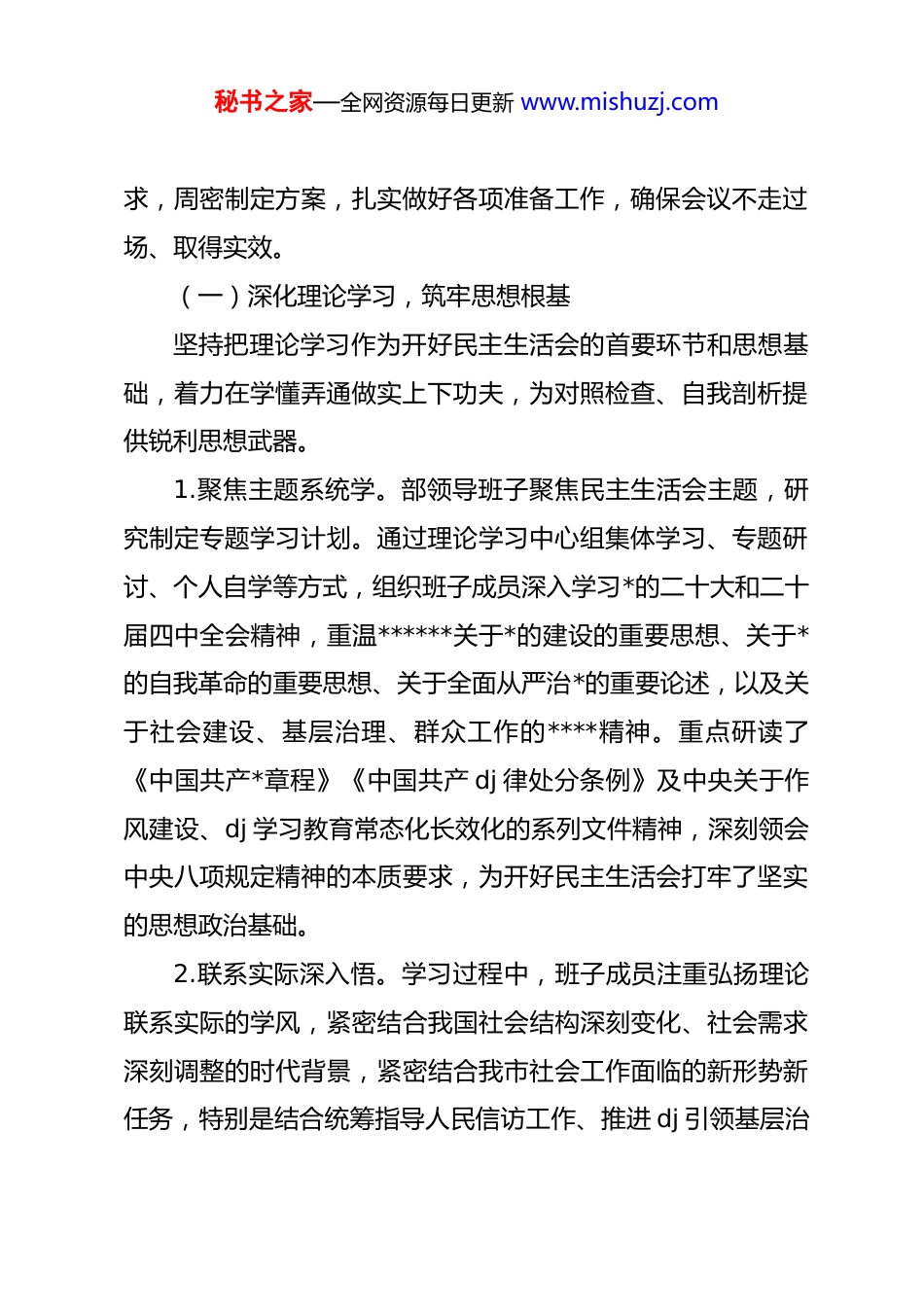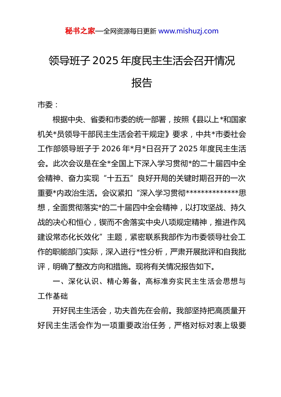 秘书之家—全网资源每日更新 www.mishuzj.com领导班子 2025 年度民主生活会召开情况报告市委:根据中央、省委和市委的统一部署,按照《县以上*和国家机关*员领导干部民主生活会若干规定》要求,中共*市委社会工作部领导班子于 2026 年*月*日召开了 2025 年度民主生活会。此次会议是在全*全国上下深入学习贯彻*的二十届四中全会精神、奋力实现“十五五”良好开局的关键时期召开的一次重要*内政治生活。会议紧扣“深入学习贯彻**************思想,全面贯彻落实*的二十届四中全会精神,以打攻坚战、持久战的决心和恒心,锲而不舍落实中央八项规定精神,推进作风建设常态化长效化”主题,紧密联系我部作为市委领导社会工作的职能部门实际,深入进行*性分析,严肃开展批评和自我批评,明确了整改方向和措施。现将有关情况报告如下。一、深化认识、精心筹备,高标准夯实民主生活会思想与工作基础开好民主生活会,功夫首先在会前。我部坚持把高质量开好民主生活会作为一项重要政治任务,严格对标对表上级要秘书之家—全网资源每日更新 www.mishuzj.com求,周密制定方案,扎实做好各项准备工作,确保会议不走过场、取得实效。(一)深化理论学习,筑牢思想根基坚持把理论学习作为开好民主生活会的首要环节和思想基础,着力在学懂弄通做实上下功夫,为对照检查、自我剖析提供锐利思想武器。1.聚焦主题系统学。部领导班子聚焦民主生活会主题,研究制定专题学习计划。通过理论学习中心组集体学习、专题研讨、个人自学等方式,组织班子成员深入学习*的二十大和二十届四中全会精神,重温******关于*的建设的重要思想、关于*的自我革命的重要思想、关于全面从严治*的重要论述,以及关于社会建设、基层治理、群众工作的****精神。重点研读了《中国共产*章程》《中国共产 dj 律处分条例》及中央关于作风建设、dj 学习教育常态化长效化的系列文件精神,深刻领会中央八项规定精神的本质要求,为开好民主生活会打牢了坚实的思想政治基础。2.联系实际深入悟。学习过程中,班子成员注重弘扬理论联系实际的学风,紧密结合我国社会结构深刻变化、社会需求深刻调整的时代背景,紧密结合我市社会工作面临的新形势新任务,特别是结合统筹指导人民信访工作、推进 dj 引领基层治秘书之家—全网资源每日更新 www.mishuzj.com理、领导行业协会商会 dj 工作、加强社会工作人才队伍建设等核心职能,深入思考如何将*的创新理论转化为推动社会工作高质量发展的具体思路和有效举措,努力做到学思用贯通、知信行统一。3.对标对表找差距。通过学习,班子成员进一步深刻认识到社会工作部作为*委部门,在巩固*的执政基础、联系服务群众、化解社会矛盾、促进社会和谐中的特殊重要责任。大家自觉对照*中央的决策部署和省委市委的工作要求,对照*章*规dj,对照初心使命,对照人民群众对美好生活的新期待,深入查找在政治站位、思想观念、能力作风等方面存在的差距和不足,明确了对照检查的坐标和方向,增强了开展批评和自我批评的自觉性与针对性。(二)广泛征求意见,开门纳谏听真言坚持发扬民主、开门搞活动,以真诚态度广泛听取各方面意见建议,确保查摆问题有的放矢、符合实际。1.畅通渠道全面听。通过发放征求意见函、设置意见箱、召开座谈会、个别访谈、实地调研等多种形式,广泛征求市直相关部门、县(区)*委社会工作部门、部分乡镇(街道)和村(社区)*组织、相关行业协会商会、非公企业和社会组织代表、信访群众代表以及部机关*员干部的意见建议。特别是利用秘书之家—全网资源每日更新 www.mishuzj.com“*社会工作”微信公众号等线上平台,拓展征求意见的广度和便捷度。2.聚焦职能重点听。紧扣我部“统筹指导人民信访工作、推进 dj 引领基层治理、指导‘两企三新’dj、加强社工人才队伍建设”等核心职责,设计更具针对性的征求意见内容。重点围绕我部领导班子和班子成员在贯彻落实上级决策部署、践行群众路线、改进工作作风、提升履职效能、服务基层群众、防范化解社会风险、廉洁自律等方面的情况,听取真实声音,收集原汁原味的意见建议。3.梳理反馈原汁味。对征求到的意见建议,安排专人进...