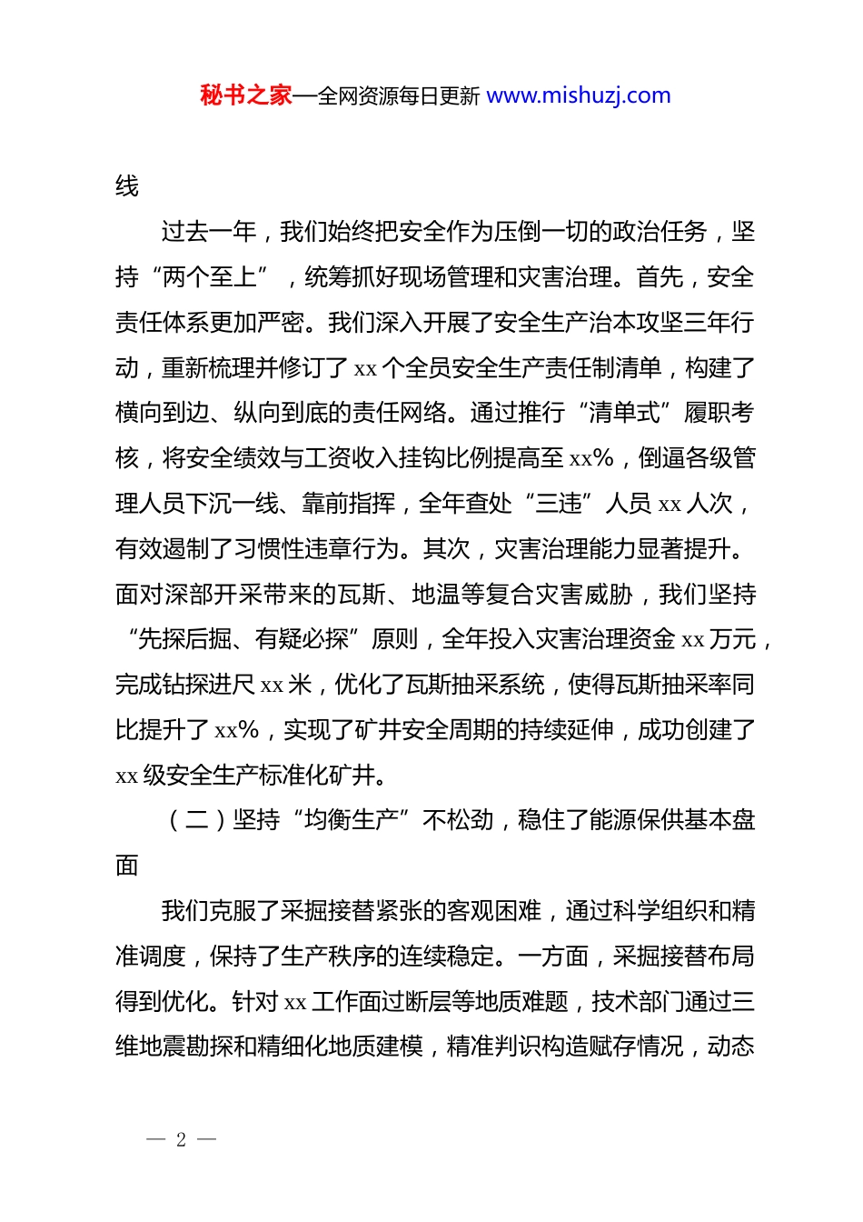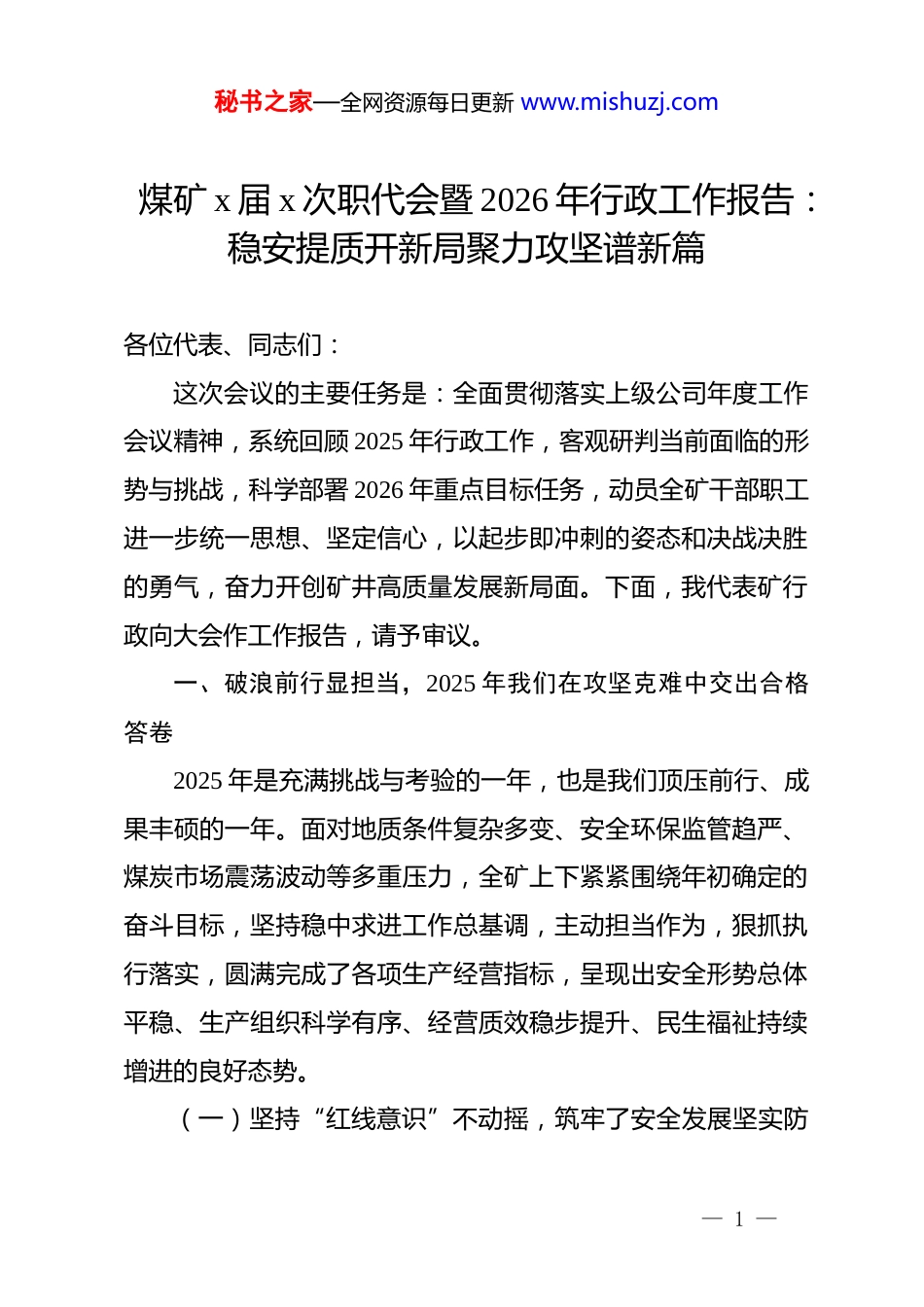 秘书之家—全网资源每日更新 www.mishuzj.com煤矿 x 届 x 次职代会暨 2026 年行政工作报告:稳安提质开新局聚力攻坚谱新篇各位代表、同志们:这次会议的主要任务是:全面贯彻落实上级公司年度工作会议精神,系统回顾 2025 年行政工作,客观研判当前面临的形势与挑战,科学部署 2026 年重点目标任务,动员全矿干部职工进一步统一思想、坚定信心,以起步即冲刺的姿态和决战决胜的勇气,奋力开创矿井高质量发展新局面。下面,我代表矿行政向大会作工作报告,请予审议。一、破浪前行显担当,2025 年我们在攻坚克难中交出合格答卷2025 年是充满挑战与考验的一年,也是我们顶压前行、成果丰硕的一年。面对地质条件复杂多变、安全环保监管趋严、煤炭市场震荡波动等多重压力,全矿上下紧紧围绕年初确定的奋斗目标,坚持稳中求进工作总基调,主动担当作为,狠抓执行落实,圆满完成了各项生产经营指标,呈现出安全形势总体平稳、生产组织科学有序、经营质效稳步提升、民生福祉持续增进的良好态势。(一)坚持“红线意识”不动摇,筑牢了安全发展坚实防— 1 —秘书之家—全网资源每日更新 www.mishuzj.com线过去一年,我们始终把安全作为压倒一切的政治任务,坚持“两个至上”,统筹抓好现场管理和灾害治理。首先,安全责任体系更加严密。我们深入开展了安全生产治本攻坚三年行动,重新梳理并修订了 xx 个全员安全生产责任制清单,构建了横向到边、纵向到底的责任网络。通过推行“清单式”履职考核,将安全绩效与工资收入挂钩比例提高至 xx%,倒逼各级管理人员下沉一线、靠前指挥,全年查处“三违”人员 xx 人次,有效遏制了习惯性违章行为。其次,灾害治理能力显著提升。面对深部开采带来的瓦斯、地温等复合灾害威胁,我们坚持“先探后掘、有疑必探”原则,全年投入灾害治理资金 xx 万元,完成钻探进尺 xx 米,优化了瓦斯抽采系统,使得瓦斯抽采率同比提升了 xx%,实现了矿井安全周期的持续延伸,成功创建了xx 级安全生产标准化矿井。(二)坚持“均衡生产”不松劲,稳住了能源保供基本盘面我们克服了采掘接替紧张的客观困难,通过科学组织和精准调度,保持了生产秩序的连续稳定。一方面,采掘接替布局得到优化。针对 xx 工作面过断层等地质难题,技术部门通过三维地震勘探和精细化地质建模,精准判识构造赋存情况,动态— 2 —秘书之家—全网资源每日更新 www.mishuzj.com调整回采工艺,最大限度减少了地质构造对生产的影响。同时,我们大力推广快速掘进技术,引进了 xx 套智能掘进设备,使得单进水平提升了 xx%,有效缓解了“采掘失衡”的矛盾。另一方面,生产组织效率大幅提高。通过实施“精益生产”策略,建立了生产环节全流程写实制度,对检修、运输、提升等关键环节进行“卡表”分析,找准制约效率的瓶颈点,实施了 xx 项技术改造,矿井原煤产量达到 xx 万吨,掘进进尺完成 xx 米,均创历史同期最好水平,有力保障了电煤供应任务。(三)坚持“算账经营”不懈怠,提升了内涵发展经济质效面对市场下行压力,我们牢固树立过“紧日子”思想,向管理要效益,向成本要利润。一是全面预算管理刚性约束进一步增强。我们将全年各项费用指标层层分解到区队、班组乃至个人,建立了“日清日结、月度分析”的成本管控机制。通过实施内部市场化结算,把每个班组变成一个独立的核算单元,职工不仅会干活,更会算账,全年可控成本同比下降了 xx%。二是物资管控更加精细高效。深入开展“修旧利废”活动,建立了废旧物资回收复用激励机制,对废旧锚杆、托盘、电缆等物资进行分类回收和加工再利用,全年回收复用价值达 xx 万元。同时,严控非生产性支出,压缩办公、差旅等费用 xx%,将有— 3 —秘书之家—全网资源每日更新 www.mishuzj.com限的资金真正用在了刀刃上,企业抗风险能力显著增强。(四)坚持“以人为本”不离心,构建了和谐幸福温暖家园我们始终坚持发展为了职工、发展依靠职工,让改革发展成果更多更公平惠及全体职工。其一,生活环境品质显著改善。针对职工反映强烈的“两堂一舍”问题,我们投入专项资金 xx万元,对职工食堂进行了标准化...