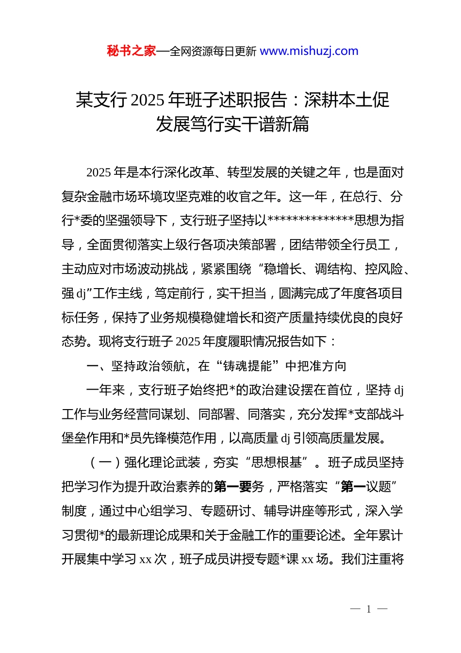 秘书之家—全网资源每日更新 www.mishuzj.com某支行 2025 年班子述职报告:深耕本土促发展笃行实干谱新篇2025 年是本行深化改革、转型发展的关键之年,也是面对复杂金融市场环境攻坚克难的收官之年。这一年,在总行、分行*委的坚强领导下,支行班子坚持以**************思想为指导,全面贯彻落实上级行各项决策部署,团结带领全行员工,主动应对市场波动挑战,紧紧围绕“稳增长、调结构、控风险、强 dj”工作主线,笃定前行,实干担当,圆满完成了年度各项目标任务,保持了业务规模稳健增长和资产质量持续优良的良好态势。现将支行班子 2025 年度履职情况报告如下:一、坚持政治领航,在“铸魂提能”中把准方向一年来,支行班子始终把*的政治建设摆在首位,坚持 dj工作与业务经营同谋划、同部署、同落实,充分发挥*支部战斗堡垒作用和*员先锋模范作用,以高质量 dj 引领高质量发展。(一)强化理论武装,夯实“思想根基”。班子成员坚持把学习作为提升政治素养的第一要务,严格落实“第一议题”制度,通过中心组学习、专题研讨、辅导讲座等形式,深入学习贯彻*的最新理论成果和关于金融工作的重要论述。全年累计开展集中学习 xx 次,班子成员讲授专题*课 xx 场。我们注重将— 1 —秘书之家—全网资源每日更新 www.mishuzj.com理论学习成果转化为推动工作的强大动力,在学习中找立场、找观点、找方法,确保在思想上、政治上、行动上同*中央保持高度一致,不断提高政治判断力、政治领悟力、政治执行力。(二)筑牢组织堡垒,激发“红色动能”。我们大力推进*支部标准化规范化建设,严格落实“三会一课”、主题*日等组织生活制度,不断丰富 dj 活动载体。深入开展“dj+业务”融合行动,设立*员示范岗 xx 个,组建*员突击队 xx 支,在旺季营销、不良清收等急难险重任务中亮身份、比作为。通过开展“两优一先”评选表彰,树立典型,弘扬正气,有效增强了*组织的凝聚力和战斗力,形成了“抓 dj 促发展、抓发展强 dj”的良性循环。二、聚焦服务实体,在“提质增效”中通过大考面对日益激烈的同业竞争,支行班子始终坚守金融工作的政治性和人民性,回归本源,专注主业,持续加大对实体经济的支持力度,推动各项业务指标实现新突破。(一)深耕存款市场,做大“资金池子”。坚持“存款立行”理念不动摇,我们紧盯市场动态,精准施策,全力打好存款营销攻坚战。一方面,深挖源头活水,通过加强与财政、社保、医院等机构类客户的合作,大力拓展低成本结算资金,全年新增机构存款 xx 亿元;另一方面,做优零售服务,依托网点— 2 —秘书之家—全网资源每日更新 www.mishuzj.com阵地优势,开展形式多样的客户回馈活动,提升客户粘性,同时组建外拓小分队,进社区、进企业、进商圈,积极拓展代发工资、聚合支付等业务,有效沉淀了个人储蓄存款。截至年末,全行各项存款余额达 xx 亿元,较年初增长 xx%,市场份额稳步提升。(二)优化信贷投向,通过“精准滴灌”。我们紧跟国家产业政策导向,持续优化信贷结构,加大对制造业、普惠小微、绿色金融等重点领域的支持力度。针对辖内特色产业集群,我们创新推出定制化信贷产品,简化审批流程,提高放款效率,切实解决企业“融资难、融资贵”问题。全年累计投放实体贷款 xx 亿元,其中普惠型小微企业贷款增速达 xx%,高于各项贷款平均增速。同时,积极响应乡村振兴战略,加大涉农贷款投放,为农村基础设施建设和特色农业发展注入了金融活水,展现了国有金融企业的责任担当。(三)创新服务模式,拓宽“获客渠道”。为适应客户日益多元化的金融需求,我们加快数字化转型步伐,大力推广线上金融服务。依托手机银行、网上银行等电子渠道,为客户提供“7×24 小时”不间断服务,提升业务办理便捷度。我们还积极搭建“金融+生活”场景生态,与周边商超、餐饮、洗车行等商户开展异业联盟合作,打造特色商圈优惠活动,有效提升— 3 —秘书之家—全网资源每日更新 www.mishuzj.com了获客活客能力。全年新增手机银行活跃用户 xx 户,电子银行替代率达到 xx%,服务质效显著增强。三、深化内控合规,在“防微杜渐”中...