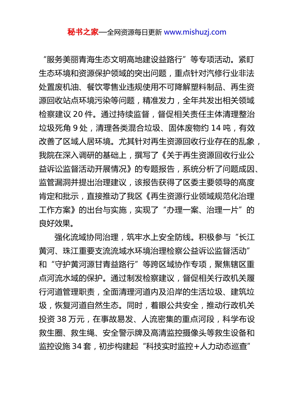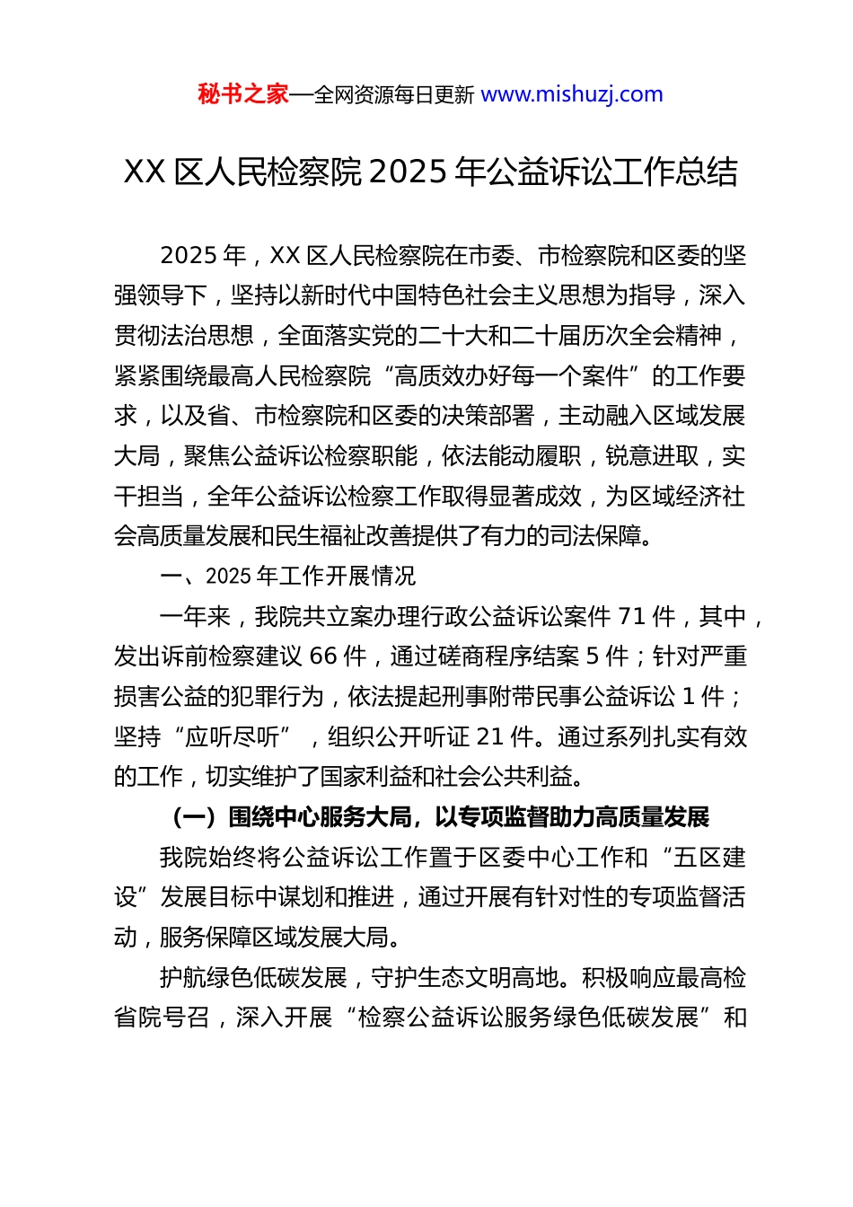 秘书之家—全网资源每日更新 www.mishuzj.comXX 区人民检察院 2025 年公益诉讼工作总结2025 年,XX 区人民检察院在市委、市检察院和区委的坚强领导下,坚持以新时代中国特色社会主义思想为指导,深入贯彻法治思想,全面落实党的二十大和二十届历次全会精神,紧紧围绕最高人民检察院“高质效办好每一个案件”的工作要求,以及省、市检察院和区委的决策部署,主动融入区域发展大局,聚焦公益诉讼检察职能,依法能动履职,锐意进取,实干担当,全年公益诉讼检察工作取得显著成效,为区域经济社会高质量发展和民生福祉改善提供了有力的司法保障。一、2025 年工作开展情况一年来,我院共立案办理行政公益诉讼案件 71 件,其中,发出诉前检察建议 66 件,通过磋商程序结案 5 件;针对严重损害公益的犯罪行为,依法提起刑事附带民事公益诉讼 1 件;坚持“应听尽听”,组织公开听证 21 件。通过系列扎实有效的工作,切实维护了国家利益和社会公共利益。(一)围绕中心服务大局,以专项监督助力高质量发展我院始终将公益诉讼工作置于区委中心工作和“五区建设”发展目标中谋划和推进,通过开展有针对性的专项监督活动,服务保障区域发展大局。护航绿色低碳发展,守护生态文明高地。积极响应最高检省院号召,深入开展“检察公益诉讼服务绿色低碳发展”和秘书之家—全网资源每日更新 www.mishuzj.com“服务美丽青海生态文明高地建设益路行”等专项活动。紧盯生态环境和资源保护领域的突出问题,重点针对汽修行业非法处置废机油、餐饮零售业违规使用不可降解塑料制品、再生资源回收站点环境污染等问题,精准发力,全年共发出相关领域检察建议 20 件。通过持续监督,督促相关责任主体清理整治垃圾死角 9 处,清理各类混合垃圾、固体废物约 14 吨,有效改善了区域人居环境。尤其针对再生资源回收行业存在的乱象,我院在深入调研的基础上,撰写了《关于再生资源回收行业公益诉讼监督活动开展情况》的专题报告,系统分析了问题成因、监管漏洞并提出治理建议,该报告获得了区委主要领导的高度肯定和批示,直接推动了我区《再生资源行业领域规范化治理工作方案》的出台与实施,实现了“办理一案、治理一片”的良好效果。强化流域协同治理,筑牢水上安全防线。积极参与“长江黄河、珠江重要支流流域水环境治理检察公益诉讼监督活动”和“守护黄河源甘青益路行”等跨区域协作专项,聚焦辖区重点河流水域的保护。通过制发检察建议,督促相关行政机关履行河道管理职责,全面清理河道内及沿岸的生活垃圾、建筑垃圾,恢复河道自然生态。同时,着眼公共安全,推动行政机关投资 38 万元,在事故易发、人流密集的重点河段,科学布设救生圈、救生绳、安全警示牌及高清监控摄像头等救生设备和监控设施 34 套,初步构建起“科技实时监控+人力动态巡查”秘书之家—全网资源每日更新 www.mishuzj.com相结合的立体化水上安全防控体系,显著提升了应对水上突发事件的响应速度和处置能力。聚焦高危新兴领域,服务保障安全生产。坚持问题导向,将公益诉讼监督触角延伸至安全生产领域,重点关注游泳馆所、餐饮企业、新兴服务业态等存在的安全风险。针对部分游泳场所未按规定设置深水区警戒线、安全员配备不足,餐饮企业未安装或规范使用可燃气体报警装置,部分“月子中心”超范围违规提供诊疗服务,以及电动汽车充电站消防设施配备不达标、安全管理不规范等问题,及时立案调查,向负有监管职责的行政部门发出检察建议 15 件,督促其加强日常监督检查,压实企业主体责任,有效消除了诸多安全隐患,切实维护了人民群众的生命财产安全,以检察履职助力更高水平的平安 XX 建设。(二)回应关切司法为民,以精准监督守护美好生活我院始终践行以人民为中心的发展思想,聚焦人民群众在食品药品安全、个人信息保护、消费权益等方面的急难愁盼问题,持续加大监督力度。守护“舌尖上的安全”,深化食药领域监督。扎实开展“食药安全益路行”专项活动,围绕网络餐饮、药品零售、基层医疗、农产品销售等关键环节,精准监督。针对外卖平台商家销售腐败变质、过期食品,部分药店无处方销售处方药、执...