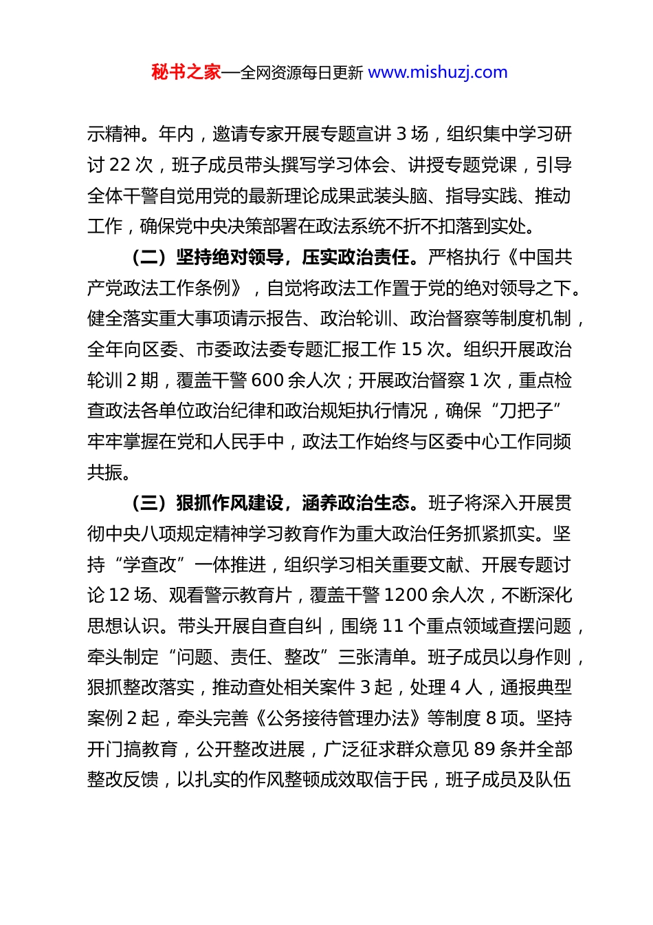 秘书之家—全网资源每日更新 www.mishuzj.comXX 区委政法委领导班子 2025 年度述职述廉报告2025 年,在区委的坚强领导和市委政法委的有力指导下,XX 区委政法委领导班子坚持以习近平新时代中国特色社会主义思想为指导,深入学习贯彻党的二十届四中全会精神及习近平法治思想,全面落实中央、省委、市委关于政法工作的各项决策部署,紧紧围绕市委“讲政治、强基础、治源头、育环境、重公正、抓改革、保平安、创一流”工作思路,以扎实开展深入贯彻中央八项规定精神学习教育为抓手,团结带领全区政法干警忠诚履职、锐意进取、真抓实干,全力护航区域经济社会高质量发展,平安 XX、法治 XX 建设取得新成效。现将领导班子一年来履职尽责和廉洁自律情况报告如下:一、强化政治引领,把稳政法工作正确方向领导班子始终将政治建设摆在首位,深刻领悟“两个确立”的决定性意义,坚决做到“两个维护”,确保政法工作始终沿着正确政治方向前进。(一)深化理论武装,筑牢思想根基。坚持把学习贯彻党的创新理论作为首要政治任务。严格执行“第一议题”制度,通过理论中心组学习、“三会一课”、政法大讲堂等多种形式,组织班子成员和全体干警持续深入学习党的二十届四中全会精神、习近平法治思想以及习近平总书记对政法工作系列重要指秘书之家—全网资源每日更新 www.mishuzj.com示精神。年内,邀请专家开展专题宣讲 3 场,组织集中学习研讨 22 次,班子成员带头撰写学习体会、讲授专题党课,引导全体干警自觉用党的最新理论成果武装头脑、指导实践、推动工作,确保党中央决策部署在政法系统不折不扣落到实处。(二)坚持绝对领导,压实政治责任。严格执行《中国共产党政法工作条例》,自觉将政法工作置于党的绝对领导之下。健全落实重大事项请示报告、政治轮训、政治督察等制度机制,全年向区委、市委政法委专题汇报工作 15 次。组织开展政治轮训 2 期,覆盖干警 600 余人次;开展政治督察 1 次,重点检查政法各单位政治纪律和政治规矩执行情况,确保“刀把子”牢牢掌握在党和人民手中,政法工作始终与区委中心工作同频共振。(三)狠抓作风建设,涵养政治生态。班子将深入开展贯彻中央八项规定精神学习教育作为重大政治任务抓紧抓实。坚持“学查改”一体推进,组织学习相关重要文献、开展专题讨论 12 场、观看警示教育片,覆盖干警 1200 余人次,不断深化思想认识。带头开展自查自纠,围绕 11 个重点领域查摆问题,牵头制定“问题、责任、整改”三张清单。班子成员以身作则,狠抓整改落实,推动查处相关案件 3 起,处理 4 人,通报典型案例 2 起,牵头完善《公务接待管理办法》等制度 8 项。坚持开门搞教育,公开整改进展,广泛征求群众意见 89 条并全部整改反馈,以扎实的作风整顿成效取信于民,班子成员及队伍秘书之家—全网资源每日更新 www.mishuzj.com的纪律意识、规矩意识显著增强。二、忠诚履职尽责,全力维护安全稳定大局领导班子牢固树立总体国家安全观,统筹发展和安全,带领全区政法系统坚决履行维护国家政治安全、确保社会大局稳定、促进社会公平正义、保障人民安居乐业的主要职责。(一)坚决捍卫政治安全。牵头实施“反制”“铸墙”“净土”“攻心”四大工程,依法打击处置邪教组织和非法宗教活动。创新推动国家安全人民防线建设与基层网格深度融合,出台《网格员国家安全工作积分制管理办法》,试点“微网格+反奸防谍”模式,相关工作获《XX 日报》报道,有效筑牢了政治安全屏障。(二)全力防控社会风险。主导构建“1+5+N”情报预警机制,对重点警情开展“回头看”,落实“一警一格”包联化解,严防风险升级。圆满完成了全国“两会”、中秋国庆等重要节点维稳安保任务。部署开展“除患”专项行动,深入排查整治危化品、消防等重点领域安全隐患 156 处,社会面管控能力持续提升。(三)纵深推进扫黑除恶。坚持常态化推进扫黑除恶斗争,班子成员靠前指挥,把线索核查作为关键,全年办结转办线索26 条。聚焦把持基层政权、扰乱市场秩序等重点,指挥查处涉恶案件 5 起,打掉“保护伞”1 人。深化“一案一治理”,推动制发检察建议...