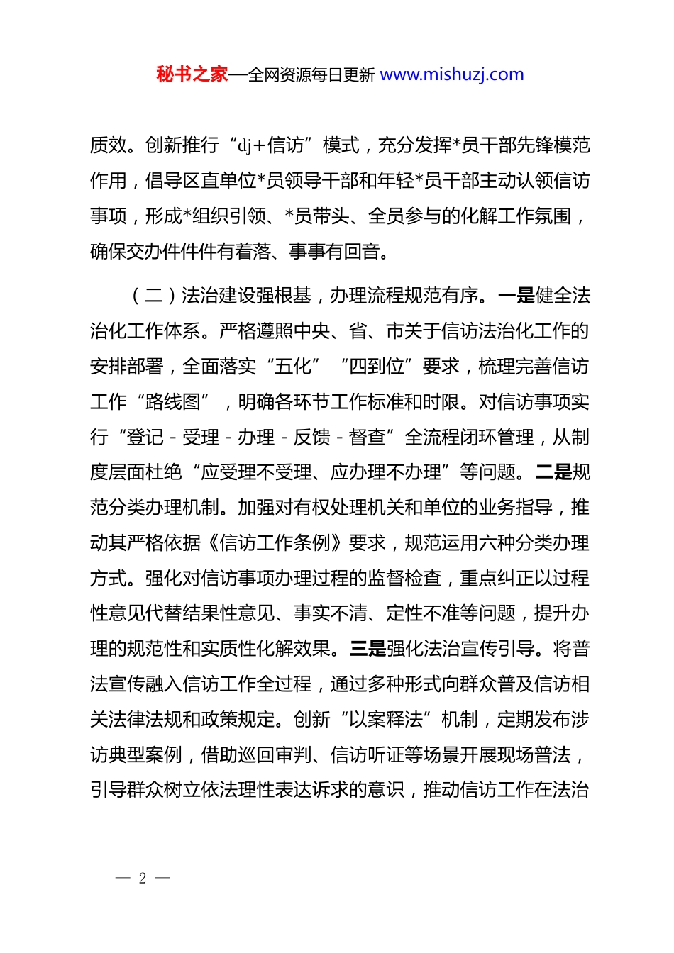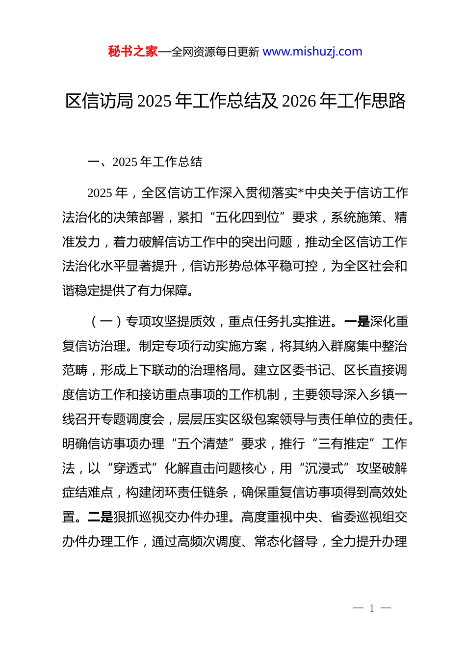 秘书之家—全网资源每日更新 www.mishuzj.com区信访局 2025 年工作总结及 2026 年工作思路一、2025 年工作总结2025 年,全区信访工作深入贯彻落实*中央关于信访工作法治化的决策部署,紧扣“五化四到位”要求,系统施策、精准发力,着力破解信访工作中的突出问题,推动全区信访工作法治化水平显著提升,信访形势总体平稳可控,为全区社会和谐稳定提供了有力保障。(一)专项攻坚提质效,重点任务扎实推进。一是深化重复信访治理。制定专项行动实施方案,将其纳入群腐集中整治范畴,形成上下联动的治理格局。建立区委书记、区长直接调度信访工作和接访重点事项的工作机制,主要领导深入乡镇一线召开专题调度会,层层压实区级包案领导与责任单位的责任。明确信访事项办理“五个清楚”要求,推行“三有推定”工作法,以“穿透式”化解直击问题核心,用“沉浸式”攻坚破解症结难点,构建闭环责任链条,确保重复信访事项得到高效处置。二是狠抓巡视交办件办理。高度重视中央、省委巡视组交办件办理工作,通过高频次调度、常态化督导,全力提升办理— 1 —秘书之家—全网资源每日更新 www.mishuzj.com质效。创新推行“dj+信访”模式,充分发挥*员干部先锋模范作用,倡导区直单位*员领导干部和年轻*员干部主动认领信访事项,形成*组织引领、*员带头、全员参与的化解工作氛围,确保交办件件件有着落、事事有回音。(二)法治建设强根基,办理流程规范有序。一是健全法治化工作体系。严格遵照中央、省、市关于信访法治化工作的安排部署,全面落实“五化”“四到位”要求,梳理完善信访工作“路线图”,明确各环节工作标准和时限。对信访事项实行“登记-受理-办理-反馈-督查”全流程闭环管理,从制度层面杜绝“应受理不受理、应办理不办理”等问题。二是规范分类办理机制。加强对有权处理机关和单位的业务指导,推动其严格依据《信访工作条例》要求,规范运用六种分类办理方式。强化对信访事项办理过程的监督检查,重点纠正以过程性意见代替结果性意见、事实不清、定性不准等问题,提升办理的规范性和实质性化解效果。三是强化法治宣传引导。将普法宣传融入信访工作全过程,通过多种形式向群众普及信访相关法律法规和政策规定。创新“以案释法”机制,定期发布涉访典型案例,借助巡回审判、信访听证等场景开展现场普法,引导群众树立依法理性表达诉求的意识,推动信访工作在法治— 2 —秘书之家—全网资源每日更新 www.mishuzj.com轨道上有序开展。(三)精准施策破难题,领域诉求有效回应。一是聚焦重点领域处置。针对城乡建设、政法、自然资源、农村农业、市场监管、劳动和社会保障、纪检监察等诉求集中的七大领域,建立重点领域信访问题分析研判机制,定期梳理突出矛盾和共性问题。统筹协调相关职能部门,组建专项工作小组,开展联合处置,精准回应群众在征地拆迁、劳动保障、涉法涉诉等方面的合理诉求。二是强化矛盾源头排查。依托基层社会治理和城乡网格化服务管理体系,常态化开展矛盾纠纷排查工作。拓宽排查渠道,延伸排查触角,重点关注村级财务公开、邻里矛盾、土地承包流转等易引发信访问题的领域,及时发现潜在隐患,建立台账、动态跟踪,力争将矛盾化解在萌芽状态。三是优化多元化解路径。充分发挥“三调联动”作用,整合人民调解、行政调解、司法调解资源,将调解贯穿信访事项办理全过程。针对复杂疑难信访问题,邀请法律专家、人大代表、政协委员等参与调处,通过听证评议、评估评查等方式,拓宽化解思路,提升化解效果,最大限度减少“信转访”“初转重”“个转群”现象。(四)机制创新强保障,工作合力全面凝聚。一是完善统— 3 —秘书之家—全网资源每日更新 www.mishuzj.com筹协调机制。强化信访工作联席会议的统筹协调职能,定期召开联席会议,研究解决跨部门、跨领域的复杂信访问题。建立信息共享、责任共担、联合处置的工作机制,打破部门壁垒,凝聚工作合力,提升信访问题化解效率。二是健全督导考核机制。建立健全信访工作督导考核体系,将信访事项办理质效、重复信访化解率、群众满意度等指标纳入年度考核。通过常态化督查、专项督办等方式,加...