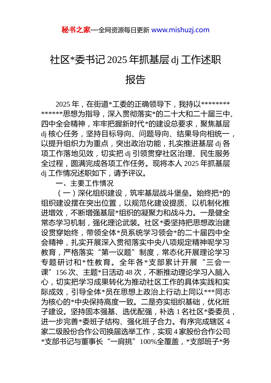 秘书之家—全网资源每日更新 www.mishuzj.com社区*委书记 2025 年抓基层 dj 工作述职报告2025 年,在街道*工委的正确领导下,我持以**************思想为指导,深入贯彻落实*的二十大和二十届三中、四中全会精神,牢牢把握新时代*的建设总要求,聚焦基层dj 核心任务,坚持目标导向、问题导向、结果导向相统一,以提升组织力为重点,突出政治功能,扎实推进基层 dj 各项工作落地见效,切实把 dj 引领贯穿社区治理、民生服务全过程,圆满完成各项工作任务。现将本人 2025 年抓基层dj 工作情况述职如下,请予评议。一、主要工作情况(一)深化组织建设,筑牢基层战斗堡垒。始终把*的组织建设摆在突出位置,以规范化建设提质、以机制化推进增效,不断增强基层*组织的凝聚力和战斗力。一是健全常态学习机制,强化理论武装。社区*委坚持把思想政治建设贯穿始终,带领全体*员系统学习领会*的二十届四中全会精神,扎实开展深入贯彻落实中央八项规定精神呢学习教育,严格落实“第一议题”制度,常态化开展理论学习专题研讨和*性教育。全年各*支部累计开展“三会一课”156 次、主题*日活动 48 次,不断推动理论学习入脑入心,切实把学习成果转化为推动社区工作的具体实践和实际成效,引导全体*员在思想上政治上行动上同以***同志为核心的*中央保持高度一致。二是夯实组织基础,优化班子建设。坚持固本强基、选优配强,补选 1 名社区*委委员,进一步完善*委班子结构、强化班子合力。有序完成辖区 4家二级股份合作公司换届选举工作,实现 4 家股份合作公司*支部书记与董事长“一肩挑”100%全覆盖,*支部班子*务秘书之家—全网资源每日更新 www.mishuzj.com资格证书持证率由 74%提升至 83%,切实提升基层*务工作专业化水平,筑牢基层*组织战斗堡垒根基。三是强化 dj 引领,规范股份公司管理。严格落实基层*组织对股份合作公司的领导,完善社区*委审批决策事项流程,主动参与股份合作公司重大人事任免、重大项目投资、大额资金使用等重大事项决策监督,健全管理制度、规范运营流程,推动股份合作公司规范化、制度化发展,切实把*的领导融入集体经济发展各环节。四是推进物业 dj 联建,激活治理动能深化物业 dj 联建机制,在辖区 2 个小区成立“美丽家园我先行”志愿服务小分队,广泛动员小区*员、热心居民、物业工作人员参与小区治理,常态化开展安全巡查、环境整治、邻里互助等志愿服务。全年累计开展巡查 22 次,排查整改安全隐患 16 处,有效化解小区各类矛盾隐患,拉近邻里关系,推动形成“dj 引领、物业尽责、居民参与”的小区治理新格局。五是深化治理模式,彰显先锋作用。持续深化“定格化+先锋服务+亲邻社区”基层治理模式,精准划分治理网格,充分发挥*员先锋模范作用,积极链接区人大代表、“3+1”帮扶单位、爱心企业等资源,聚焦困难群众需求,开展帮扶慰问、结对帮扶等暖心行动 34 次,覆盖帮扶困难群众 108 人次,切实把*的温暖送到群众心坎上,提升群众归属感和幸福感。(二)健全协作机制,提升基层治理效能。坚持 dj 引领基层治理,创新工作方法、健全协作机制,推动基层治理提质增效、提档升级,全力打造平安、整洁、有序的社区环境。一是强化阵地管理,优化服务保障。聚焦*群服务阵地功能提升,组建“1+1+1”安全生产管理队伍,制定“七必查”巡查清单,常态化开展安全生产隐患排查整治全年累计排查各类安全隐患 162 处,整改率 100%,切实守住安全生产底线,为居民群众营造安全稳定的居住环境。二是深化平安建设,守护居民安全。以平安社区建设为抓手,创新交通精细化管理模式,常态化开展路面交通安全秘书之家—全网资源每日更新 www.mishuzj.com宣传教育活动 228 场次,覆盖群众 7200 余人次;联合交警部门开展联合执法行动 65 次,整治交通违规行为 2920 宗,排查整改交通安全隐患 149 处,有效提升辖区交通秩序,保障居民出行安全。严格落实意识形态工作责任制,定期排查研判意识形态领域风险隐患,筑牢意识形态安全防线。三是健全调解机制,化解矛盾纠纷。成立辖区首家个人调解工作室,整合社区、网格、司法...