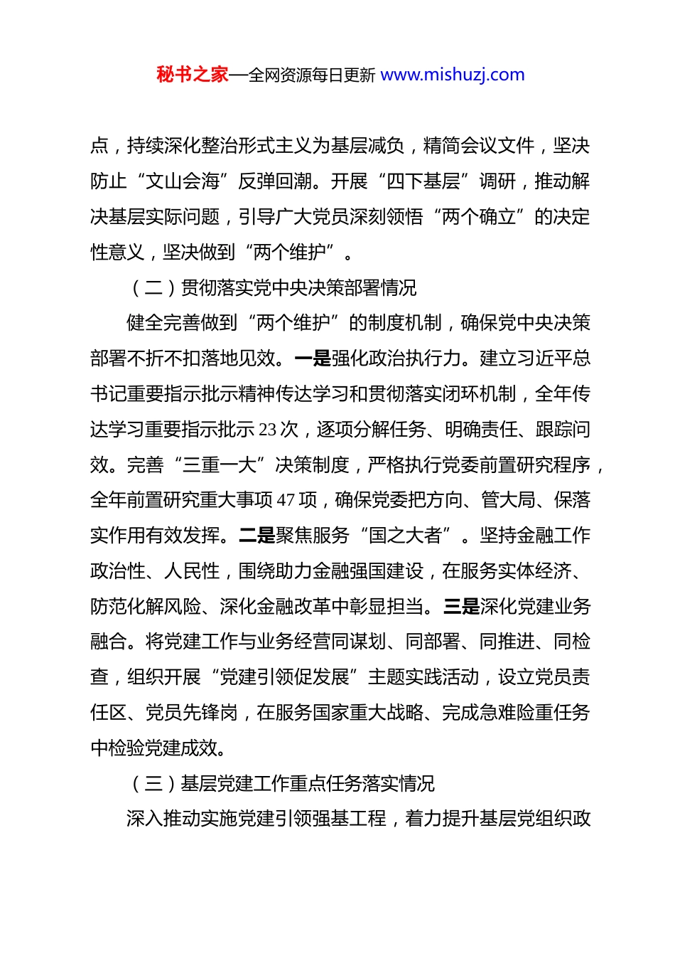 秘书之家—全网资源每日更新 www.mishuzj.com2025 年度公司党委书记抓基层党建述职报告 按照集团党委和总公司党委关于开展党委书记抓基层党建述职评议工作的部署要求,现将本人 2025 年度履行抓基层党建工作职责情况报告如下。一、2025 年度党建工作重点任务落实情况(一)深化思想政治建设情况坚持把学习贯彻习近平新时代中国特色社会主义思想作为首要政治任务,扎实推动理论武装走深走实。一是强化理论学习系统性。严格落实“第一议题”制度,召开党委理论学习中心组学习,专题学习习近平总书记关于党的建设的重要思想、关于党的自我革命的重要思想、关于金融工作的重要论述,及时跟进学习党的二十届四中全会精神和习近平总书记最新重要讲话。组织各党支部开展“三会一课”、主题党日活动,实现学习教育全覆盖。二是扎实开展深入贯彻中央八项规定精神学习教育。制定分公司实施方案,成立工作专班,一体推进学查改,组织专题学习研讨,开展警示教育。聚焦作风建设突出问题,查摆问题 12 项,逐一建立整改台账。坚持“过紧日子”要求,严格管控“三公”经费,差旅费、会议费同比下降。三是推动作风建设常态化长效化。将作风建设纳入党委日常监督重秘书之家—全网资源每日更新 www.mishuzj.com点,持续深化整治形式主义为基层减负,精简会议文件,坚决防止“文山会海”反弹回潮。开展“四下基层”调研,推动解决基层实际问题,引导广大党员深刻领悟“两个确立”的决定性意义,坚决做到“两个维护”。(二)贯彻落实党中央决策部署情况健全完善做到“两个维护”的制度机制,确保党中央决策部署不折不扣落地见效。一是强化政治执行力。建立习近平总书记重要指示批示精神传达学习和贯彻落实闭环机制,全年传达学习重要指示批示 23 次,逐项分解任务、明确责任、跟踪问效。完善“三重一大”决策制度,严格执行党委前置研究程序,全年前置研究重大事项 47 项,确保党委把方向、管大局、保落实作用有效发挥。二是聚焦服务“国之大者”。坚持金融工作政治性、人民性,围绕助力金融强国建设,在服务实体经济、防范化解风险、深化金融改革中彰显担当。三是深化党建业务融合。将党建工作与业务经营同谋划、同部署、同推进、同检查,组织开展“党建引领促发展”主题实践活动,设立党员责任区、党员先锋岗,在服务国家重大战略、完成急难险重任务中检验党建成效。(三)基层党建工作重点任务落实情况深入推动实施党建引领强基工程,着力提升基层党组织政秘书之家—全网资源每日更新 www.mishuzj.com治功能和组织功能。一是完善党建工作领导体制。调整充实党建工作领导小组,新增专职党务工作者,优化党支部设置,实现党组织有形有效覆盖。制定分公司加强党的建设工作重点任务清单,细化分解任务 38 项,逐项明确责任人和完成时限。二是有效开展“两纵两横”联学互促。组织总部机关与基层支部结对共建,开展联学活动,推动理论学习向基层延伸。积极探索“小微党支部”建设新模式,针对人员分散、力量不足的网点,组建联合党支部 3 个,实现组织覆盖与作用发挥同步提升。三是深入开展“关键小事”调研攻关。聚焦基层反映突出的难点堵点问题,确定调研攻关课题,形成调研报告,推动解决影响业务发展的实际问题。开展“四抓落实”典型选树,表彰先进党支部 5 个、优秀共产党员 15 名。四是积极培育公司特色金融文化。大力培育和践行“诚实守信、以义取利、稳健审慎、守正创新、依法合规”的中国特色金融文化,将金融文化融入党建工作全过程,组织文化宣贯活动。五是广泛开展关爱员工行动。落实“三必讲四必谈五必访”思想政治工作法,开展谈心谈话。帮助解决员工子女入学、大病救助等实际困难 23 件,增强员工归属感和获得感。(四)发挥党员队伍作用情况坚持用改革精神和严的标准推进党员队伍建设,锻造靠得秘书之家—全网资源每日更新 www.mishuzj.com住、顶得上、过得硬的先锋队伍。一是注重发掘选树先进典型。在业务拓展、风险防控、客户服务等关键领域选树党员先进典型 12 名,开展“学习身边榜样”活动,发挥示范带动作用。推荐 2 名党员参评省级金融系统优秀共...