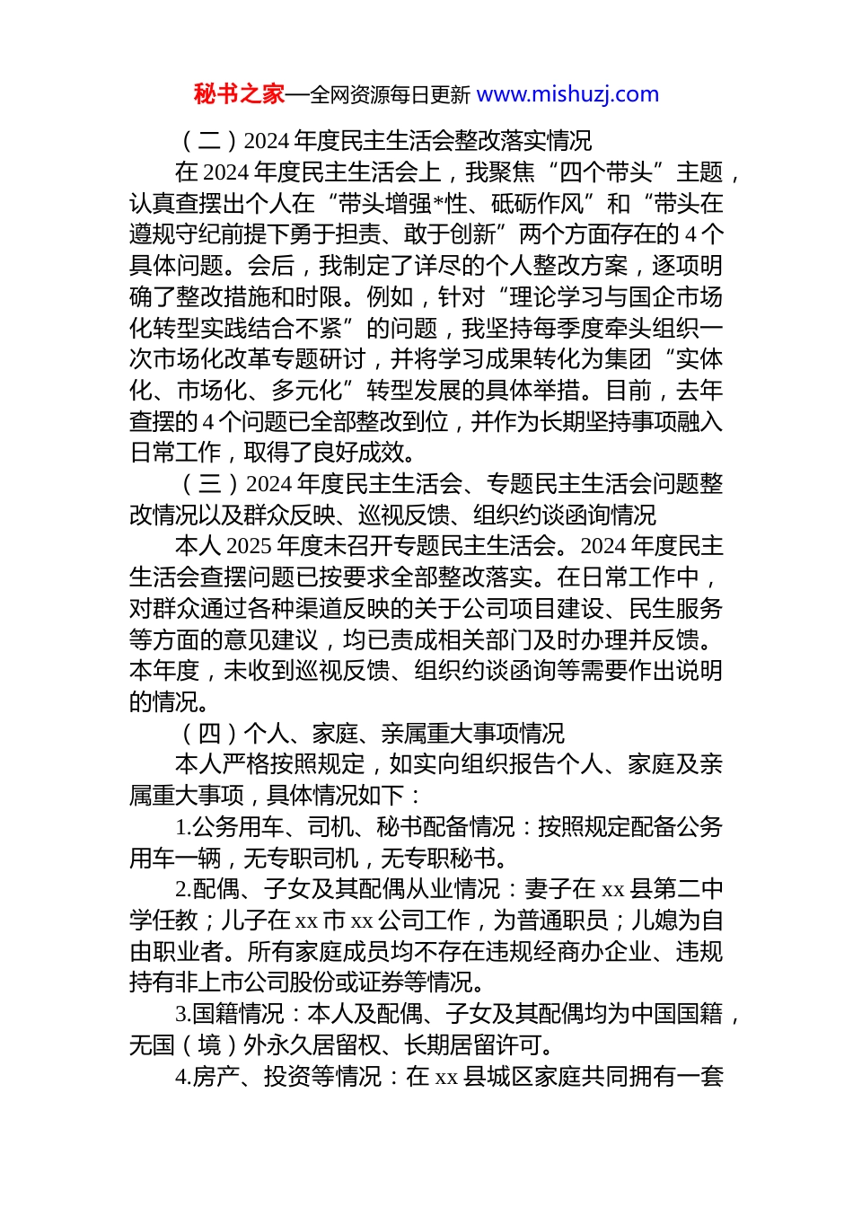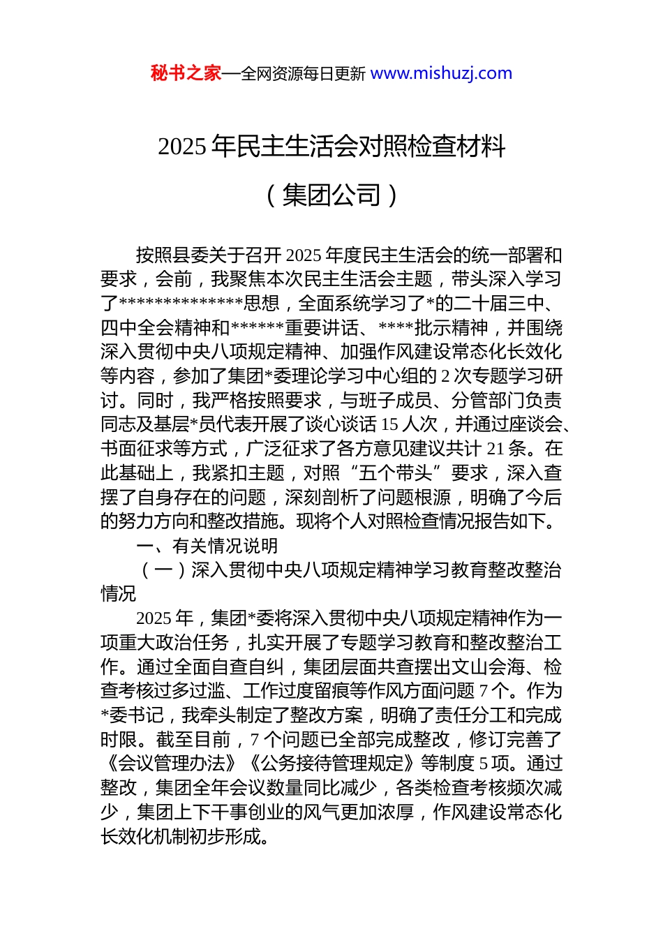 秘书之家—全网资源每日更新 www.mishuzj.com2025 年民主生活会对照检查材料(集团公司)按照县委关于召开 2025 年度民主生活会的统一部署和要求,会前,我聚焦本次民主生活会主题,带头深入学习了**************思想,全面系统学习了*的二十届三中、四中全会精神和******重要讲话、****批示精神,并围绕深入贯彻中央八项规定精神、加强作风建设常态化长效化等内容,参加了集团*委理论学习中心组的 2 次专题学习研讨。同时,我严格按照要求,与班子成员、分管部门负责同志及基层*员代表开展了谈心谈话 15 人次,并通过座谈会、书面征求等方式,广泛征求了各方意见建议共计 21 条。在此基础上,我紧扣主题,对照“五个带头”要求,深入查摆了自身存在的问题,深刻剖析了问题根源,明确了今后的努力方向和整改措施。现将个人对照检查情况报告如下。一、有关情况说明(一)深入贯彻中央八项规定精神学习教育整改整治情况2025 年,集团*委将深入贯彻中央八项规定精神作为一项重大政治任务,扎实开展了专题学习教育和整改整治工作。通过全面自查自纠,集团层面共查摆出文山会海、检查考核过多过滥、工作过度留痕等作风方面问题 7 个。作为*委书记,我牵头制定了整改方案,明确了责任分工和完成时限。截至目前,7 个问题已全部完成整改,修订完善了《会议管理办法》《公务接待管理规定》等制度 5 项。通过整改,集团全年会议数量同比减少,各类检查考核频次减少,集团上下干事创业的风气更加浓厚,作风建设常态化长效化机制初步形成。秘书之家—全网资源每日更新 www.mishuzj.com(二)2024 年度民主生活会整改落实情况在 2024 年度民主生活会上,我聚焦“四个带头”主题,认真查摆出个人在“带头增强*性、砥砺作风”和“带头在遵规守纪前提下勇于担责、敢于创新”两个方面存在的 4 个具体问题。会后,我制定了详尽的个人整改方案,逐项明确了整改措施和时限。例如,针对“理论学习与国企市场化转型实践结合不紧”的问题,我坚持每季度牵头组织一次市场化改革专题研讨,并将学习成果转化为集团“实体化、市场化、多元化”转型发展的具体举措。目前,去年查摆的 4 个问题已全部整改到位,并作为长期坚持事项融入日常工作,取得了良好成效。(三)2024 年度民主生活会、专题民主生活会问题整改情况以及群众反映、巡视反馈、组织约谈函询情况本人 2025 年度未召开专题民主生活会。2024 年度民主生活会查摆问题已按要求全部整改落实。在日常工作中,对群众通过各种渠道反映的关于公司项目建设、民生服务等方面的意见建议,均已责成相关部门及时办理并反馈。本年度,未收到巡视反馈、组织约谈函询等需要作出说明的情况。(四)个人、家庭、亲属重大事项情况本人严格按照规定,如实向组织报告个人、家庭及亲属重大事项,具体情况如下:1.公务用车、司机、秘书配备情况:按照规定配备公务用车一辆,无专职司机,无专职秘书。2.配偶、子女及其配偶从业情况:妻子在 xx 县第二中学任教;儿子在 xx 市 xx 公司工作,为普通职员;儿媳为自由职业者。所有家庭成员均不存在违规经商办企业、违规持有非上市公司股份或证券等情况。3.国籍情况:本人及配偶、子女及其配偶均为中国国籍,无国(境)外永久居留权、长期居留许可。4.房产、投资等情况:在 xx 县城区家庭共同拥有一套秘书之家—全网资源每日更新 www.mishuzj.com商品房,在 xx 市为儿子购置婚房一套,无其他在国(境)内外持有的房产。未参与任何形式的违规投资、借贷活动。其他个人重大事项均已按规定向组织如实报告。二、存在的问题我严格对照“带头强化政治忠诚、提高政治能力,带头固本培元、增强*性,带头敬畏人民、敬畏组织、敬畏法纪,带头干事创业、担当作为,带头坚决扛起管*治*责任”这五个方面,把自己摆进去、把职责摆进去、把工作摆进去,查摆出的主要问题如下。(一)在带头强化政治忠忠、提高政治能力方面一是政治判断的敏锐性仍有差距。对一些新生事物、新兴业态的政治属性和潜在风险,洞察力还不够强。2025年下半年,在研究集团拟投资的一个新能源储能项目时,我最初的关注点更多地集...