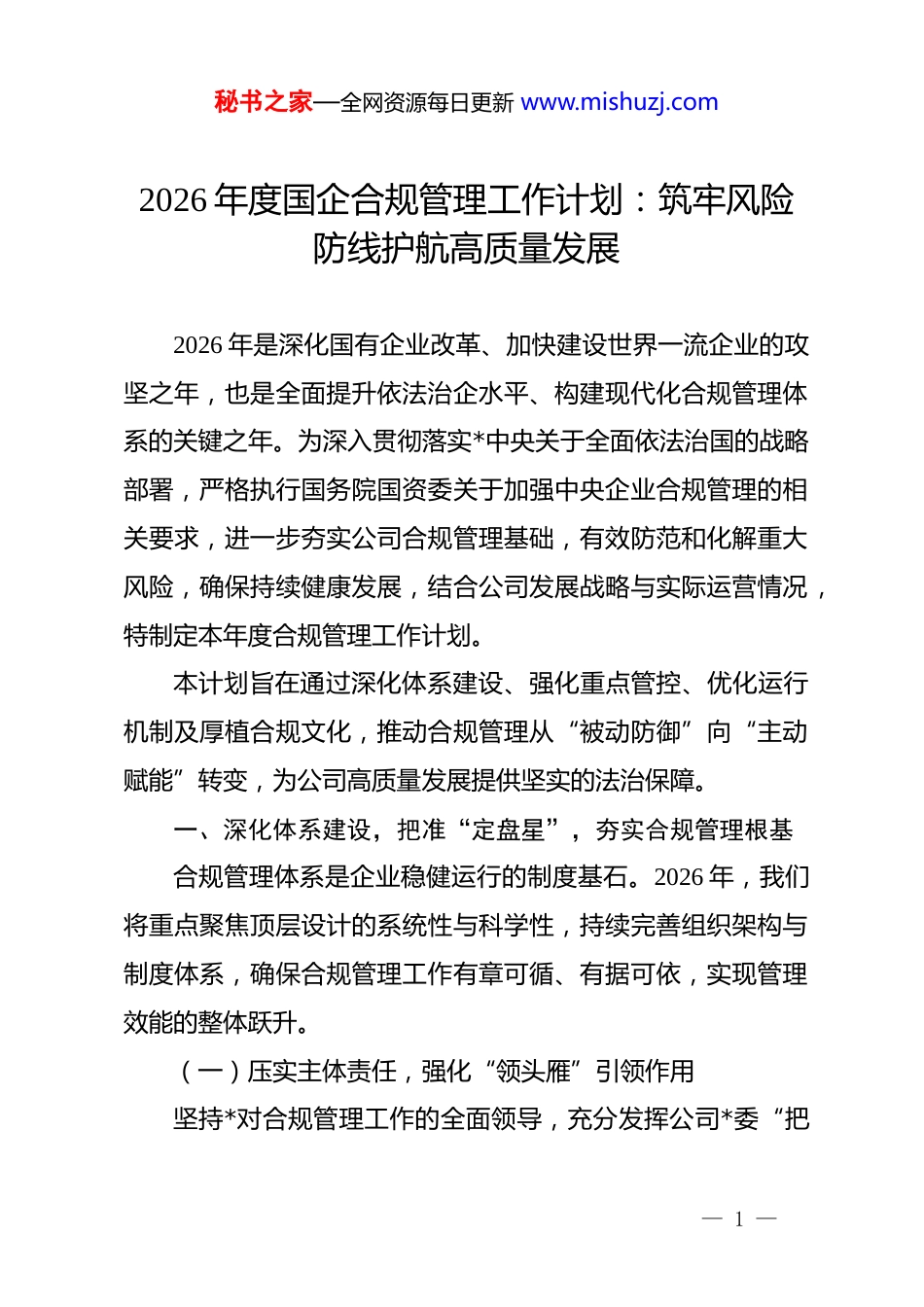 秘书之家—全网资源每日更新 www.mishuzj.com2026 年度国企合规管理工作计划:筑牢风险防线护航高质量发展2026 年是深化国有企业改革、加快建设世界一流企业的攻坚之年,也是全面提升依法治企水平、构建现代化合规管理体系的关键之年。为深入贯彻落实*中央关于全面依法治国的战略部署,严格执行国务院国资委关于加强中央企业合规管理的相关要求,进一步夯实公司合规管理基础,有效防范和化解重大风险,确保持续健康发展,结合公司发展战略与实际运营情况,特制定本年度合规管理工作计划。本计划旨在通过深化体系建设、强化重点管控、优化运行机制及厚植合规文化,推动合规管理从“被动防御”向“主动赋能”转变,为公司高质量发展提供坚实的法治保障。一、深化体系建设,把准“定盘星”,夯实合规管理根基合规管理体系是企业稳健运行的制度基石。2026 年,我们将重点聚焦顶层设计的系统性与科学性,持续完善组织架构与制度体系,确保合规管理工作有章可循、有据可依,实现管理效能的整体跃升。(一)压实主体责任,强化“领头雁”引领作用坚持*对合规管理工作的全面领导,充分发挥公司*委“把— 1 —秘书之家—全网资源每日更新 www.mishuzj.com方向、管大局、保落实”的领导作用。一是强化顶层推动。将合规管理纳入*委重要议事日程,全年听取合规管理工作汇报不少于 xx 次,研究解决重大合规风险问题。确立主要负责人为合规管理第一责任人,明确各级领导干部在分管领域的合规职责,签署《合规履职承诺书》xx 份,层层传导压力,确立“管业务必须管合规”的责任意识。二是做实首席合规官制度。进一步明确首席合规官的职责权限,保障其列席*委会、董事会及总经理办公会等重要决策会议,参与重大经营事项的合规审查。建立首席合规官定期向董事会汇报工作机制,确保合规意见在决策源头得到充分体现,坚决防止“由一言堂”引发的决策风险。(二)完善制度体系,构建“全覆盖”规则网络制度是合规管理的载体,必须随着内外部环境的变化动态调整,确保制度的生命力和执行力。一是开展制度立改废。结合最新法律法规及监管要求,对公司现行 xx 项管理制度进行全面梳理。重点针对新《公司法》实施后的章程修订及配套制度建设,废止不适应发展需求的制度 xx 项,修订完善 xx 项,新增 xx 项,确保制度体系与法律法规的同频共振。二是编制重点领域合规指引。在通用合规行为准则的基础— 2 —秘书之家—全网资源每日更新 www.mishuzj.com上,聚焦工程建设、物资采购、产权交易等高风险领域,编制发布 xx 个专项《合规管理操作指引》。指引将明确具体业务流程中的合规红线与操作规范,将抽象的合规要求转化为具体的岗位作业标准,让员工看得懂、用得上、守得住。(三)健全组织职能,打造“专业化”防守梯队构建分工明确、协同高效的合规管理组织体系,形成上下联动、齐抓共管的工作格局。一是筑牢“三道防线”。进一步厘清业务部门(第一道防线)、合规管理部门(第二道防线)和审计纪检部门(第三道防线)的职责边界。业务部门承担合规主体责任,编制本领域合规风险清单;合规部门负责统筹协调与审查监督;审计纪检部门负责对合规履职情况进行再监督,形成闭环管理。二是加强合规队伍建设。选优配强专职合规管理人员,确保总法律顾问及法务合规人员配备率达到 xx%。组建由 xx 名业务骨干组成的兼职合规员队伍,建立定期培训与轮岗交流机制,提升全员合规专业素养,解决合规管理“最后一公里”落地难的问题。二、强化重点管控,筑牢“防火墙”,提升风险防范能级风险防控是合规管理的核心目标。2026 年,我们将坚持问题导向,聚焦关键环节与重点领域,实施精准管控,切实将风— 3 —秘书之家—全网资源每日更新 www.mishuzj.com险消除在萌芽状态,坚决守住不发生系统性、颠覆性风险的底线。(一)严控决策风险,把好“入口关”审查机制决策合规是企业最大的合规,必须确保每一项重大决策都经得起法律和历史的检验。一是刚性执行合规审查。严格落实“三重一大”决策事项合规审查前置程序,坚持“应审尽审、审必到位”。明确未经合规审查或审查未通过的事项,不得...