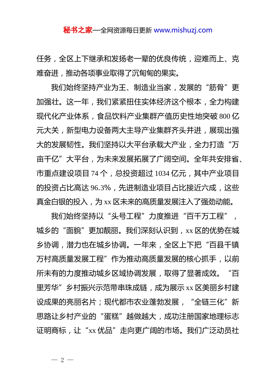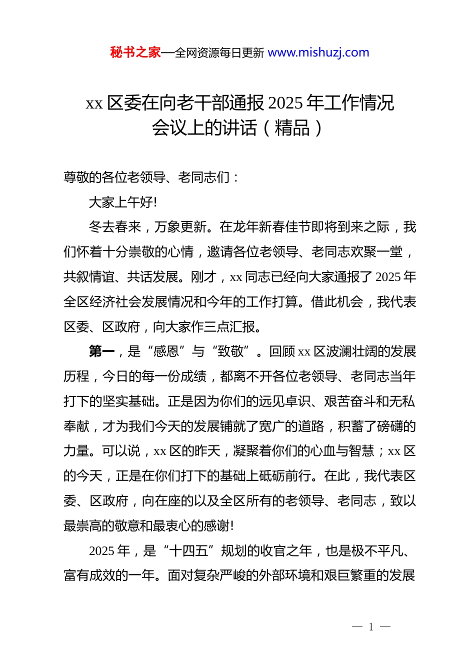 秘书之家—全网资源每日更新 www.mishuzj.comxx 区委在向老干部通报 2025 年工作情况会议上的讲话(精品)尊敬的各位老领导、老同志们:大家上午好!冬去春来,万象更新。在龙年新春佳节即将到来之际,我们怀着十分崇敬的心情,邀请各位老领导、老同志欢聚一堂,共叙情谊、共话发展。刚才,xx 同志已经向大家通报了 2025 年全区经济社会发展情况和今年的工作打算。借此机会,我代表区委、区政府,向大家作三点汇报。第一,是“感恩”与“致敬”。回顾 xx 区波澜壮阔的发展历程,今日的每一份成绩,都离不开各位老领导、老同志当年打下的坚实基础。正是因为你们的远见卓识、艰苦奋斗和无私奉献,才为我们今天的发展铺就了宽广的道路,积蓄了磅礴的力量。可以说,xx 区的昨天,凝聚着你们的心血与智慧;xx 区的今天,正是在你们打下的基础上砥砺前行。在此,我代表区委、区政府,向在座的以及全区所有的老领导、老同志,致以最崇高的敬意和最衷心的感谢!2025 年,是“十四五”规划的收官之年,也是极不平凡、富有成效的一年。面对复杂严峻的外部环境和艰巨繁重的发展— 1 —秘书之家—全网资源每日更新 www.mishuzj.com任务,全区上下继承和发扬老一辈的优良传统,迎难而上、克难奋进,推动各项事业取得了沉甸甸的果实。我们始终坚持产业为王、制造业当家,发展的“筋骨”更加强壮。这一年,我们紧紧扭住实体经济这个根本,全力构建现代化产业体系,食品饮料产业集群产值历史性地突破 800 亿元大关,新型电力设备两大主导产业集群齐头并进,展现出强大的发展韧性。我们坚持以大平台承载大产业,全力打造“万亩千亿”大平台,为未来发展拓展了广阔空间。全年共安排省、市重点建设项目 74 个,总投资超过 1034 亿元,其中产业项目的投资占比高达 96.3%,先进制造业项目占比接近六成,这些真金白银的投入,为 xx 区未来的高质量发展注入了强劲动能。我们始终坚持以“头号工程”力度推进“百千万工程”,城乡的“面貌”更加靓丽。我们深刻认识到,xx 区的优势在城乡协调,潜力也在城乡协调。一年来,全区上下把“百县千镇万村高质量发展工程”作为推动高质量发展的核心抓手,以前所未有的力度推动城乡区域协调发展,取得了显著成效。“百里芳华”乡村振兴示范带串珠成链,成为展示 xx 区美丽乡村建设成果的亮丽名片;现代都市农业蓬勃发展,“全链三化”新思路让乡村产业的“蛋糕”越做越大,成功注册国家地理标志证明商标,让“xx 优品”走向更广阔的市场。我们广泛动员社— 2 —秘书之家—全网资源每日更新 www.mishuzj.com会各界力量参与,累计获得的捐资捐赠超过 2.3 亿元,形成了全社会共建美丽家园的生动局面。我们始终坚持以人民为中心,民生的“温度”更加暖心。发展的最终目的,是让人民群众过上好日子。这一年,我们用心用情办好群众关心的“身边事”,将发展的成果更多更公平地惠及全区人民。教育方面,我们持续增加优质公办学位供给,xx 镇、xx 街道两所九年一贯制学校建设顺利推进,一批学校完成扩建,让孩子们“有学上”更能“上好学”。医疗方面,我们加快构建“1+3+3+7”分级诊疗体系,南方医科大学珠江医院 xx 医院新城院区等高水平医院的建设,将极大提升区域医疗服务能力,守护群众健康。社会保障方面,我们聚焦“一老一小”,扎实推进“十项民生实事”,从就业帮扶到养老服务,从食品安全到便民出行,努力让每一位生活在 xx 区的群众都能感受到这座城市的溫暖。我们始终坚持统筹发展和安全,稳定的“基石”更加牢固。安全是发展的前提。我们时刻绷紧安全这根弦,持续深化安全生产隐患排查整治,创新推广“1+6+n”园区社会治安综合治理体系,全力建设更高水平的法治 xx、平安 xx,努力营造国泰民安的社会环境,让人民群众的获得感、幸福感、安全感更加充实、更有保障、更可持续。— 3 —秘书之家—全网资源每日更新 www.mishuzj.com这些成绩的取得,是全区人民团结奋斗的结果,更离不开各位老领导、老同志的关心、支持和帮助。你们虽然离开了工作岗位,但心系 xx 发展的赤诚情怀从未改变,时刻关注着这片奋斗过的热土。...