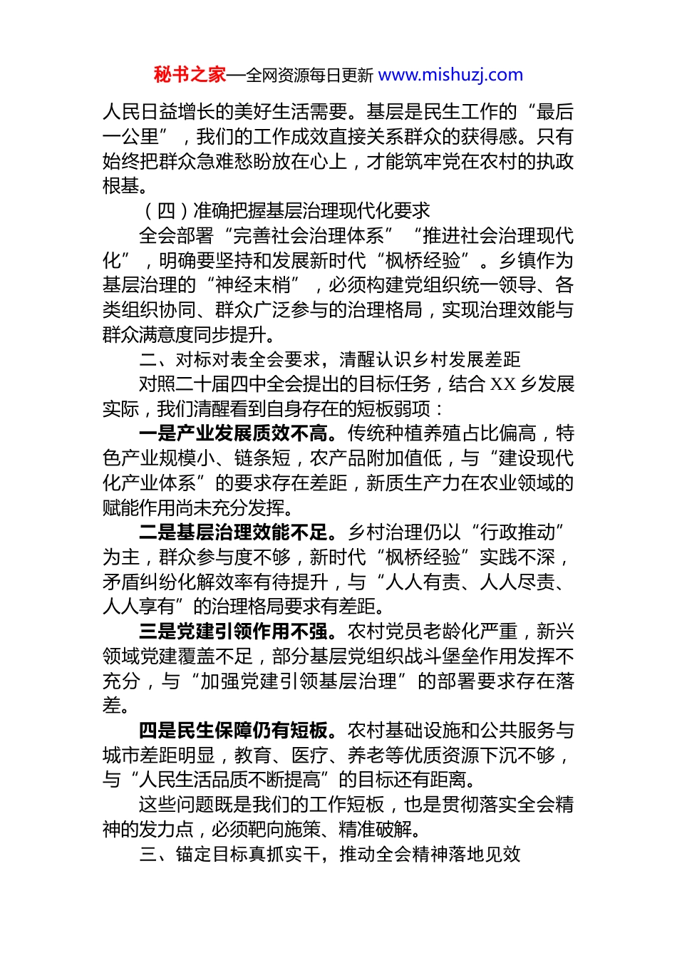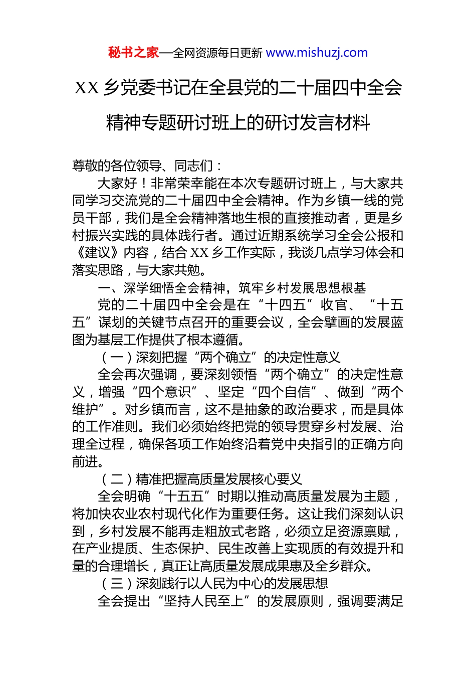 秘书之家—全网资源每日更新 www.mishuzj.comXX 乡党委书记在全县党的二十届四中全会精神专题研讨班上的研讨发言材料尊敬的各位领导、同志们:大家好!非常荣幸能在本次专题研讨班上,与大家共同学习交流党的二十届四中全会精神。作为乡镇一线的党员干部,我们是全会精神落地生根的直接推动者,更是乡村振兴实践的具体践行者。通过近期系统学习全会公报和《建议》内容,结合 XX 乡工作实际,我谈几点学习体会和落实思路,与大家共勉。一、深学细悟全会精神,筑牢乡村发展思想根基党的二十届四中全会是在“十四五”收官、“十五五”谋划的关键节点召开的重要会议,全会擘画的发展蓝图为基层工作提供了根本遵循。(一)深刻把握“两个确立”的决定性意义全会再次强调,要深刻领悟“两个确立”的决定性意义,增强“四个意识”、坚定“四个自信”、做到“两个维护”。对乡镇而言,这不是抽象的政治要求,而是具体的工作准则。我们必须始终把党的领导贯穿乡村发展、治理全过程,确保各项工作始终沿着党中央指引的正确方向前进。(二)精准把握高质量发展核心要义全会明确“十五五”时期以推动高质量发展为主题,将加快农业农村现代化作为重要任务。这让我们深刻认识到,乡村发展不能再走粗放式老路,必须立足资源禀赋,在产业提质、生态保护、民生改善上实现质的有效提升和量的合理增长,真正让高质量发展成果惠及全乡群众。(三)深刻践行以人民为中心的发展思想全会提出“坚持人民至上”的发展原则,强调要满足秘书之家—全网资源每日更新 www.mishuzj.com人民日益增长的美好生活需要。基层是民生工作的“最后一公里”,我们的工作成效直接关系群众的获得感。只有始终把群众急难愁盼放在心上,才能筑牢党在农村的执政根基。(四)准确把握基层治理现代化要求全会部署“完善社会治理体系”“推进社会治理现代化”,明确要坚持和发展新时代“枫桥经验”。乡镇作为基层治理的“神经末梢”,必须构建党组织统一领导、各类组织协同、群众广泛参与的治理格局,实现治理效能与群众满意度同步提升。二、对标对表全会要求,清醒认识乡村发展差距对照二十届四中全会提出的目标任务,结合 XX 乡发展实际,我们清醒看到自身存在的短板弱项:一是产业发展质效不高。传统种植养殖占比偏高,特色产业规模小、链条短,农产品附加值低,与“建设现代化产业体系”的要求存在差距,新质生产力在农业领域的赋能作用尚未充分发挥。二是基层治理效能不足。乡村治理仍以“行政推动”为主,群众参与度不够,新时代“枫桥经验”实践不深,矛盾纠纷化解效率有待提升,与“人人有责、人人尽责、人人享有”的治理格局要求有差距。三是党建引领作用不强。农村党员老龄化严重,新兴领域党建覆盖不足,部分基层党组织战斗堡垒作用发挥不充分,与“加强党建引领基层治理”的部署要求存在落差。四是民生保障仍有短板。农村基础设施和公共服务与城市差距明显,教育、医疗、养老等优质资源下沉不够,与“人民生活品质不断提高”的目标还有距离。这些问题既是我们的工作短板,也是贯彻落实全会精神的发力点,必须靶向施策、精准破解。三、锚定目标真抓实干,推动全会精神落地见效秘书之家—全网资源每日更新 www.mishuzj.com贯彻落实二十届四中全会精神,关键在行动、核心在落实。XX 乡将聚焦“农业强、农村美、农民富”目标,重点抓好四方面工作:(一)聚焦产业振兴,激活乡村发展动能立足 XX 乡农业资源优势,以“农业现代化”为方向,推动产业提质增效。一是筑牢粮食安全底线。落实粮食安全党政同责,推进高标准农田建设,确保粮食产量稳定增长。二是培育特色产业集群。按照“片区化推进乡村振兴”要求,整合资源发展中药材、精品果蔬等特色种植,培育家庭农场、农民合作社等新型经营主体,推动农产品“接二连三”融合发展。三是强化科技赋能。与农业技术部门合作建立示范基地,推广绿色种植、智慧养殖技术,提升农业科技进步贡献率。(二)深化基层治理,建设平安和美乡村以“社会治理现代化”为目标,构建共建共治共享格局。一是建强治理载体。规范化建设乡级综治中心,实现群众诉求“一站式受理、一揽子...
