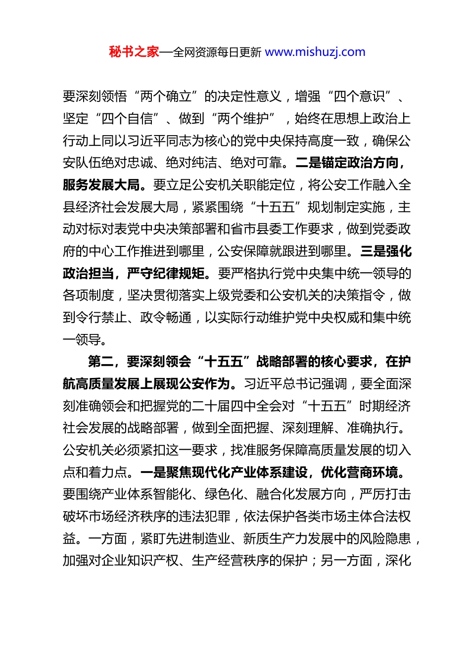 秘书之家—全网资源每日更新 www.mishuzj.com深学细悟全会精神 忠诚履职护航发展奋力为实现“十五五”良好开局贡献公安力量——县公安局局长学习习近平在省部级主要领导干部学习贯彻党的二十届四中全会精神专题研讨班开班式上发表重要讲话精神的研讨发言近日,我深入学习了习近平总书记在省部级主要领导干部学习贯彻党的二十届四中全会精神专题研讨班开班式上的重要讲话,深感思想深邃、内涵丰富,为我们做好当前和今后一个时期的工作指明了前进方向、提供了根本遵循。作为县公安局局长,我深刻认识到,公安机关肩负着维护国家安全、社会安定、人民安宁的重大使命,必须把学习贯彻全会精神与公安工作实际紧密结合,以更高站位、更实举措、更强担当,为实现“十五五”良好开局保驾护航。下面,我结合学习思考和工作实际,谈几点体会。第一,要深刻领会五年规划的制度优势,在坚持党的绝对领导上彰显公安忠诚。习近平总书记指出,制定和实施五年规划是我们党治国理政的重要经验,是中国特色社会主义制度的重要政治优势,蕴含着坚持党中央集中统一领导、坚持从实际出发等丰富经验。公安机关作为党和人民手中的“刀把子”,必须深刻把握这一制度优势的核心要义,始终把党的领导贯穿公安工作全过程各方面。一是坚定政治立场,筑牢忠诚警魂。秘书之家—全网资源每日更新 www.mishuzj.com要深刻领悟“两个确立”的决定性意义,增强“四个意识”、坚定“四个自信”、做到“两个维护”,始终在思想上政治上行动上同以习近平同志为核心的党中央保持高度一致,确保公安队伍绝对忠诚、绝对纯洁、绝对可靠。二是锚定政治方向,服务发展大局。要立足公安机关职能定位,将公安工作融入全县经济社会发展大局,紧紧围绕“十五五”规划制定实施,主动对标对表党中央决策部署和省市县委工作要求,做到党委政府的中心工作推进到哪里,公安保障就跟进到哪里。三是强化政治担当,严守纪律规矩。要严格执行党中央集中统一领导的各项制度,坚决贯彻落实上级党委和公安机关的决策指令,做到令行禁止、政令畅通,以实际行动维护党中央权威和集中统一领导。第二,要深刻领会“十五五”战略部署的核心要求,在护航高质量发展上展现公安作为。习近平总书记强调,要全面深刻准确领会和把握党的二十届四中全会对“十五五”时期经济社会发展的战略部署,做到全面把握、深刻理解、准确执行。公安机关必须紧扣这一要求,找准服务保障高质量发展的切入点和着力点。一是聚焦现代化产业体系建设,优化营商环境。要围绕产业体系智能化、绿色化、融合化发展方向,严厉打击破坏市场经济秩序的违法犯罪,依法保护各类市场主体合法权益。一方面,紧盯先进制造业、新质生产力发展中的风险隐患,加强对企业知识产权、生产经营秩序的保护;另一方面,深化秘书之家—全网资源每日更新 www.mishuzj.com“放管服”改革,推出更多便民利企举措,为企业发展营造安全稳定的治安环境和高效便捷的服务环境。二是聚焦新发展格局构建,维护经济安全。要立足我县人口、市场、产业优势,紧盯消费、投资、供给等领域的违法犯罪行为,严厉打击传销、非法集资、合同诈骗等涉众型经济犯罪,维护公平公正的市场经济秩序。同时,加强与相关部门协作配合,助力打通国内大循环堵点,促进内需潜力释放,为内外循环互促共进提供安全保障。三是聚焦规划编制实施,强化法治保障。要坚持科学决策、民主决策、依法决策,主动参与到全县“十五五”规划编制的相关工作中,围绕社会治安、公共安全等领域提出公安建议。同时,严格规范公正文明执法,确保各项规划在实施过程中不偏离法治轨道,保障规划落地见效。第三,要深刻领会发展与安全的辩证关系,在统筹安全与发展上扛起公安责任。习近平总书记指出,经济发展和社会发展相辅相成,必须协调并进,要统筹发展和安全,有效防范化解各类风险。安全是发展的前提,发展是安全的保障,公安机关必须始终坚持总体国家安全观,以高水平安全护航高质量发展。一是筑牢国家安全屏障,防范政治风险。要严密防范和严厉打击境内外敌对势力渗透、颠覆、破坏活动,加强网络安全监管,筑牢网络安全防线。紧盯各类敏感节点...