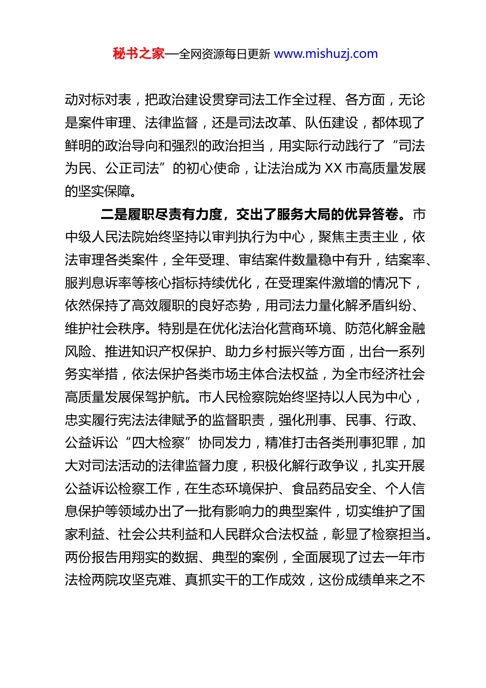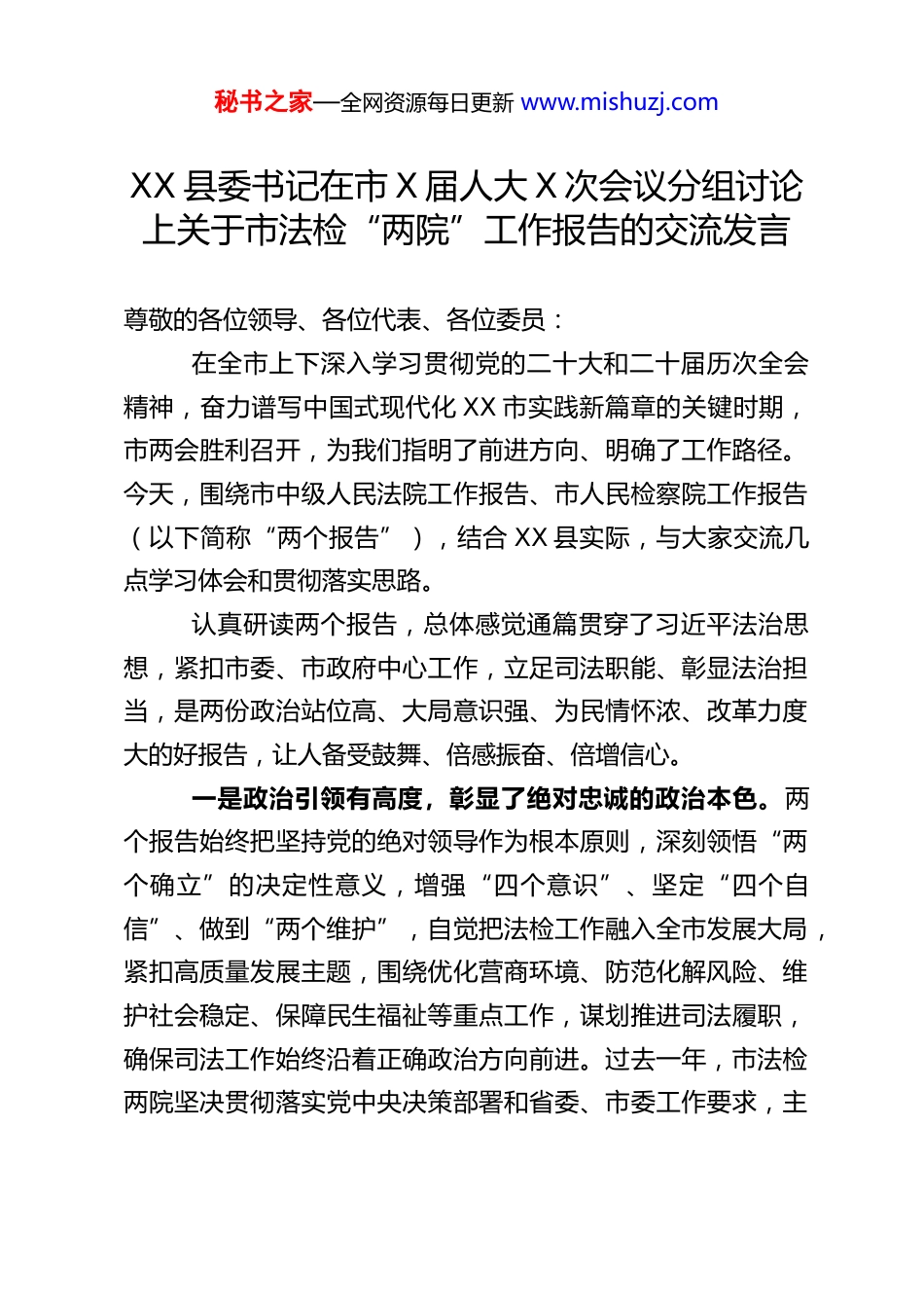 秘书之家—全网资源每日更新 www.mishuzj.comXX 县委书记在市 X 届人大 X 次会议分组讨论上关于市法检“两院”工作报告的交流发言尊敬的各位领导、各位代表、各位委员:在全市上下深入学习贯彻党的二十大和二十届历次全会精神,奋力谱写中国式现代化 XX 市实践新篇章的关键时期,市两会胜利召开,为我们指明了前进方向、明确了工作路径。今天,围绕市中级人民法院工作报告、市人民检察院工作报告(以下简称“两个报告”),结合 XX 县实际,与大家交流几点学习体会和贯彻落实思路。认真研读两个报告,总体感觉通篇贯穿了习近平法治思想,紧扣市委、市政府中心工作,立足司法职能、彰显法治担当,是两份政治站位高、大局意识强、为民情怀浓、改革力度大的好报告,让人备受鼓舞、倍感振奋、倍增信心。一是政治引领有高度,彰显了绝对忠诚的政治本色。两个报告始终把坚持党的绝对领导作为根本原则,深刻领悟“两个确立”的决定性意义,增强“四个意识”、坚定“四个自信”、做到“两个维护”,自觉把法检工作融入全市发展大局,紧扣高质量发展主题,围绕优化营商环境、防范化解风险、维护社会稳定、保障民生福祉等重点工作,谋划推进司法履职,确保司法工作始终沿着正确政治方向前进。过去一年,市法检两院坚决贯彻落实党中央决策部署和省委、市委工作要求,主秘书之家—全网资源每日更新 www.mishuzj.com动对标对表,把政治建设贯穿司法工作全过程、各方面,无论是案件审理、法律监督,还是司法改革、队伍建设,都体现了鲜明的政治导向和强烈的政治担当,用实际行动践行了“司法为民、公正司法”的初心使命,让法治成为 XX 市高质量发展的坚实保障。二是履职尽责有力度,交出了服务大局的优异答卷。市中级人民法院始终坚持以审判执行为中心,聚焦主责主业,依法审理各类案件,全年受理、审结案件数量稳中有升,结案率、服判息诉率等核心指标持续优化,在受理案件激增的情况下,依然保持了高效履职的良好态势,用司法力量化解矛盾纠纷、维护社会秩序。特别是在优化法治化营商环境、防范化解金融风险、推进知识产权保护、助力乡村振兴等方面,出台一系列务实举措,依法保护各类市场主体合法权益,为全市经济社会高质量发展保驾护航。市人民检察院始终坚持以人民为中心,忠实履行宪法法律赋予的监督职责,强化刑事、民事、行政、公益诉讼“四大检察”协同发力,精准打击各类刑事犯罪,加大对司法活动的法律监督力度,积极化解行政争议,扎实开展公益诉讼检察工作,在生态环境保护、食品药品安全、个人信息保护等领域办出了一批有影响力的典型案件,切实维护了国家利益、社会公共利益和人民群众合法权益,彰显了检察担当。两份报告用翔实的数据、典型的案例,全面展现了过去一年市法检两院攻坚克难、真抓实干的工作成效,这份成绩单来之不秘书之家—全网资源每日更新 www.mishuzj.com易、令人敬佩。三是司法为民有温度,践行了以人民为中心的发展思想。两个报告始终把人民群众的急难愁盼放在心上,聚焦群众在立案、审理、执行、申诉等环节的痛点难点问题,持续深化司法便民利民举措,推动司法服务提质增效。市法院优化诉讼服务体系,推进“一站式”诉讼服务中心建设,完善线上线下诉讼服务机制,推行小微案件速裁、巡回审判等模式,让群众打官司更便捷、更高效、更经济;加大强制执行力度,破解“执行难”问题,切实维护当事人的合法权益,让法律的尊严和权威得到充分彰显。市检察院深化控告申诉检察工作,畅通群众诉求表达渠道,落实“群众信访件件有回复”制度,用心用情解决群众合理诉求;聚焦未成年人、老年人、残疾人等特殊群体,强化司法保护力度,开展司法救助、心理矫治等工作,传递司法温暖,让人民群众在每一个司法案件中都能感受到公平正义。这种始终把群众利益放在首位的工作导向,充分体现了法检机关的为民初心和责任担当。四是改革创新有深度,激发了司法工作的内生动力。市法检两院始终坚持问题导向,积极顺应新时代司法工作发展要求,持续深化司法体制改革,不断完善司法权力运行机制。市法院推进司法体制综合配套改革,优化审判资源配置,加强智慧法院建...