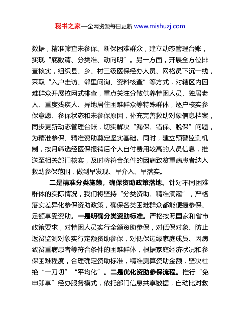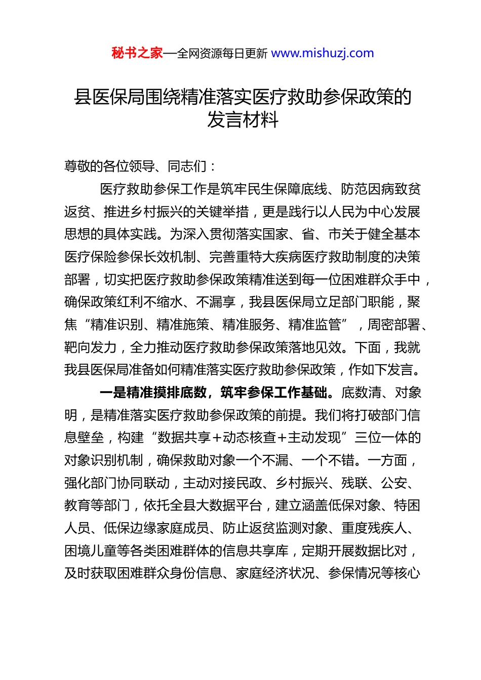 秘书之家—全网资源每日更新 www.mishuzj.com县医保局围绕精准落实医疗救助参保政策的发言材料尊敬的各位领导、同志们:医疗救助参保工作是筑牢民生保障底线、防范因病致贫返贫、推进乡村振兴的关键举措,更是践行以人民为中心发展思想的具体实践。为深入贯彻落实国家、省、市关于健全基本医疗保险参保长效机制、完善重特大疾病医疗救助制度的决策部署,切实把医疗救助参保政策精准送到每一位困难群众手中,确保政策红利不缩水、不漏享,我县医保局立足部门职能,聚焦“精准识别、精准施策、精准服务、精准监管”,周密部署、靶向发力,全力推动医疗救助参保政策落地见效。下面,我就我县医保局准备如何精准落实医疗救助参保政策,作如下发言。一是精准摸排底数,筑牢参保工作基础。底数清、对象明,是精准落实医疗救助参保政策的前提。我们将打破部门信息壁垒,构建“数据共享+动态核查+主动发现”三位一体的对象识别机制,确保救助对象一个不漏、一个不错。一方面,强化部门协同联动,主动对接民政、乡村振兴、残联、公安、教育等部门,依托全县大数据平台,建立涵盖低保对象、特困人员、低保边缘家庭成员、防止返贫监测对象、重度残疾人、困境儿童等各类困难群体的信息共享库,定期开展数据比对,及时获取困难群众身份信息、家庭经济状况、参保情况等核心秘书之家—全网资源每日更新 www.mishuzj.com数据,精准筛查未参保、断保困难群众,建立动态管理台账,实现“底数清、分类准、动向明”。另一方面,开展全方位排查核实,组织县、乡、村三级医保经办人员、网格员下沉一线,采取“入户走访、邻里问询、资料核查”等方式,对辖区内困难群众开展拉网式排查,重点关注分散供养特困人员、独居老人、重度残疾人、异地居住困难群众等特殊群体,逐户核实参保意愿、参保状态和未参保原因,补充完善救助对象信息档案,同步更新动态管理台账,切实解决“漏保、错保、脱保”问题,为精准参保、精准资助奠定坚实基础。同时,建立预警监测机制,按月筛选经医保报销后个人自付费用较高的人员信息,推送至相关部门核实,及时将符合条件的因病致贫重病患者纳入救助参保范围,做到早发现、早介入、早落实。二是精准分类施策,确保资助政策落地。针对不同困难群体的实际情况,我们将坚持“分类资助、精准滴灌”,严格落实差异化参保资助政策,确保各类困难群众都能便捷参保、足额享受资助。一是明确分类资助标准。严格按照国家和省市政策要求,对特困人员实行全额资助参保,对低保对象、防止返贫监测对象实行定额资助参保,对低保边缘家庭成员、因病致贫重病患者等符合条件的困难群体,根据家庭经济状况和参保困难程度,合理确定资助标准,精准测算资助金额,坚决杜绝“一刀切”“平均化”。二是优化资助参保流程。推行“免申即享”经办服务模式,依托部门信息共享数据,自动比对救秘书之家—全网资源每日更新 www.mishuzj.com助对象身份和参保信息,无需困难群众主动申请,由医保部门联合相关部门自动核算资助金额、办理参保手续,实现“数据多跑路、群众少跑腿”。对未实现“免申即享”的特殊困难群众,简化参保登记和资助申请流程,实行“一窗受理、内部流转、限时办结”,推行帮办代办服务,由网格员、医保专员协助收集材料、提交申请,确保资助政策快速落实。三是破解参保难点堵点。针对异地居住困难群众,主动对接异地医保部门,协助办理异地参保登记和资助手续,确保其及时参保;针对行动不便的特殊群体,开展“上门服务”,现场办理参保登记、信息核对和资助申请,切实解决“参保难、跑路远”问题;针对部分困难群众参保意愿不强的问题,安排专人一对一解读政策,讲清参保好处、资助标准和报销流程,引导困难群众主动参保、自愿参保。同时,落实追溯救助政策,对新认定的救助对象,及时追溯落实参保资助,确保政策衔接无缝隙、待遇享受不中断。三是精准宣传引导,提升政策知晓水平。政策知晓率是政策落实的关键,我们将构建“全方位、多层次、接地气”的宣传体系,精准推送医疗救助参保政策,确保政策家喻户晓、深入人心。一是聚焦宣传重点。围绕参保范围、资助标准、参保流程、报销...