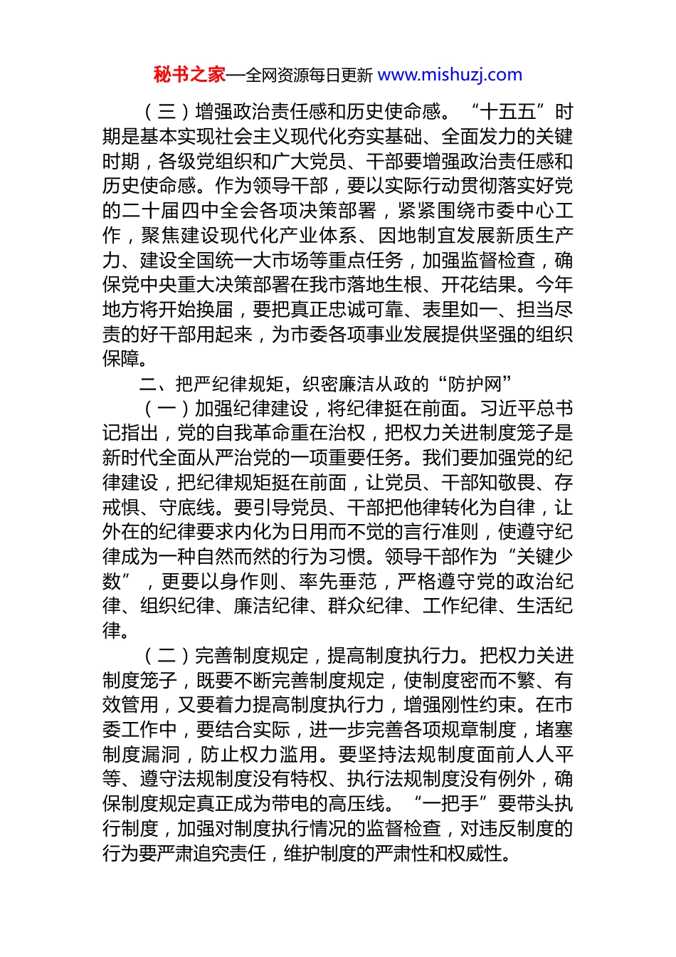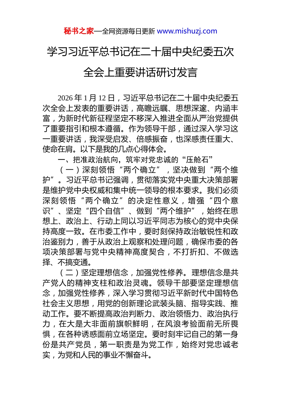 秘书之家—全网资源每日更新 www.mishuzj.com学习习近平总书记在二十届中央纪委五次全会上重要讲话研讨发言2026 年 1 月 12 日,习近平总书记在二十届中央纪委五次全会上发表的重要讲话,高瞻远瞩、思想深邃、内涵丰富,为新时代新征程坚定不移深入推进全面从严治党提供了重要指引和根本遵循。作为领导干部,通过深入学习这一重要讲话,我深受启发、倍感振奋,也深感责任重大、使命在肩。以下是我的几点心得体会。一、把准政治航向,筑牢对党忠诚的“压舱石”(一)深刻领悟“两个确立”,坚决做到“两个维护”。习近平总书记强调,贯彻落实党中央重大决策部署是维护党中央权威和集中统一领导的根本要求。我们必须深刻领悟“两个确立”的决定性意义,增强“四个意识”、坚定“四个自信”、做到“两个维护”,始终在思想上、政治上、行动上同以习近平同志为核心的党中央保持高度一致。在市委工作中,要时刻保持政治敏锐性和政治鉴别力,善于从政治上观察和处理问题,确保市委的各项决策部署与党中央精神高度契合,不打折扣、不做选择、不搞变通。(二)坚定理想信念,加强党性修养。理想信念是共产党人的精神支柱和政治灵魂。领导干部要坚定理想信念,加强党性修养,深入学习贯彻习近平新时代中国特色社会主义思想,用党的创新理论武装头脑、指导实践、推动工作。要不断提高政治判断力、政治领悟力、政治执行力,在大是大非面前旗帜鲜明,在风浪考验面前无所畏惧,在各种诱惑面前立场坚定。要时刻牢记自己的第一身份是共产党员,第一职责是为党工作,始终对党忠诚老实,为党和人民的事业不懈奋斗。秘书之家—全网资源每日更新 www.mishuzj.com(三)增强政治责任感和历史使命感。“十五五”时期是基本实现社会主义现代化夯实基础、全面发力的关键时期,各级党组织和广大党员、干部要增强政治责任感和历史使命感。作为领导干部,要以实际行动贯彻落实好党的二十届四中全会各项决策部署,紧紧围绕市委中心工作,聚焦建设现代化产业体系、因地制宜发展新质生产力、建设全国统一大市场等重点任务,加强监督检查,确保党中央重大决策部署在我市落地生根、开花结果。今年地方将开始换届,要把真正忠诚可靠、表里如一、担当尽责的好干部用起来,为市委各项事业发展提供坚强的组织保障。二、把严纪律规矩,织密廉洁从政的“防护网”(一)加强纪律建设,将纪律挺在前面。习近平总书记指出,党的自我革命重在治权,把权力关进制度笼子是新时代全面从严治党的一项重要任务。我们要加强党的纪律建设,把纪律规矩挺在前面,让党员、干部知敬畏、存戒惧、守底线。要引导党员、干部把他律转化为自律,让外在的纪律要求内化为日用而不觉的言行准则,使遵守纪律成为一种自然而然的行为习惯。领导干部作为“关键少数”,更要以身作则、率先垂范,严格遵守党的政治纪律、组织纪律、廉洁纪律、群众纪律、工作纪律、生活纪律。(二)完善制度规定,提高制度执行力。把权力关进制度笼子,既要不断完善制度规定,使制度密而不繁、有效管用,又要着力提高制度执行力,增强刚性约束。在市委工作中,要结合实际,进一步完善各项规章制度,堵塞制度漏洞,防止权力滥用。要坚持法规制度面前人人平等、遵守法规制度没有特权、执行法规制度没有例外,确保制度规定真正成为带电的高压线。“一把手”要带头执行制度,加强对制度执行情况的监督检查,对违反制度的行为要严肃追究责任,维护制度的严肃性和权威性。秘书之家—全网资源每日更新 www.mishuzj.com(三)加强法规制度宣传教育。要加强法规制度宣传教育,引导党员、干部懂法纪、明规矩、知敬畏。通过开展形式多样的宣传教育活动,如专题培训、警示教育、案例分析等,提高党员、干部对法规制度的认识和理解,增强他们遵守法规制度的自觉性。要进一步提高党务、政务的透明度,让权力在阳光下运行,接受群众的监督,防止暗箱操作和权力寻租行为的发生。三、把实责任担当,耕好管党治党的“责任田”(一)强化全面从严治党主体责任。习近平总书记要求,强化全面从严治党主体责任和监督责任。领导干部作为管党治党的“关键少数”,要把主体责任扛在肩上,...