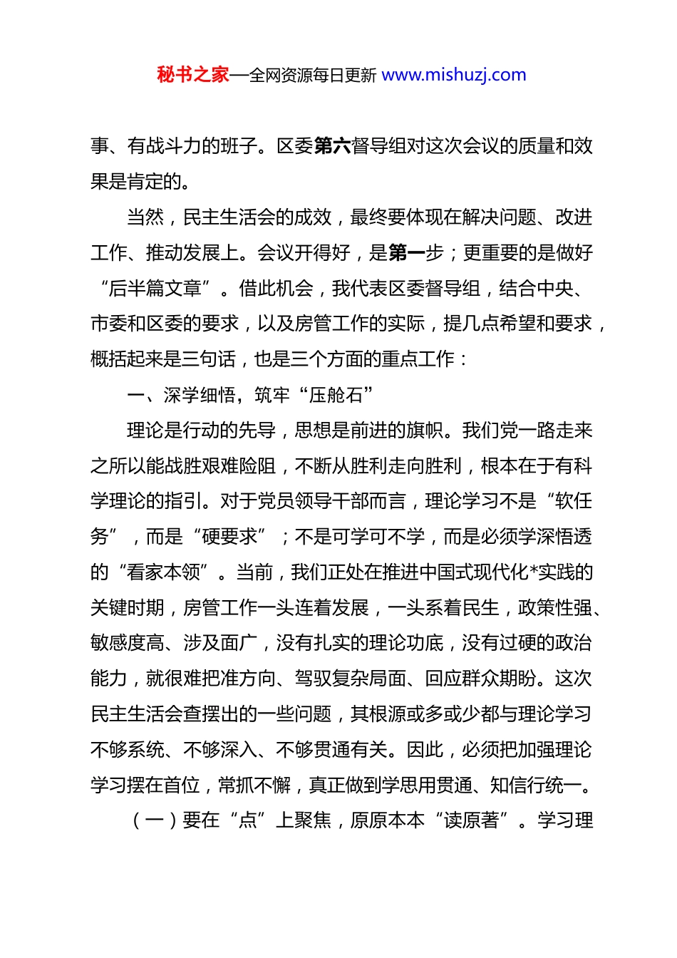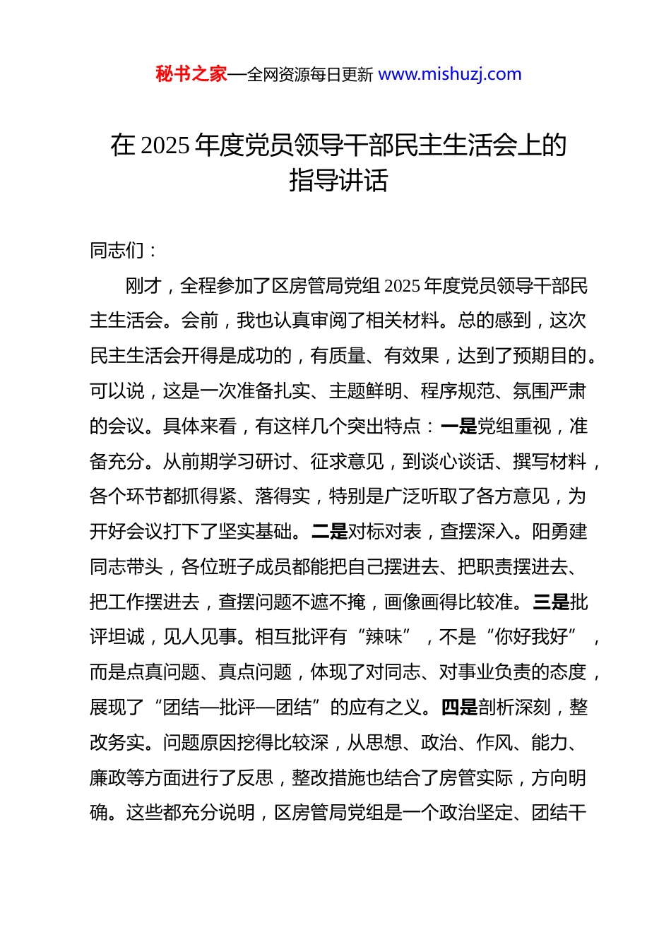 秘书之家—全网资源每日更新 www.mishuzj.com在 2025 年度党员领导干部民主生活会上的指导讲话 同志们:刚才,全程参加了区房管局党组 2025 年度党员领导干部民主生活会。会前,我也认真审阅了相关材料。总的感到,这次民主生活会开得是成功的,有质量、有效果,达到了预期目的。可以说,这是一次准备扎实、主题鲜明、程序规范、氛围严肃的会议。具体来看,有这样几个突出特点:一是党组重视,准备充分。从前期学习研讨、征求意见,到谈心谈话、撰写材料,各个环节都抓得紧、落得实,特别是广泛听取了各方意见,为开好会议打下了坚实基础。二是对标对表,查摆深入。阳勇建同志带头,各位班子成员都能把自己摆进去、把职责摆进去、把工作摆进去,查摆问题不遮不掩,画像画得比较准。三是批评坦诚,见人见事。相互批评有“辣味”,不是“你好我好”,而是点真问题、真点问题,体现了对同志、对事业负责的态度,展现了“团结—批评—团结”的应有之义。四是剖析深刻,整改务实。问题原因挖得比较深,从思想、政治、作风、能力、廉政等方面进行了反思,整改措施也结合了房管实际,方向明确。这些都充分说明,区房管局党组是一个政治坚定、团结干秘书之家—全网资源每日更新 www.mishuzj.com事、有战斗力的班子。区委第六督导组对这次会议的质量和效果是肯定的。当然,民主生活会的成效,最终要体现在解决问题、改进工作、推动发展上。会议开得好,是第一步;更重要的是做好“后半篇文章”。借此机会,我代表区委督导组,结合中央、市委和区委的要求,以及房管工作的实际,提几点希望和要求,概括起来是三句话,也是三个方面的重点工作:一、深学细悟,筑牢“压舱石”理论是行动的先导,思想是前进的旗帜。我们党一路走来之所以能战胜艰难险阻,不断从胜利走向胜利,根本在于有科学理论的指引。对于党员领导干部而言,理论学习不是“软任务”,而是“硬要求”;不是可学可不学,而是必须学深悟透的“看家本领”。当前,我们正处在推进中国式现代化*实践的关键时期,房管工作一头连着发展,一头系着民生,政策性强、敏感度高、涉及面广,没有扎实的理论功底,没有过硬的政治能力,就很难把准方向、驾驭复杂局面、回应群众期盼。这次民主生活会查摆出的一些问题,其根源或多或少都与理论学习不够系统、不够深入、不够贯通有关。因此,必须把加强理论学习摆在首位,常抓不懈,真正做到学思用贯通、知信行统一。(一)要在“点”上聚焦,原原本本“读原著”。学习理秘书之家—全网资源每日更新 www.mishuzj.com论最有效的办法就是读原著、学原文、悟原理。要沉下心来,拿出“挤”和“钻”的精神,逐字逐句学习党的二十大报告、党章、《习近平著作选读》等经典文献,特别是要持续深入学习党的二十届四中全会精神,深刻领会关于坚持和完善中国特色社会主义制度、推进国家治理体系和治理能力现代化的重大部署。对于习近平总书记关于城市工作、住房工作的重要论述和考察上海重要讲话精神,更要反复研读、悉心体悟。不能以听辅导报告、看解读文章代替原汁原味的学习。这就好比吃东西,别人嚼过的馍不香,只有自己亲自咀嚼、消化,才能吸收真正的营养。要防止“泛泛而谈”,满足于“看过了”“学过了”,而要追求“学懂了”“弄通了”,真正掌握贯穿其中的立场、观点、方法。(二)要在“线”上贯通,融会贯通“学思想”。习近平新时代中国特色社会主义思想是一个系统完整、逻辑严密的科学体系,各个部分相互关联、有机统一。学习不能碎片化、孤立化。要把学习党的创新理论同学习马克思主义基本原理贯通起来,同学习党史、新中国史、改革开放史、社会主义发展史贯通起来,同学习市委、区委全会精神贯通起来,同房管领域的具体政策和业务知识贯通起来。比如,思考住房保障政策,不能只看本区的文件,要放到中央关于促进共同富裕、健全社秘书之家—全网资源每日更新 www.mishuzj.com会保障体系的大局中去理解;谋划城市更新项目,不能只算经济账,更要算政治账、民生账、长远账,要深刻领会“人民城市人民建,人民城市为人民”重要理念的深刻内涵。通过贯通学习,看清历史脉络、理论逻辑和...
