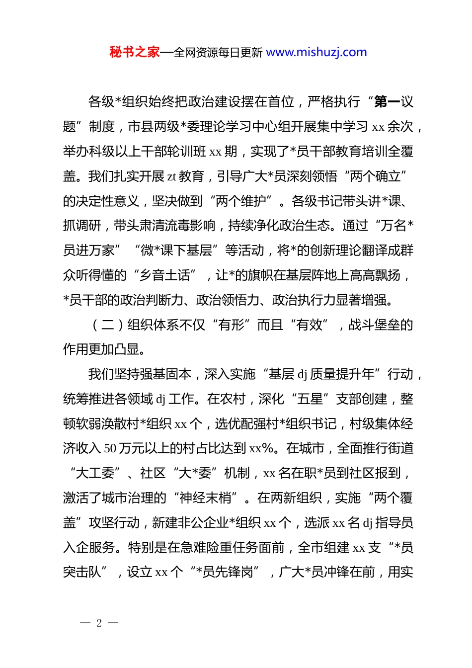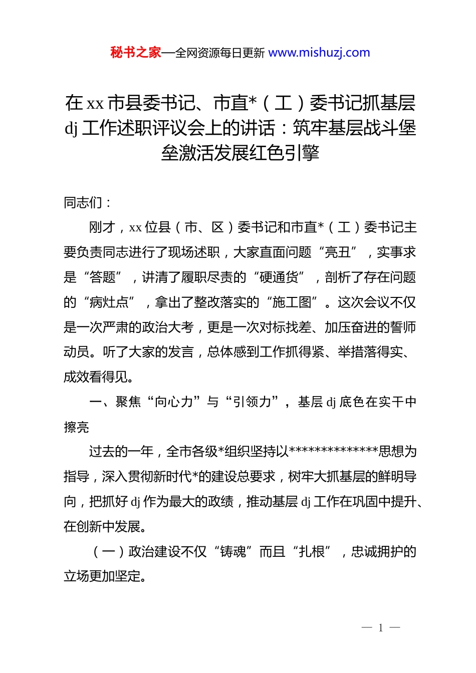 秘书之家—全网资源每日更新 www.mishuzj.com在 xx 市县委书记、市直*(工)委书记抓基层dj 工作述职评议会上的讲话:筑牢基层战斗堡垒激活发展红色引擎同志们:刚才,xx 位县(市、区)委书记和市直*(工)委书记主要负责同志进行了现场述职,大家直面问题“亮丑”,实事求是“答题”,讲清了履职尽责的“硬通货”,剖析了存在问题的“病灶点”,拿出了整改落实的“施工图”。这次会议不仅是一次严肃的政治大考,更是一次对标找差、加压奋进的誓师动员。听了大家的发言,总体感到工作抓得紧、举措落得实、成效看得见。一、聚焦“向心力”与“引领力”,基层 dj 底色在实干中擦亮过去的一年,全市各级*组织坚持以**************思想为指导,深入贯彻新时代*的建设总要求,树牢大抓基层的鲜明导向,把抓好 dj 作为最大的政绩,推动基层 dj 工作在巩固中提升、在创新中发展。(一)政治建设不仅“铸魂”而且“扎根”,忠诚拥护的立场更加坚定。— 1 —秘书之家—全网资源每日更新 www.mishuzj.com各级*组织始终把政治建设摆在首位,严格执行“第一议题”制度,市县两级*委理论学习中心组开展集中学习 xx 余次,举办科级以上干部轮训班 xx 期,实现了*员干部教育培训全覆盖。我们扎实开展 zt 教育,引导广大*员深刻领悟“两个确立”的决定性意义,坚决做到“两个维护”。各级书记带头讲*课、抓调研,带头肃清流毒影响,持续净化政治生态。通过“万名*员进万家”“微*课下基层”等活动,将*的创新理论翻译成群众听得懂的“乡音土话”,让*的旗帜在基层阵地上高高飘扬,*员干部的政治判断力、政治领悟力、政治执行力显著增强。(二)组织体系不仅“有形”而且“有效”,战斗堡垒的作用更加凸显。我们坚持强基固本,深入实施“基层 dj 质量提升年”行动,统筹推进各领域 dj 工作。在农村,深化“五星”支部创建,整顿软弱涣散村*组织 xx 个,选优配强村*组织书记,村级集体经济收入 50 万元以上的村占比达到 xx%。在城市,全面推行街道“大工委”、社区“大*委”机制,xx 名在职*员到社区报到,激活了城市治理的“神经末梢”。在两新组织,实施“两个覆盖”攻坚行动,新建非公企业*组织 xx 个,选派 xx 名 dj 指导员入企服务。特别是在急难险重任务面前,全市组建 xx 支“*员突击队”,设立 xx 个“*员先锋岗”,广大*员冲锋在前,用实— 2 —秘书之家—全网资源每日更新 www.mishuzj.com际行动诠释了“平常时候看得出来、关键时刻站得出来、危急关头豁得出来”。(三)融合发展不仅“赋能”而且“增效”,服务大局的成果更加丰硕。坚持 dj 工作与中心工作同频共振,着力破解“两张皮”问题。我们探索“dj+产业链”模式,在 xx 等重点产业链上建立dj 联盟,通过组织共建、资源共享、难题共解,助推产业集群发展。深入开展“dj+乡村振兴”,推广“支部+合作社+农户”发展路径,带动 xx 万户农民增收致富。深化“dj+营商环境”,开展机关 dj“双评议”活动,推动行政审批提速 xx%,为企业解决实际困难 xx 余件。特别是在重大项目建设一线,无论是征地拆迁还是招商引资,哪里有困难,哪里就有*的组织,哪里就有*员干部的身影,真正把 dj 优势转化为发展优势,把dj 活力转化为攻坚动力。二、直面“薄弱点”与“空白点”,短板弱项症结在检视中显现在肯定成绩的同时,我们必须保持清醒头脑。通过平时的调研督导和刚才的述职评议,我也发现我们的工作还存在一些不容忽视的短板和问题,必须引起高度重视。(一)责任传导出现“温差”,抓 dj 的压力存在层层递减— 3 —秘书之家—全网资源每日更新 www.mishuzj.com现象。部分*委(*组)书记“主业”意识仍然不强,口头上重视、行动上忽视,存在“说起来重要、做起来次要、忙起来不要”的现象。有的同志把“抓 dj”等同于“搞活动”,满足于开几次会、发几个文、挂几块牌子,没有真正把 dj 工作融入业务、融入管理。责任落实呈现“上热中温下冷”的态势,市县两级抓得比较紧,但到了乡镇(街道)一级,特别是一些基层支部,压力传导不仅衰减,甚至出现断层。有的班子成员履行“...