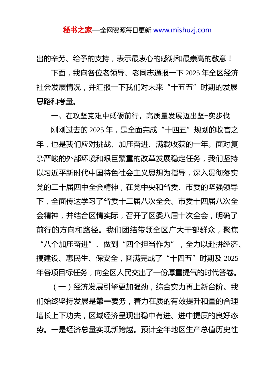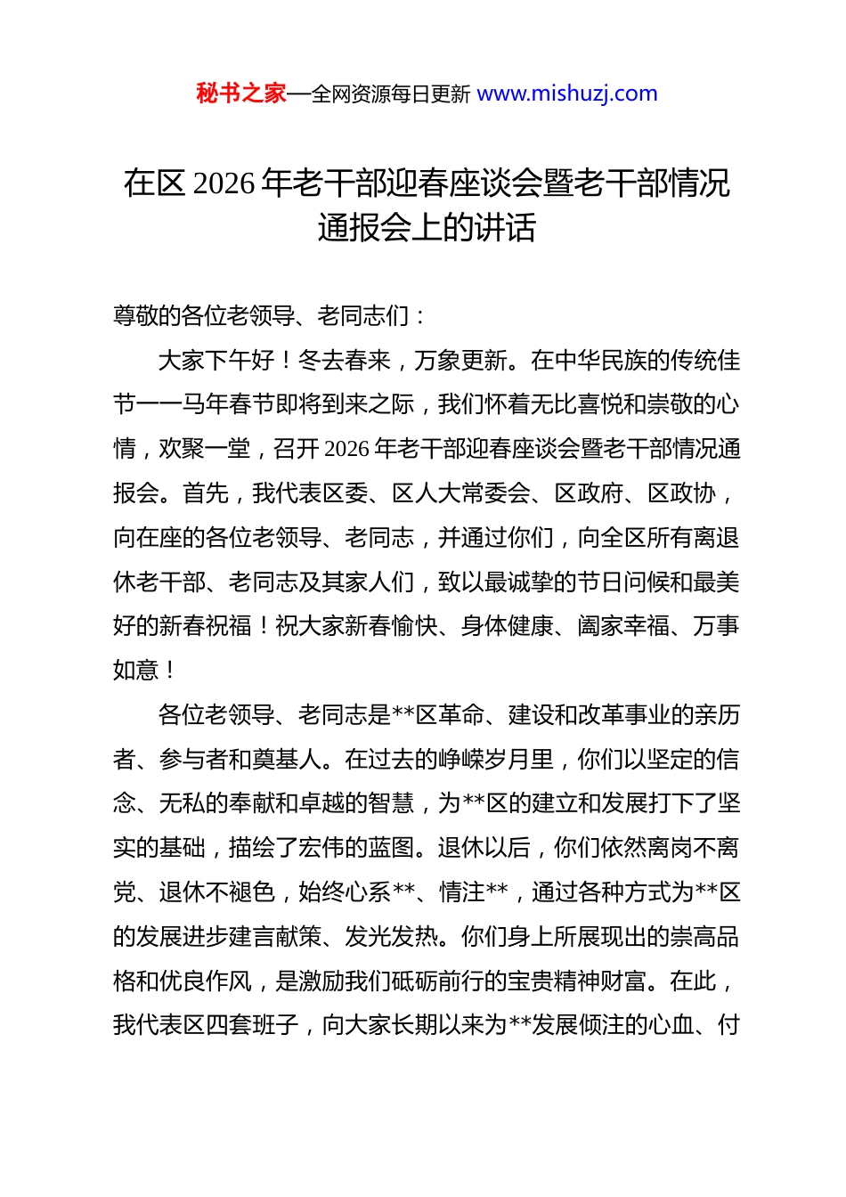 秘书之家—全网资源每日更新 www.mishuzj.com在区 2026 年老干部迎春座谈会暨老干部情况通报会上的讲话 尊敬的各位老领导、老同志们:大家下午好!冬去春来,万象更新。在中华民族的传统佳节一一马年春节即将到来之际,我们怀着无比喜悦和崇敬的心情,欢聚一堂,召开 2026 年老干部迎春座谈会暨老干部情况通报会。首先,我代表区委、区人大常委会、区政府、区政协,向在座的各位老领导、老同志,并通过你们,向全区所有离退休老干部、老同志及其家人们,致以最诚挚的节日问候和最美好的新春祝福!祝大家新春愉快、身体健康、阖家幸福、万事如意!各位老领导、老同志是**区革命、建设和改革事业的亲历者、参与者和奠基人。在过去的峥嵘岁月里,你们以坚定的信念、无私的奉献和卓越的智慧,为**区的建立和发展打下了坚实的基础,描绘了宏伟的蓝图。退休以后,你们依然离岗不离党、退休不褪色,始终心系**、情注**,通过各种方式为**区的发展进步建言献策、发光发热。你们身上所展现出的崇高品格和优良作风,是激励我们砥砺前行的宝贵精神财富。在此,我代表区四套班子,向大家长期以来为**发展倾注的心血、付秘书之家—全网资源每日更新 www.mishuzj.com出的辛劳、给予的支持,表示最衷心的感谢和最崇高的敬意!下面,我向各位老领导、老同志通报一下 2025 年全区经济社会发展情况,并汇报一下我们对未来“十五五”时期的发展思路和考量。一、在攻坚克难中砥砺前行,高质量发展迈出坚-实步伐刚刚过去的 2025 年,是全面完成“十四五”规划的收官之年,也是我们应对挑战、加压奋进、满载收获的一年。面对复杂严峻的外部环境和艰巨繁重的改革发展稳定任务,我们坚持以习近平新时代中国特色社会主义思想为指导,深入贯彻落实党的二十届四中全会精神,在党中央和省委、市委的坚强领导下,全面传达学习了省委十二届八次全会、市委十四届八次全会精神,并结合区情实际,召开了区委八届十次全会,明确了前行的方向和路径。我们团结带领全区广大干部群众,聚焦“八个加压奋进”、做到“四个担当作为”,全力以赴拼经济、搞建设、惠民生、保安全,圆满完成了“十四五”时期及 2025年各项目标任务,向全区人民交出了一份厚重提气的时代答卷。(一)经济发展引擎更加强劲,综合实力再上新台阶。我们始终坚持发展是第一要务,着力在质的有效提升和量的合理增长上下功夫,区域经济呈现出稳中有进、进中提质的良好态势。一是经济总量实现新跨越。预计全年地区生产总值历史性秘书之家—全网资源每日更新 www.mishuzj.com突破 2000 亿元大关,同比增长 6.5%;社会消费品零售总额实现 1850 亿元,持续保持在全市的领先地位;地方一般公共预算收入达到 150 亿元,为区域高质量发展提供了坚实财力保障。这些关键指标的稳步增长,充分彰显了**经济的强大韧性和巨大潜力。二是项目投资积蓄新动能。我们牢固树立“项目为王”的理念,全年固定资产投资完成超过 800 亿元,其中,多个投资额超百亿的重点攻坚项目取得了实质性进展,例如**国际金融中心项目主体结构全面封顶,**未来科技产业园一期建成投运,为我区未来的产业升级和城市发展注入了强劲动力。三是产业结构优化取得新成效。我们坚持以现代服务业为主导,大力发展总部经济、平台经济,全年新增世界 500 强企业区域总部 3 家,引进高能级首店超过 80 家,现代商贸业的辐射力和引领力进一步增强。同时,战略性新兴产业和未来产业的布局也在加速推进,为经济的可持续发展奠定了坚实基础。(二)民生福祉保障更加有力,幸福成色得到新提升。我们始终坚持以人民为中心的发展思想,将财政支出的 70%以上用于民生领域,深入推进幸福美好生活十大工程,用心用情用力解决好群众的急难愁盼问题,让发展成果更多更公平惠及全区人民。一是公共服务供给持续优化。我们在“高品质公共服务倍增工程”上持续发力,全年新建、改扩建中小学、幼儿园秘书之家—全网资源每日更新 www.mishuzj.com15 所,新增优质学位超过 1 万个;成功创建了 3 家社区智慧医院,家庭医生签约服务覆盖率超过 65%,群众在家门口就能享受到优质的教育...