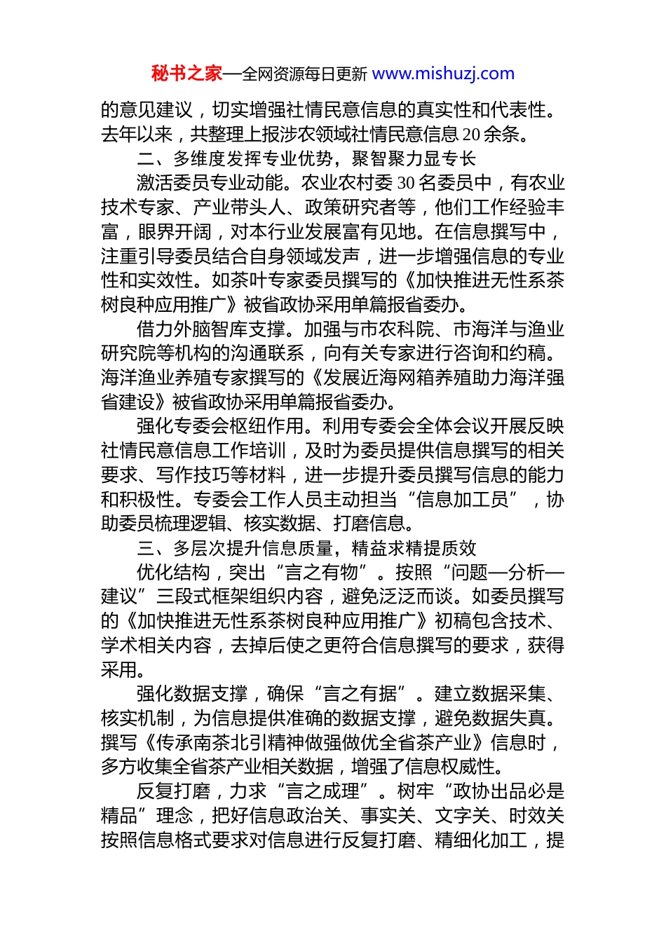 秘书之家—全网资源每日更新 www.mishuzj.com深耕“三农”沃土 奏响社情民意强音——在全市政协反映社情民意信息工作座谈会上的发言去年以来,农业农村委深入学习贯彻省政协和市政协关于做好反映社情民意信息工作部署要求,紧扣“三农”领域热点难点问题,在信息选题、专业支撑、加工提炼等方面积极探索,共编写并上报省政协信息 26 篇,省政协采用单篇报送省委办公厅 5 篇。一、多渠道挖掘信息选题,广开言路集众智以协商活动为源头聚焦中心大局选题。每年的协商计划紧跟经济社会发展大局,所设议题领导关注度高,每项议题都充分深入调研,收集大量资料和委员的意见建议。注重从开展的专题协商、协商座谈会等履职活动中深挖有分量、有价值的信息,及时将协商成果提升、转化为信息去年根据协商座谈会成果形成的《传承南茶北引精神做强做优全省茶产业》,被省政协采用单篇报省委办。以提案和大会发言为基础延伸挖掘深度选题。注重加强信息工作与提案、大会发言的工作联动,对提案或大会发言中的热点、难点、堵点进行认真分析提炼,将委员的核心观点转化为社情民意信息。从委员提案提炼形成的《深化产学研合作机制促进科技成果转移转化》,从报省政协常委会大会发言提炼形成的《做大做强鲁茶推动县域经济发展》被省政协采用单篇报省委办。以联系界别群众为纽带倾听基层诉求选题。农业界委员依托委员工作室等平台,积极开展“到界别群众中去”实践活动,广泛收集农民群众、农业经营主体、农业企业秘书之家—全网资源每日更新 www.mishuzj.com的意见建议,切实增强社情民意信息的真实性和代表性。去年以来,共整理上报涉农领域社情民意信息 20 余条。二、多维度发挥专业优势,聚智聚力显专长激活委员专业动能。农业农村委 30 名委员中,有农业技术专家、产业带头人、政策研究者等,他们工作经验丰富,眼界开阔,对本行业发展富有见地。在信息撰写中,注重引导委员结合自身领域发声,进一步增强信息的专业性和实效性。如茶叶专家委员撰写的《加快推进无性系茶树良种应用推广》被省政协采用单篇报省委办。借力外脑智库支撑。加强与市农科院、市海洋与渔业研究院等机构的沟通联系,向有关专家进行咨询和约稿。海洋渔业养殖专家撰写的《发展近海网箱养殖助力海洋强省建设》被省政协采用单篇报省委办。强化专委会枢纽作用。利用专委会全体会议开展反映社情民意信息工作培训,及时为委员提供信息撰写的相关要求、写作技巧等材料,进一步提升委员撰写信息的能力和积极性。专委会工作人员主动担当“信息加工员”,协助委员梳理逻辑、核实数据、打磨信息。三、多层次提升信息质量,精益求精提质效优化结构,突出“言之有物”。按照“问题—分析—建议”三段式框架组织内容,避免泛泛而谈。如委员撰写的《加快推进无性系茶树良种应用推广》初稿包含技术、学术相关内容,去掉后使之更符合信息撰写的要求,获得采用。强化数据支撑,确保“言之有据”。建立数据采集、核实机制,为信息提供准确的数据支撑,避免数据失真。撰写《传承南茶北引精神做强做优全省茶产业》信息时,多方收集全省茶产业相关数据,增强了信息权威性。反复打磨,力求“言之成理”。树牢“政协出品必是精品”理念,把好信息政治关、事实关、文字关、时效关按照信息格式要求对信息进行反复打磨、精细化加工,提秘书之家—全网资源每日更新 www.mishuzj.com升信息采用率。