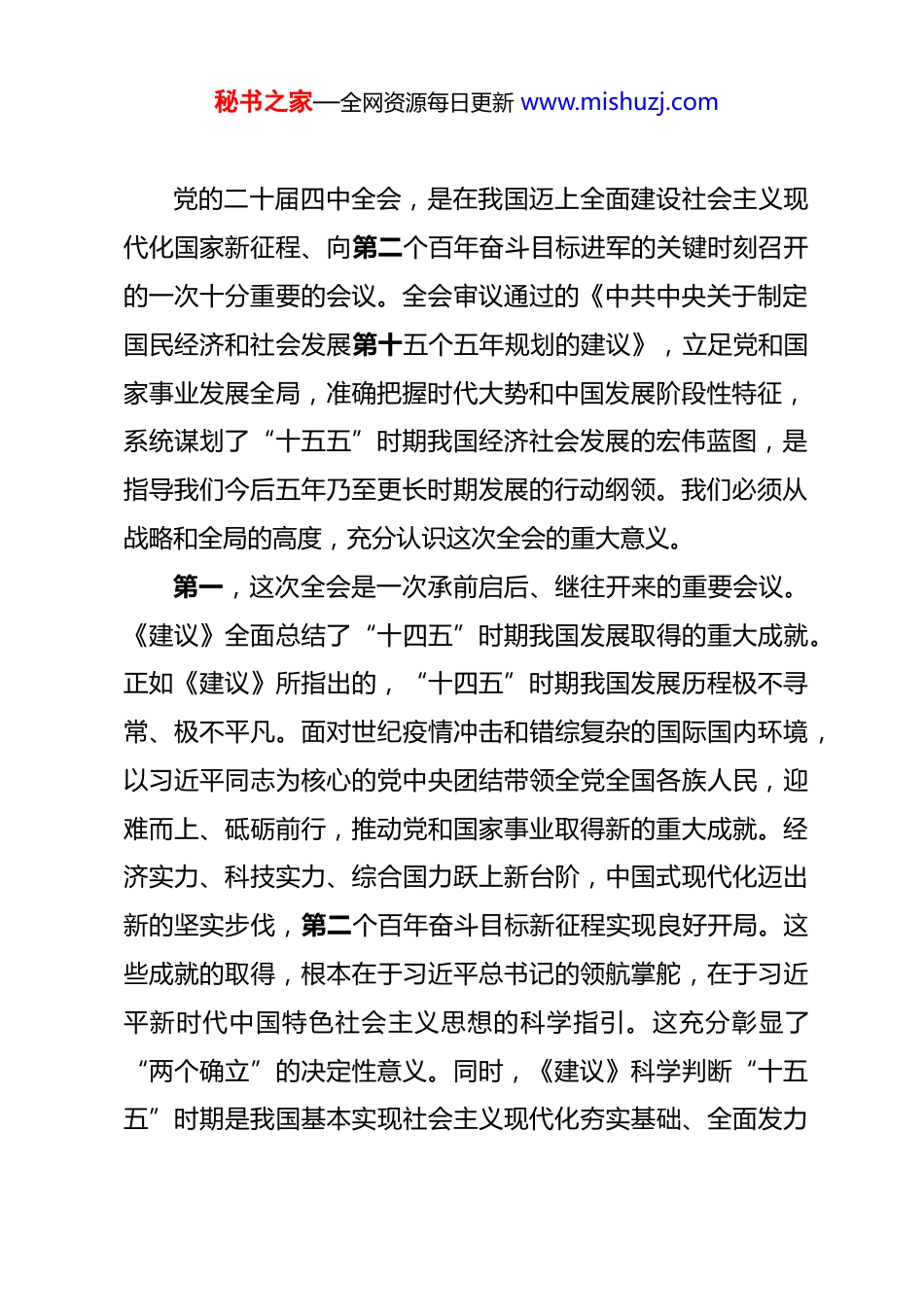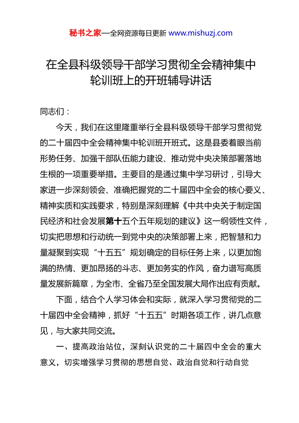 秘书之家—全网资源每日更新 www.mishuzj.com在全县科级领导干部学习贯彻全会精神集中轮训班上的开班辅导讲话 同志们:今天,我们在这里隆重举行全县科级领导干部学习贯彻党的二十届四中全会精神集中轮训班开班式。这是县委着眼当前形势任务、加强干部队伍能力建设、推动党中央决策部署落地生根的一项重要举措。主要目的是通过集中学习研讨,引导大家进一步深刻领会、准确把握党的二十届四中全会的核心要义、精神实质和实践要求,特别是深刻理解《中共中央关于制定国民经济和社会发展第十五个五年规划的建议》这一纲领性文件,切实把思想和行动统一到党中央的决策部署上来,把智慧和力量凝聚到实现“十五五”规划确定的目标任务上来,以更加饱满的热情、更加昂扬的斗志、更加务实的作风,奋力谱写高质量发展新篇章,为全市、全省乃至全国发展大局作出应有贡献。下面,结合个人学习体会和实际,就深入学习贯彻党的二十届四中全会精神,抓好“十五五”时期各项工作,讲几点意见,与大家共同交流。一、提高政治站位,深刻认识党的二十届四中全会的重大意义,切实增强学习贯彻的思想自觉、政治自觉和行动自觉秘书之家—全网资源每日更新 www.mishuzj.com党的二十届四中全会,是在我国迈上全面建设社会主义现代化国家新征程、向第二个百年奋斗目标进军的关键时刻召开的一次十分重要的会议。全会审议通过的《中共中央关于制定国民经济和社会发展第十五个五年规划的建议》,立足党和国家事业发展全局,准确把握时代大势和中国发展阶段性特征,系统谋划了“十五五”时期我国经济社会发展的宏伟蓝图,是指导我们今后五年乃至更长时期发展的行动纲领。我们必须从战略和全局的高度,充分认识这次全会的重大意义。第一,这次全会是一次承前启后、继往开来的重要会议。《建议》全面总结了“十四五”时期我国发展取得的重大成就。正如《建议》所指出的,“十四五”时期我国发展历程极不寻常、极不平凡。面对世纪疫情冲击和错综复杂的国际国内环境,以习近平同志为核心的党中央团结带领全党全国各族人民,迎难而上、砥砺前行,推动党和国家事业取得新的重大成就。经济实力、科技实力、综合国力跃上新台阶,中国式现代化迈出新的坚实步伐,第二个百年奋斗目标新征程实现良好开局。这些成就的取得,根本在于习近平总书记的领航掌舵,在于习近平新时代中国特色社会主义思想的科学指引。这充分彰显了“两个确立”的决定性意义。同时,《建议》科学判断“十五五”时期是我国基本实现社会主义现代化夯实基础、全面发力秘书之家—全网资源每日更新 www.mishuzj.com的关键时期,深刻分析了我们面临的战略机遇和风险挑战,明确了“十五五”时期经济社会发展的指导思想、必须遵循的原则和主要目标。这为我们立足新起点、开启新征程指明了前进方向、提供了根本遵循。我们要深刻认识到,“十五五”时期是**发展至关重要的五年,能否抓住机遇、应对挑战,能否在新的历史起点上实现更大发展,直接关系到我们能否为 2035 年基本实现社会主义现代化奠定坚实基础。全县各级领导干部必须增强历史使命感和责任感,切实把学习贯彻全会精神作为当前和今后一个时期的重大政治任务抓紧抓实。第二,这次全会是一次擘画蓝图、指引方向的战略部署。《建议》紧紧围绕以中国式现代化全面推进中华民族伟大复兴这一中心任务,对“十五五”时期经济社会发展作出了全面系统部署。从建设现代化产业体系到加快高水平科技自立自强,从建设强大国内市场到构建高水平社会主义市场经济体制,从扩大高水平对外开放到加快农业农村现代化,从优化区域经济布局到激发文化创新活力,从保障改善民生到建设美丽中国,从统筹发展和安全到推进国防军队现代化,涵盖了经济社会发展的方方面面。这些部署既有宏观战略指引,又有具体任务要求;既体现了对发展规律的深刻把握,又回应了人民群众的新期待;既坚持了问题导向,补齐短板弱项,又突出了优势再造,秘书之家—全网资源每日更新 www.mishuzj.com塑造新动能。我们要深刻领会《建议》所蕴含的战略思维、系统观念和创新精神,自觉把**的发展放在全国、全省、全市大局中去谋划和推进,确保**...