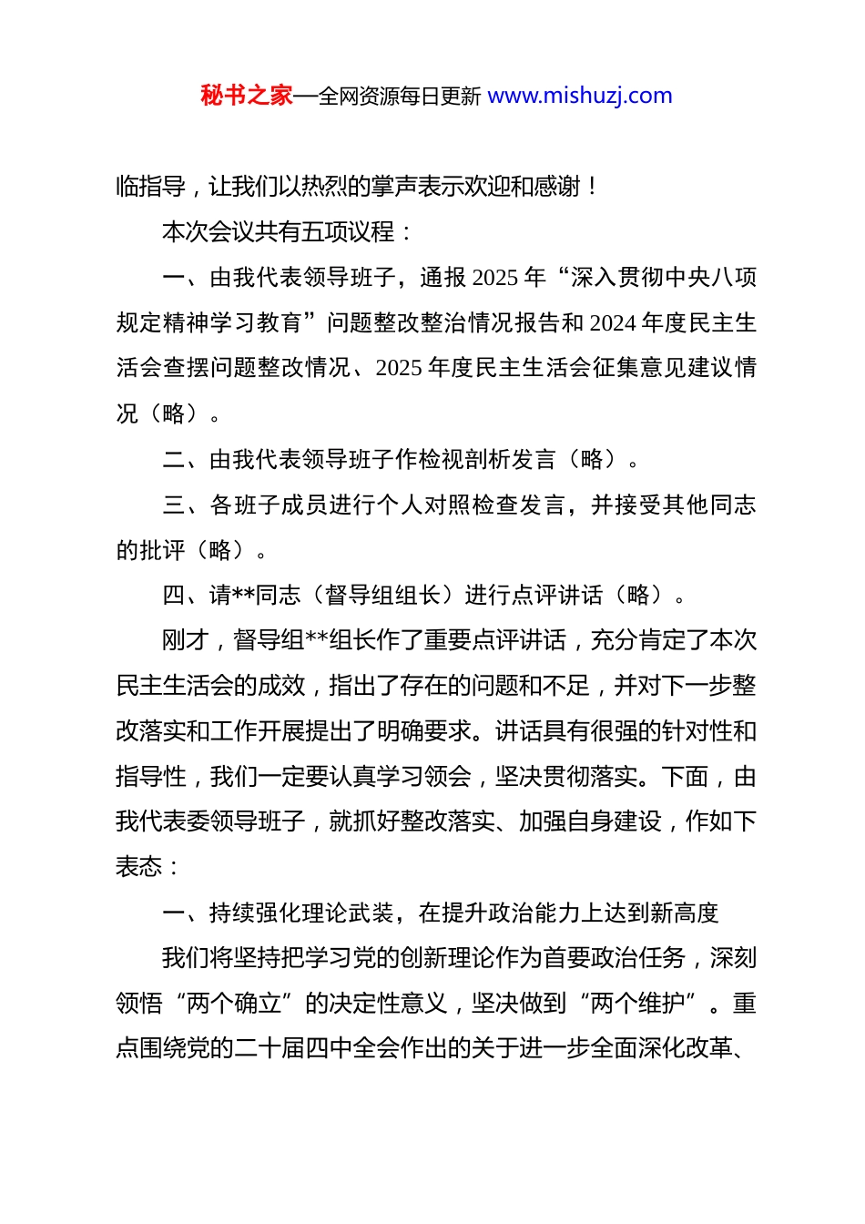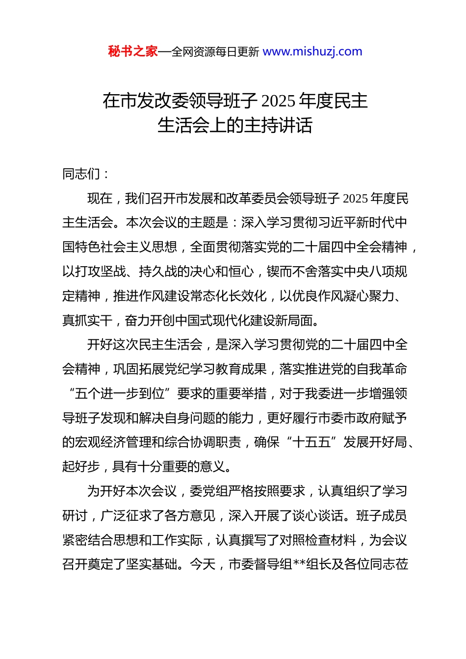秘书之家—全网资源每日更新 www.mishuzj.com在市发改委领导班子 2025 年度民主生活会上的主持讲话 同志们:现在,我们召开市发展和改革委员会领导班子 2025 年度民主生活会。本次会议的主题是:深入学习贯彻习近平新时代中国特色社会主义思想,全面贯彻落实党的二十届四中全会精神,以打攻坚战、持久战的决心和恒心,锲而不舍落实中央八项规定精神,推进作风建设常态化长效化,以优良作风凝心聚力、真抓实干,奋力开创中国式现代化建设新局面。开好这次民主生活会,是深入学习贯彻党的二十届四中全会精神,巩固拓展党纪学习教育成果,落实推进党的自我革命“五个进一步到位”要求的重要举措,对于我委进一步增强领导班子发现和解决自身问题的能力,更好履行市委市政府赋予的宏观经济管理和综合协调职责,确保“十五五”发展开好局、起好步,具有十分重要的意义。为开好本次会议,委党组严格按照要求,认真组织了学习研讨,广泛征求了各方意见,深入开展了谈心谈话。班子成员紧密结合思想和工作实际,认真撰写了对照检查材料,为会议召开奠定了坚实基础。今天,市委督导组**组长及各位同志莅秘书之家—全网资源每日更新 www.mishuzj.com临指导,让我们以热烈的掌声表示欢迎和感谢!本次会议共有五项议程:一、由我代表领导班子,通报 2025 年“深入贯彻中央八项规定精神学习教育”问题整改整治情况报告和 2024 年度民主生活会查摆问题整改情况、2025 年度民主生活会征集意见建议情况(略)。二、由我代表领导班子作检视剖析发言(略)。三、各班子成员进行个人对照检查发言,并接受其他同志的批评(略)。四、请**同志(督导组组长)进行点评讲话(略)。刚才,督导组**组长作了重要点评讲话,充分肯定了本次民主生活会的成效,指出了存在的问题和不足,并对下一步整改落实和工作开展提出了明确要求。讲话具有很强的针对性和指导性,我们一定要认真学习领会,坚决贯彻落实。下面,由我代表委领导班子,就抓好整改落实、加强自身建设,作如下表态:一、持续强化理论武装,在提升政治能力上达到新高度我们将坚持把学习党的创新理论作为首要政治任务,深刻领悟“两个确立”的决定性意义,坚决做到“两个维护”。重点围绕党的二十届四中全会作出的关于进一步全面深化改革、秘书之家—全网资源每日更新 www.mishuzj.com推进中国式现代化的战略部署,结合发展改革工作实际进行深学细悟。我们将自觉运用贯穿其中的立场观点方法,深刻把握新时代新征程赋予发展改革部门的使命任务,不断提高从政治高度谋划推动全市发展战略、规划编制、政策制定、改革设计、投资安排的能力。确保在研判宏观经济形势、制定重大生产力布局、协调跨区域发展战略时,始终保持正确的政治方向,使各项工作部署更好契合党中央战略意图,符合全市发展大局和人民根本利益。二、全力抓好整改落实,在解决突出问题上取得新突破针对本次民主生活会上查摆出的问题、会前征求到的意见建议以及督导组指出的不足,我们将立即牵头制定领导班子的整改方案,并督促每位班子成员完善个人整改清单。整改工作将坚持问题导向,建立台账、明确责任、限定时间、对账销号。特别是要聚焦主责主业,重点整改在贯彻落实国家重大区域战略、推动新旧动能转换、优化固定资产投资结构、深化要素市场化配置改革等关键任务中存在的调研不够深入、统筹不够有力、创新突破不足等问题。我们将发扬钉钉子精神,一项一项抓到位,一件一件落到底,坚决防止说归说、做归做,以实实在在的整改成效,回应干部群众关切,提升领导班子履职尽责的整体效能。秘书之家—全网资源每日更新 www.mishuzj.com三、全面改进工作作风,在提升服务效能上展现新风貌我们将以巩固拓展中央八项规定精神学习教育成果为抓手持续推进作风建设常态化长效化。牢固树立并践行正确政绩观,坚决反对形式主义、官僚主义。班子成员要带头深入基层一线,围绕我市构建现代化产业体系、扩大有效投资、促进城乡区域协调发展、保障和改善民生等重大课题,开展穿透式、蹲点式调研,摸清实情、找准症结、提实对策。要进一步优化项目审批、资金申报等政务服务流程,畅通政企沟...