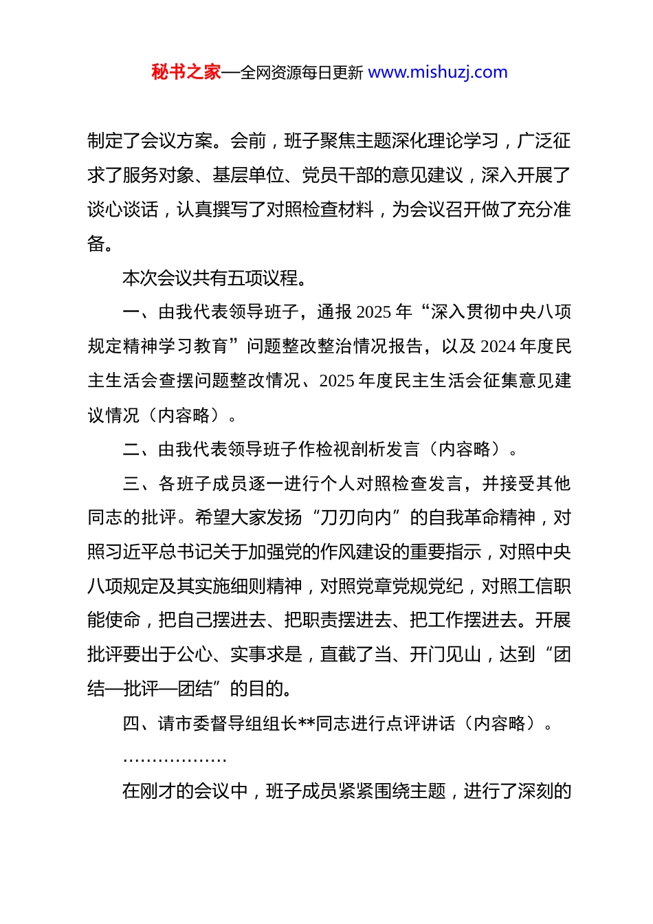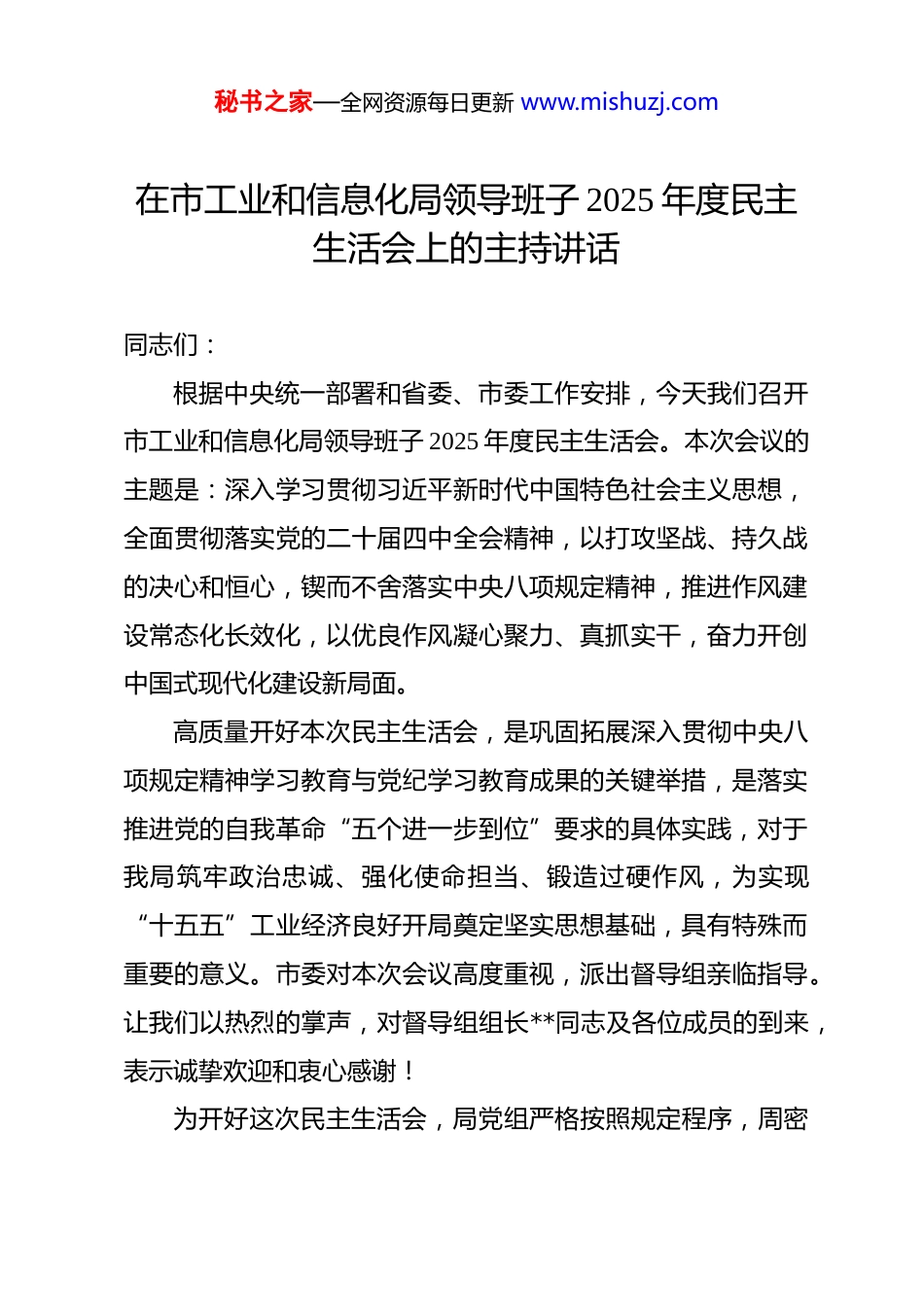 秘书之家—全网资源每日更新 www.mishuzj.com在市工业和信息化局领导班子 2025 年度民主生活会上的主持讲话 同志们:根据中央统一部署和省委、市委工作安排,今天我们召开市工业和信息化局领导班子 2025 年度民主生活会。本次会议的主题是:深入学习贯彻习近平新时代中国特色社会主义思想,全面贯彻落实党的二十届四中全会精神,以打攻坚战、持久战的决心和恒心,锲而不舍落实中央八项规定精神,推进作风建设常态化长效化,以优良作风凝心聚力、真抓实干,奋力开创中国式现代化建设新局面。高质量开好本次民主生活会,是巩固拓展深入贯彻中央八项规定精神学习教育与党纪学习教育成果的关键举措,是落实推进党的自我革命“五个进一步到位”要求的具体实践,对于我局筑牢政治忠诚、强化使命担当、锻造过硬作风,为实现“十五五”工业经济良好开局奠定坚实思想基础,具有特殊而重要的意义。市委对本次会议高度重视,派出督导组亲临指导。让我们以热烈的掌声,对督导组组长**同志及各位成员的到来,表示诚挚欢迎和衷心感谢!为开好这次民主生活会,局党组严格按照规定程序,周密秘书之家—全网资源每日更新 www.mishuzj.com制定了会议方案。会前,班子聚焦主题深化理论学习,广泛征求了服务对象、基层单位、党员干部的意见建议,深入开展了谈心谈话,认真撰写了对照检查材料,为会议召开做了充分准备。本次会议共有五项议程。一、由我代表领导班子,通报 2025 年“深入贯彻中央八项规定精神学习教育”问题整改整治情况报告,以及 2024 年度民主生活会查摆问题整改情况、2025 年度民主生活会征集意见建议情况(内容略)。二、由我代表领导班子作检视剖析发言(内容略)。三、各班子成员逐一进行个人对照检查发言,并接受其他同志的批评。希望大家发扬“刀刃向内”的自我革命精神,对照习近平总书记关于加强党的作风建设的重要指示,对照中央八项规定及其实施细则精神,对照党章党规党纪,对照工信职能使命,把自己摆进去、把职责摆进去、把工作摆进去。开展批评要出于公心、实事求是,直截了当、开门见山,达到“团结—批评—团结”的目的。四、请市委督导组组长**同志进行点评讲话(内容略)。………………在刚才的会议中,班子成员紧紧围绕主题,进行了深刻的秘书之家—全网资源每日更新 www.mishuzj.com自我检查和严肃的相互批评,查摆问题见人见事,剖析根源触及思想,相互批评坦诚中肯,整改方向清晰明确。特别是督导组组长**同志代表市委所作的点评讲话,既肯定了我们前期的准备工作与会议成效,更精准指出了我们存在的差距与不足,并对下一步深化整改、加强班子建设、推动工信事业高质量发展提出了明确要求和殷切期望。讲话政治站位高、指导性强,我们完全赞同、诚恳接受,并将以最坚决的态度、最扎实的举措抓好贯彻落实。“四风”问题具有顽固性、反复性,作风建设永远在路上。习近平总书记强调,必须以打攻坚战、持久战的决心和恒心,锲而不舍落实中央八项规定精神。针对本次民主生活会查摆出的问题、会上收到的批评意见以及督导组提出的要求,局领导班子郑重表态,将从以下四个方面坚决整改、彻底落实:第一,以更高站位筑牢思想根基,在强化理论武装上立标杆、作表率。我们将坚持把学习贯彻党的创新理论作为终身课题,特别是深学细悟习近平总书记关于新型工业化、制造强国、网络强国的重要论述以及对作风建设的最新重要指示精神。严格落实“第一议题”制度,健全理论学习常态化机制,将学习成果转化为坚定不移推进工业经济稳增长、产业结构优化升级、数字经济与实体经济深度融合的政策举措和实际能力。我们将秘书之家—全网资源每日更新 www.mishuzj.com持续加强党性锤炼,教育引导全局党员干部,尤其是新提拔干部、年轻干部和关键岗位干部,深刻认识作风问题的政治本质和政治危害,自觉抵制“工业经济主管部门特殊论”等错误思想,从思想根源上拧紧抵制“四风”的“总开关”,确保工信事业始终沿着正确政治方向前进。第二,以更严要求狠抓问题整改,在推进自我革命上动真格、求实效。我们将坚决扛起整改主体责任,对会上查摆的问题和相互批评意见进行再梳理、...
