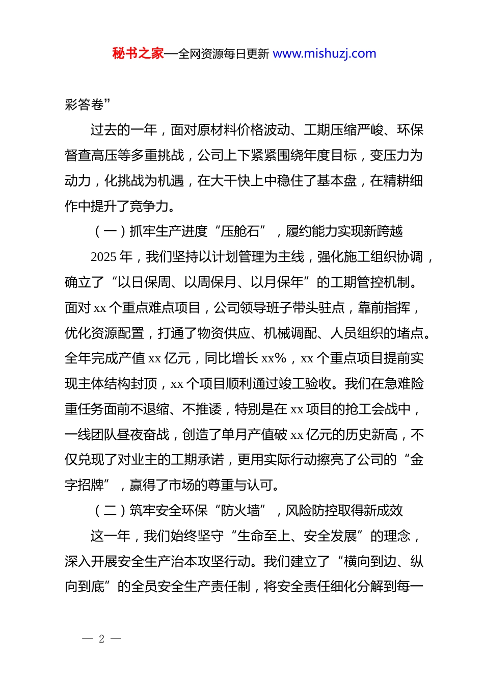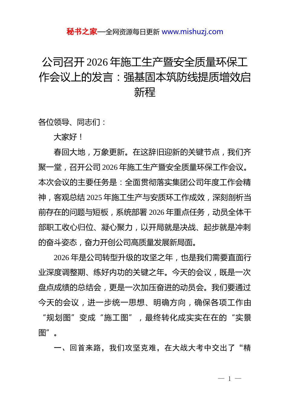 秘书之家—全网资源每日更新 www.mishuzj.com公司召开 2026 年施工生产暨安全质量环保工作会议上的发言:强基固本筑防线提质增效启新程各位领导、同志们:大家好!春回大地,万象更新。在这辞旧迎新的关键节点,我们齐聚一堂,召开公司 2026 年施工生产暨安全质量环保工作会议。本次会议的主要任务是:全面贯彻落实集团公司年度工作会精神,客观总结 2025 年施工生产与安质环工作成效,深刻剖析当前存在的问题与短板,系统部署 2026 年重点任务,动员全体干部职工收心归位、凝心聚力,以开局就是决战、起步就是冲刺的奋斗姿态,奋力开创公司高质量发展新局面。2026 年是公司转型升级的攻坚之年,也是我们需要直面行业深度调整期、练好内功的关键之年。今天的会议,既是一次盘点成绩的总结会,更是一次加压奋进的动员会。我们要通过今天的会议,进一步统一思想、明确方向,确保各项工作由“规划图”变成“施工图”,最终转化成实实在在的“实景图”。一、回首来路,我们攻坚克难,在大战大考中交出了“精— 1 —秘书之家—全网资源每日更新 www.mishuzj.com彩答卷”过去的一年,面对原材料价格波动、工期压缩严峻、环保督查高压等多重挑战,公司上下紧紧围绕年度目标,变压力为动力,化挑战为机遇,在大干快上中稳住了基本盘,在精耕细作中提升了竞争力。(一)抓牢生产进度“压舱石”,履约能力实现新跨越2025 年,我们坚持以计划管理为主线,强化施工组织协调,确立了“以日保周、以周保月、以月保年”的工期管控机制。面对 xx 个重点难点项目,公司领导班子带头驻点,靠前指挥,优化资源配置,打通了物资供应、机械调配、人员组织的堵点。全年完成产值 xx 亿元,同比增长 xx%,xx 个重点项目提前实现主体结构封顶,xx 个项目顺利通过竣工验收。我们在急难险重任务面前不退缩、不推诿,特别是在 xx 项目的抢工会战中,一线团队昼夜奋战,创造了单月产值破 xx 亿元的历史新高,不仅兑现了对业主的工期承诺,更用实际行动擦亮了公司的“金字招牌”,赢得了市场的尊重与认可。(二)筑牢安全环保“防火墙”,风险防控取得新成效这一年,我们始终坚守“生命至上、安全发展”的理念,深入开展安全生产治本攻坚行动。我们建立了“横向到边、纵向到底”的全员安全生产责任制,将安全责任细化分解到每一— 2 —秘书之家—全网资源每日更新 www.mishuzj.com个作业班组、每一名一线工人。全年累计开展安全检查 xx 次,整改隐患 xx 处,整改率达到 xx%,未发生一起重伤及以上生产安全事故。在环保方面,我们严格落实“六个百分百”扬尘治理措施,推广应用降噪除尘新技术,xx 个项目荣获省市级“绿色施工示范工地”称号。可以说,我们用严格的监管和扎实的投入,守住了安全环保的红线底线,为公司的平稳运行构筑了坚不可摧的“铜墙铁壁”。(三)激活质量管理“源动力”,品牌建设迈上新台阶质量是企业的生命,也是我们赢得市场的核心竞争力 。2025 年,我们深入实施“质量强企”战略,全面推行工程质量标准化管理。从原材料进场验收,到关键工序的旁站监督,再到实测实量的严格考核,我们坚持全过程、全方位的质量管控。全年工程一次交验合格率保持在 xx%以上,客户满意度提升至xx%。我们积极开展 qc 小组活动和工法创新,xx 项成果获得国家级和省级 qc 成果奖,xx 项工法被评为省级工法。这些沉甸甸的荣誉,见证了我们对品质的执着追求,也标志着公司从“做完工程”向“做好工程、做优工程”的转变,真正实现了“干一项工程,树一座丰碑”。二、正视差距,我们刀刃向内,在检视剖析中找准了“顽瘴痼疾”— 3 —秘书之家—全网资源每日更新 www.mishuzj.com在肯定成绩的同时,我们必须清醒地看到,与行业先进水平相比,与集团公司的要求相比,我们的工作还存在不少薄弱环节,必须以刮骨疗毒的勇气,直面问题,精准施策。(一)部分项目安全意识存在“两张皮”现象我们在检查中发现,少数项目部“重生产、轻安全”的思想依然根深蒂固,口号喊得震天响,落实起来轻飘飘。有的管理人员对现场违章指挥、违章作业视而不见,当“老好人”,搞“一团...
